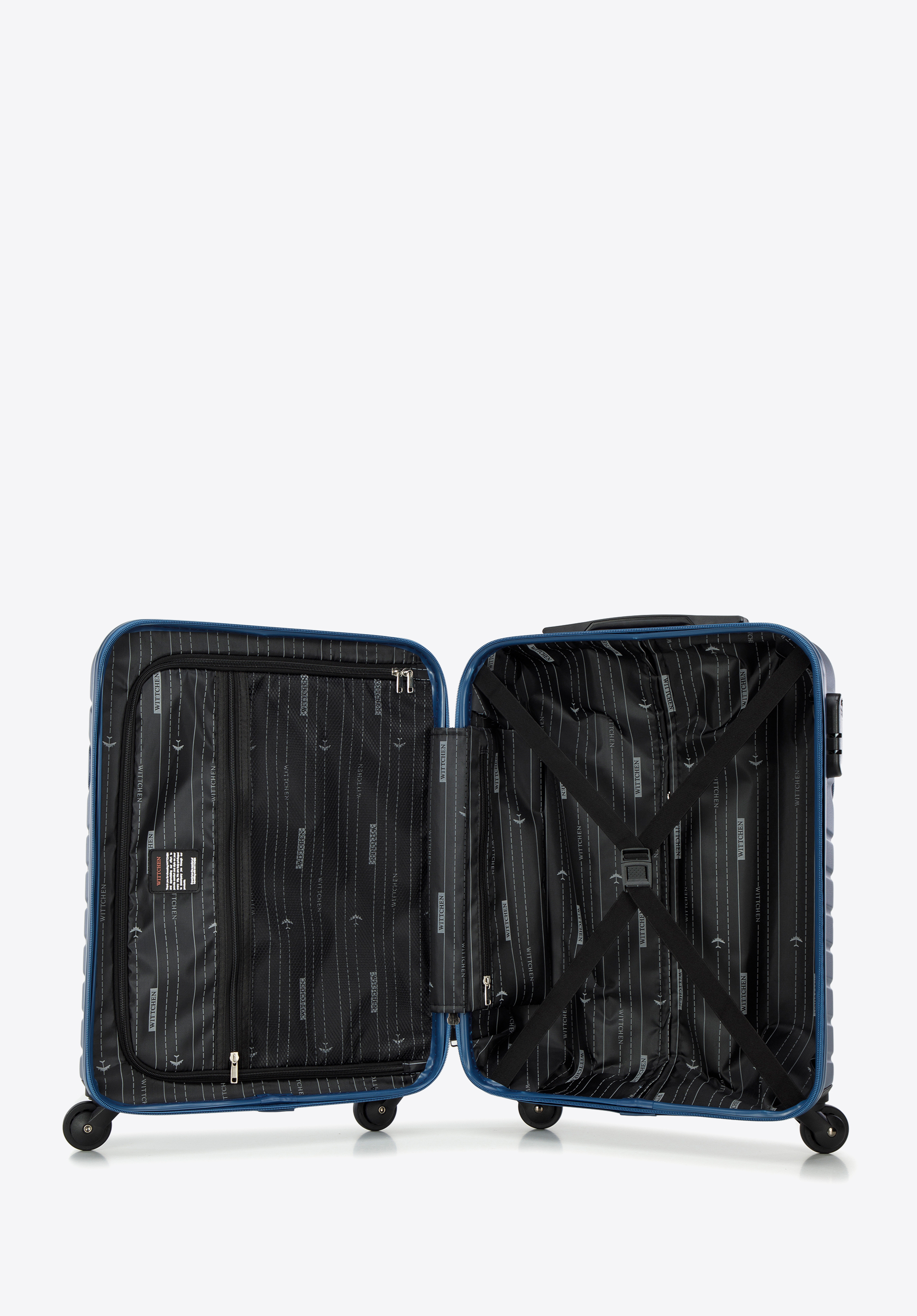 - Vnútorné vrecko kufra: Jedna priehradka s elastickými popruhmi zapínanými na patentný patent, druhá priehradka so zapínaním na zips, sieťované vrecko a malé vnútorné vrecko na zips.