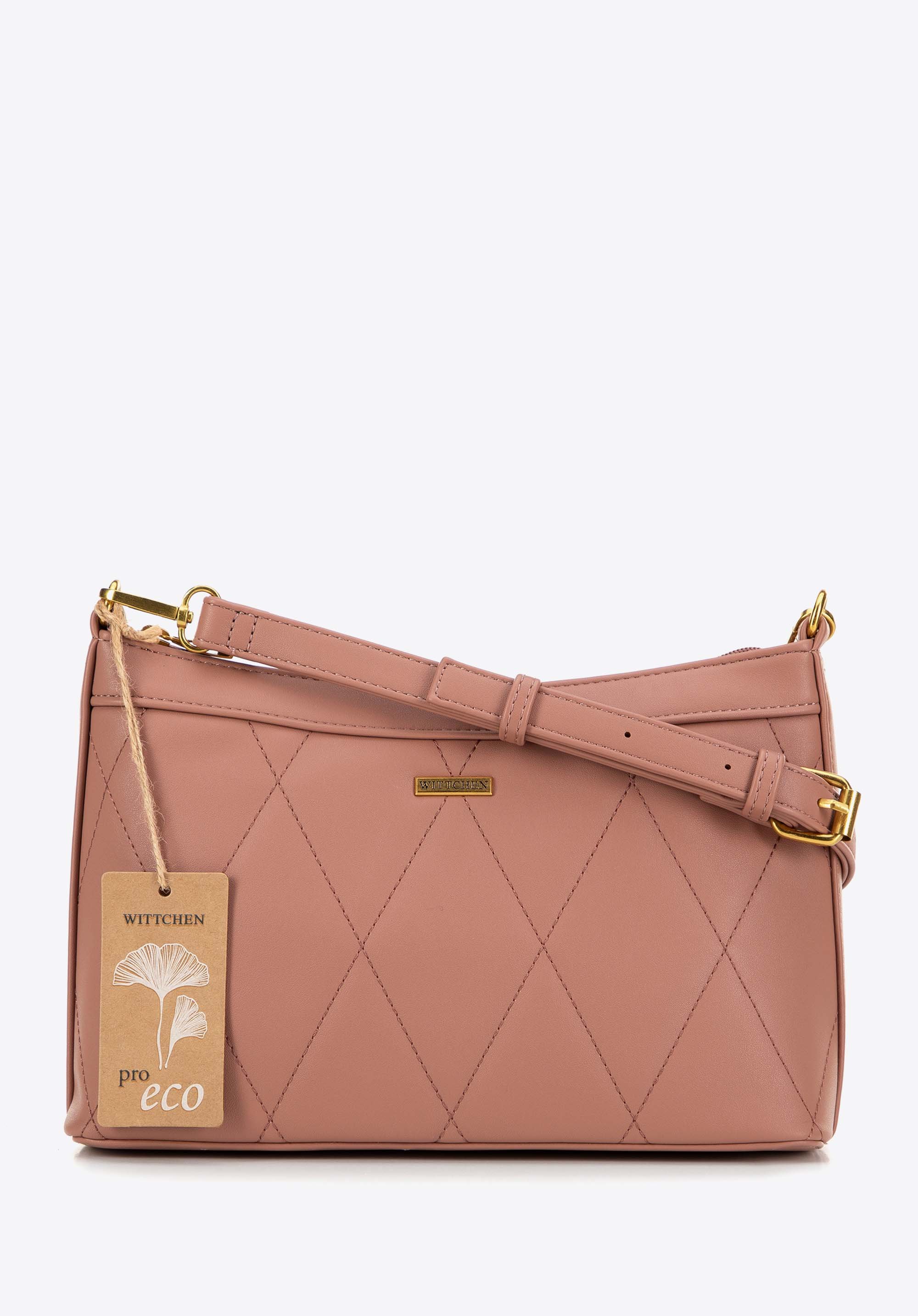 Objavte novú dámsku taškutypu baguette, ktorá kombinuje eleganciu, funkčnosť a starostlivosť o životné prostredie. Tento štýlový model má na prednej strane geometrické prešívanie, ktoré mu poskytuje moderný charakter. Taška patrí k radu pro-eco. Je ušitá z ekokože, ktorá je biologicky rozložiteľná a pri jej výrobe sa spotrebuje výrazne menej vody a energie. S ohľadom na životné prostredie.