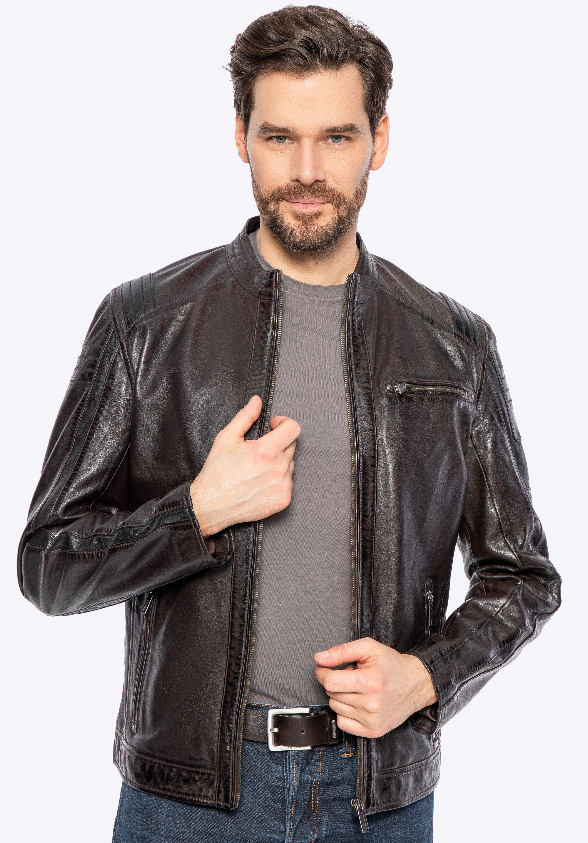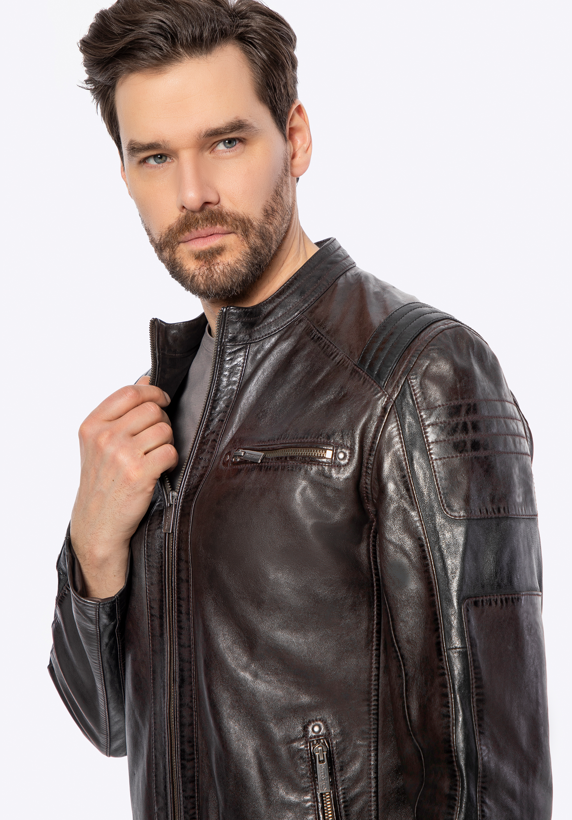 Istota a nezávislosť v každom detaile – táto bunda vyrobená z prírodnej ovčej kože je skutočnou definíciou mužského charakteru. S kovovým logom značky, značkovými zipsami a kontrastným prešívaním , ktoré dodáva odvážny, výrazný vzhľad, dokonale kombinuje klasický strih s modernými akcentmi. Každé vrecko – dve vertikálne vrecká na zips , jedno horizontálne vrecko na hrudi a dve vnútorné vrecká – spája praktickosť s pohodlím, pričom si zachováva elegantný a štýlový nádych, ktorý dopĺňa celkový dizajn bundy.