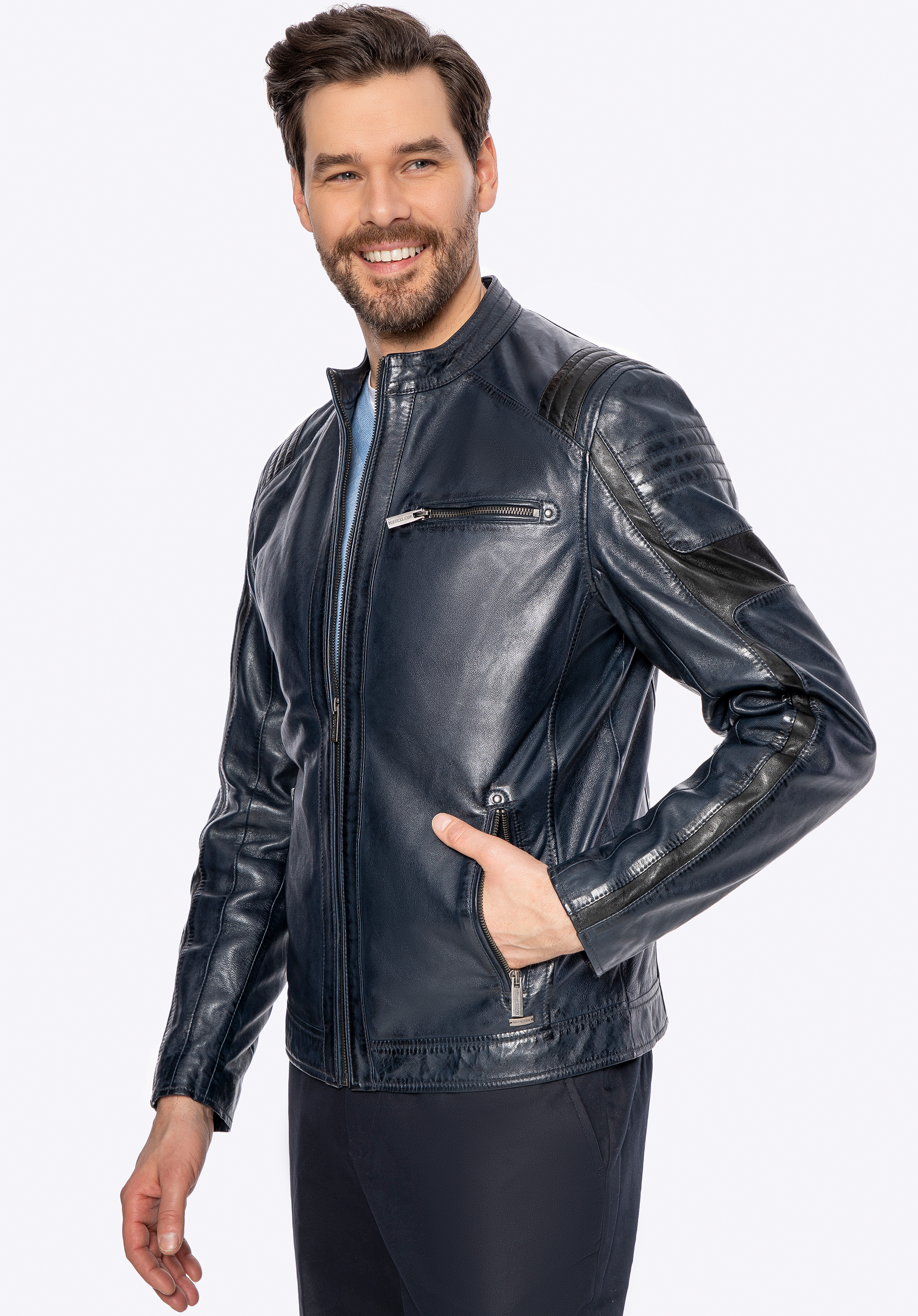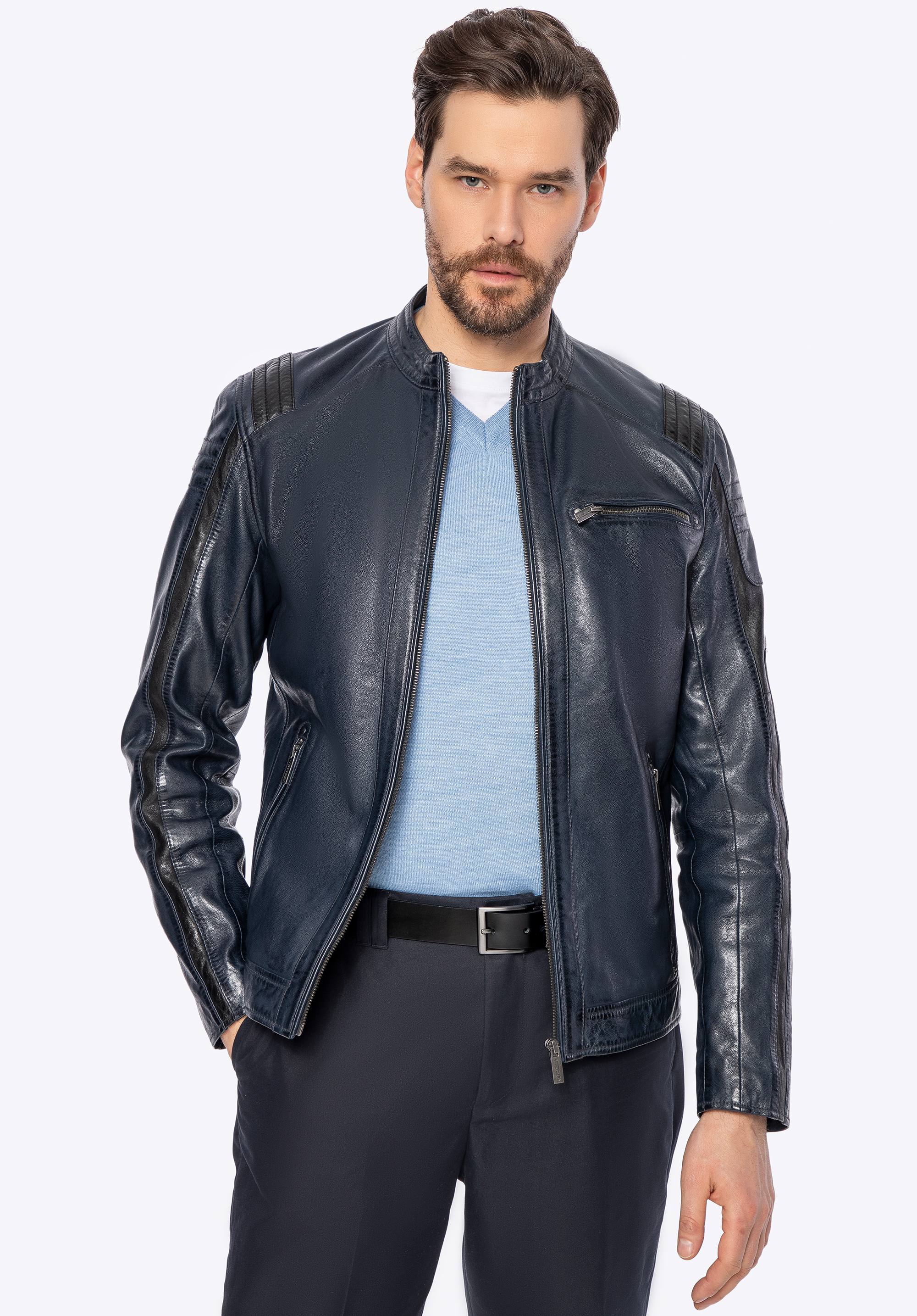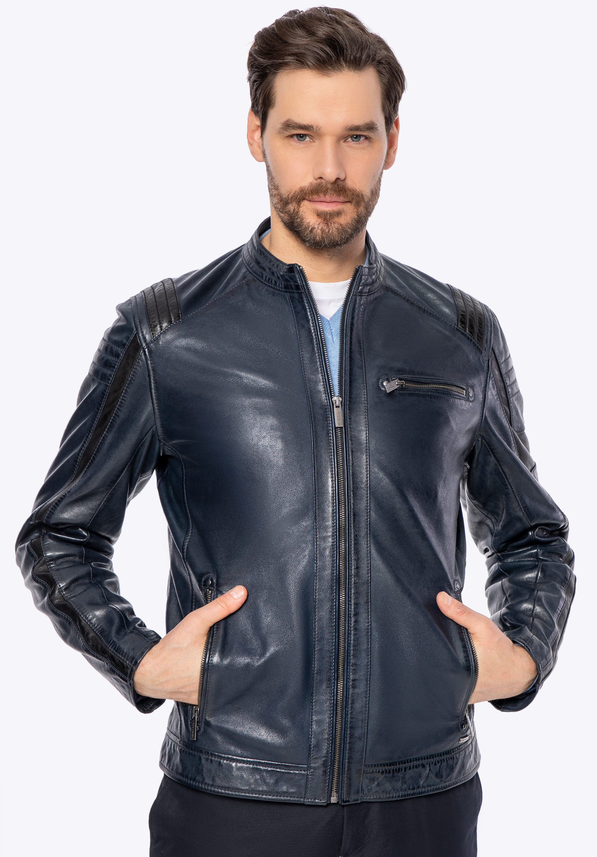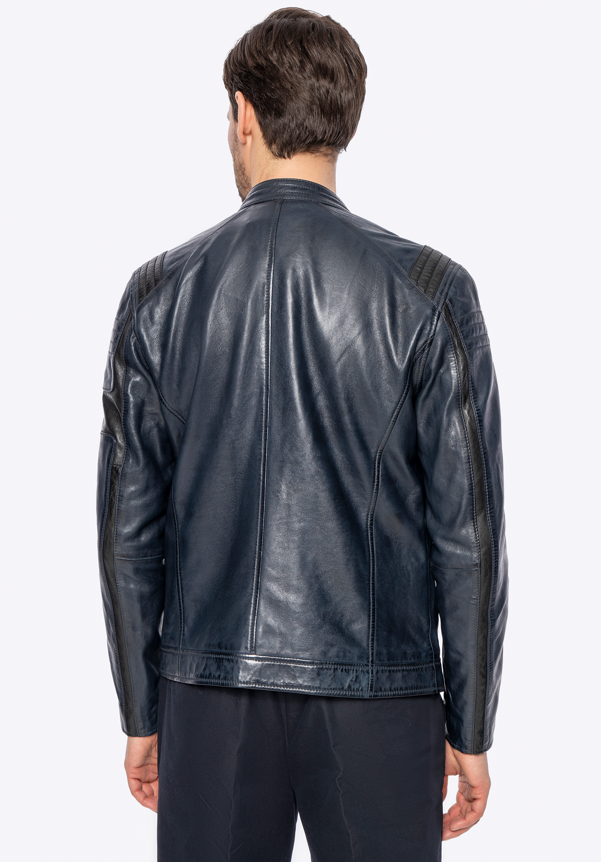 Istota a nezávislosť v každom detaile – táto bunda vyrobená z prírodnej ovčej kože je skutočnou definíciou mužského charakteru. S kovovým logom značky, značkovými zipsami a kontrastným prešívaním , ktoré dodáva odvážny, výrazný vzhľad, dokonale kombinuje klasický strih s modernými akcentmi. Každé vrecko – dve vertikálne vrecká na zips , jedno horizontálne vrecko na hrudi a dve vnútorné vrecká – spája praktickosť s pohodlím, pričom si zachováva elegantný a štýlový nádych, ktorý dopĺňa celkový dizajn bundy.