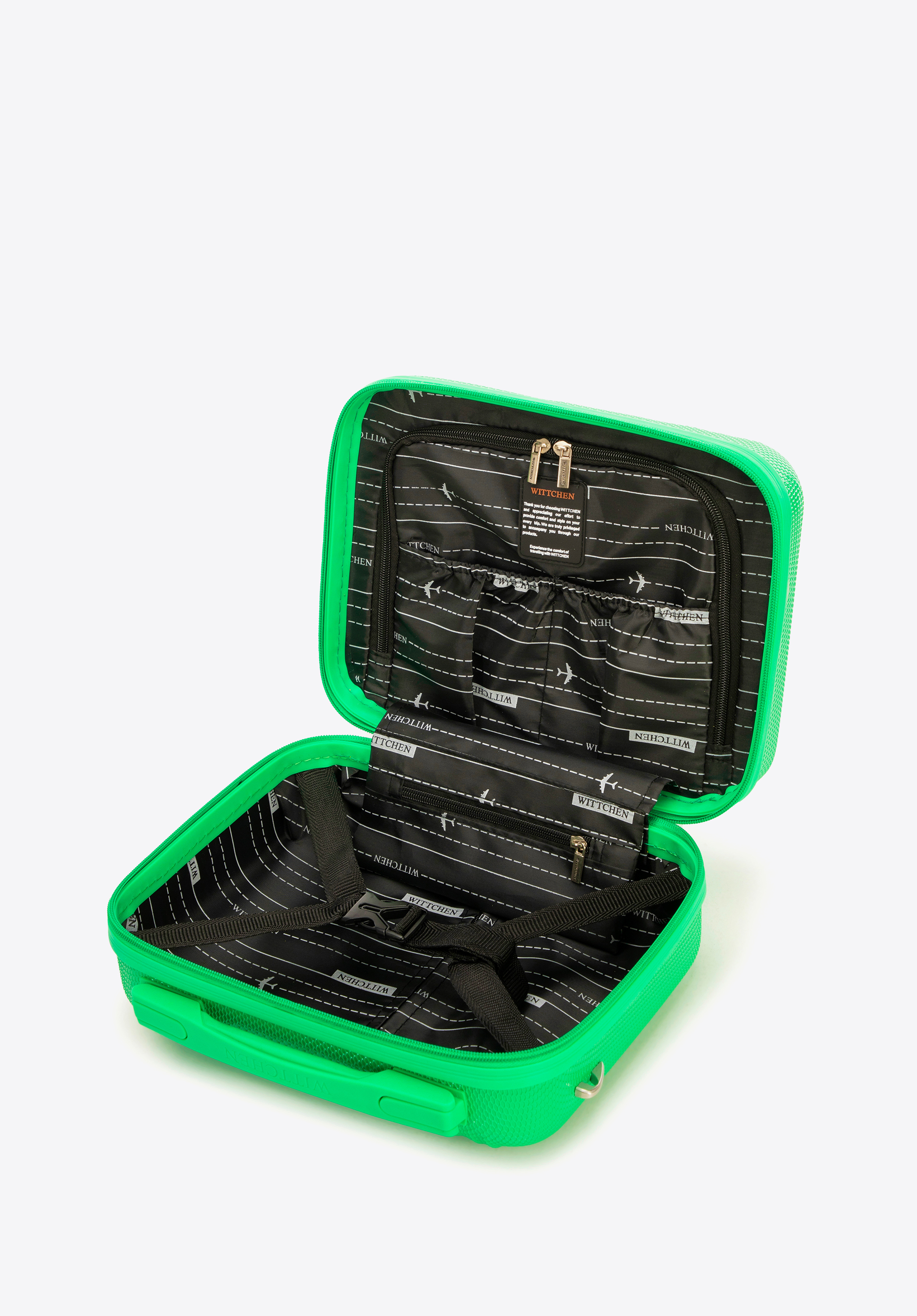 Objavte spoľahlivý spôsob skladovania kozmetiky a príslušenstva s našou kozmetickou taškou z polykarbonátu. Je to malý luxus, ktorý urobí každý váš výlet pestrejším a organizovanejším! Kozmetická taška má zaujímavú textúru a vertikálny reliéf. Môžete si ju kúpiť samostatne alebo v súprave kufrov z rovnakej kolekcie.