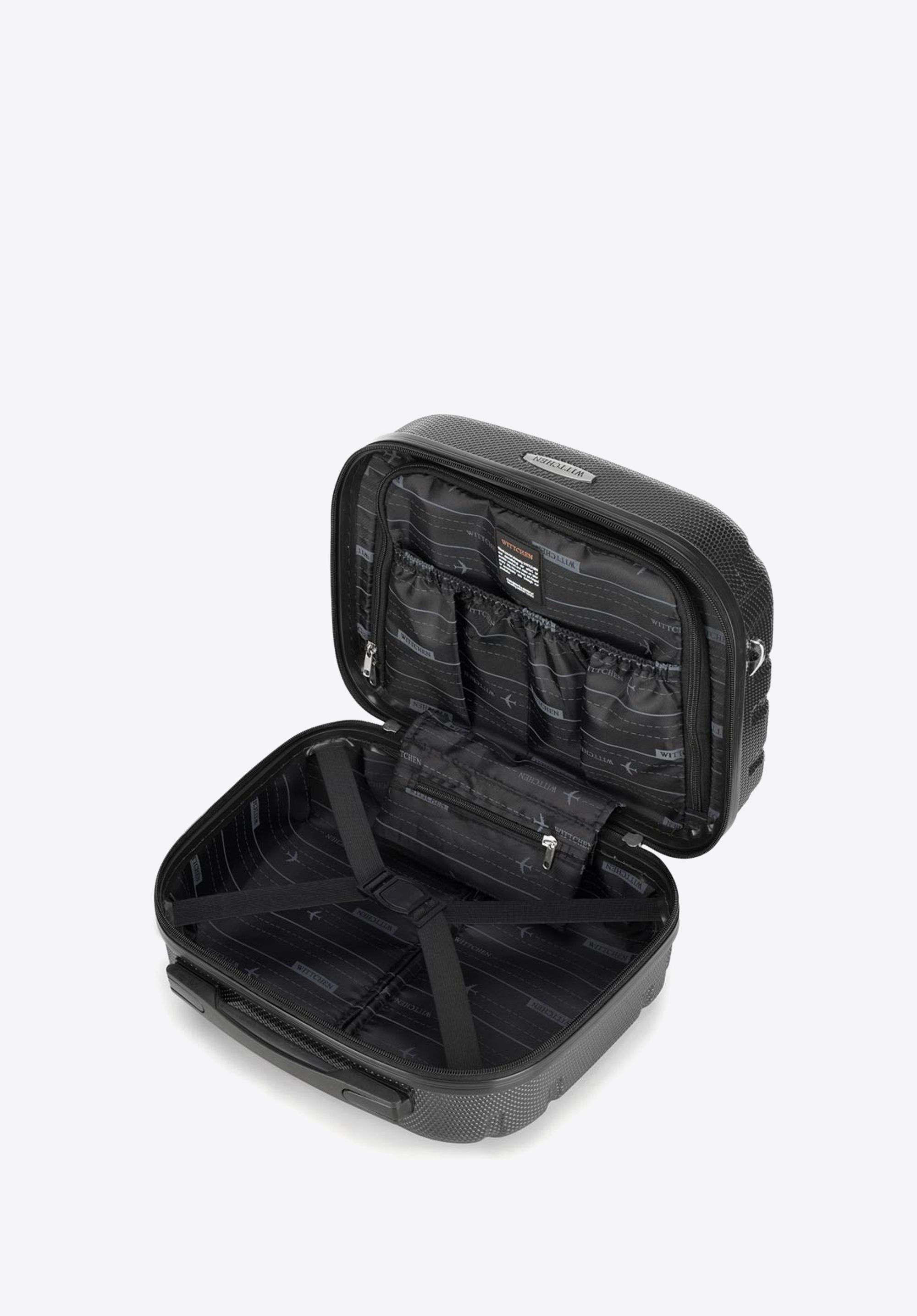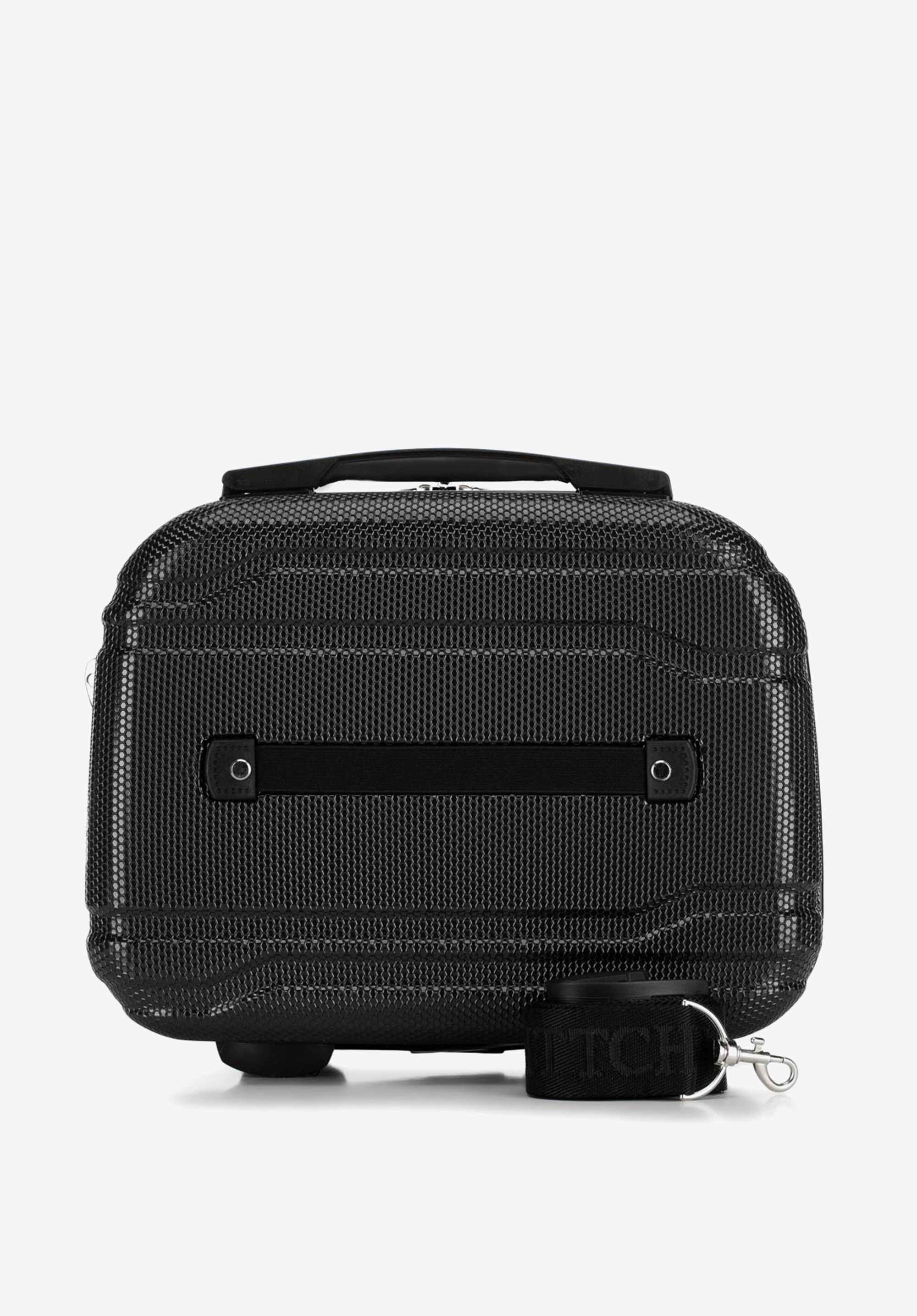 Elegantná pevná kozmetická taška je vyrobená z odolného polykarbonátu. Tento funkčný model je vybavený rukoväťou na jednoduché prenášanie, odnímateľným nastaviteľným popruhom a elastickým popruhom na pripevnenie k rukoväti kufra.
