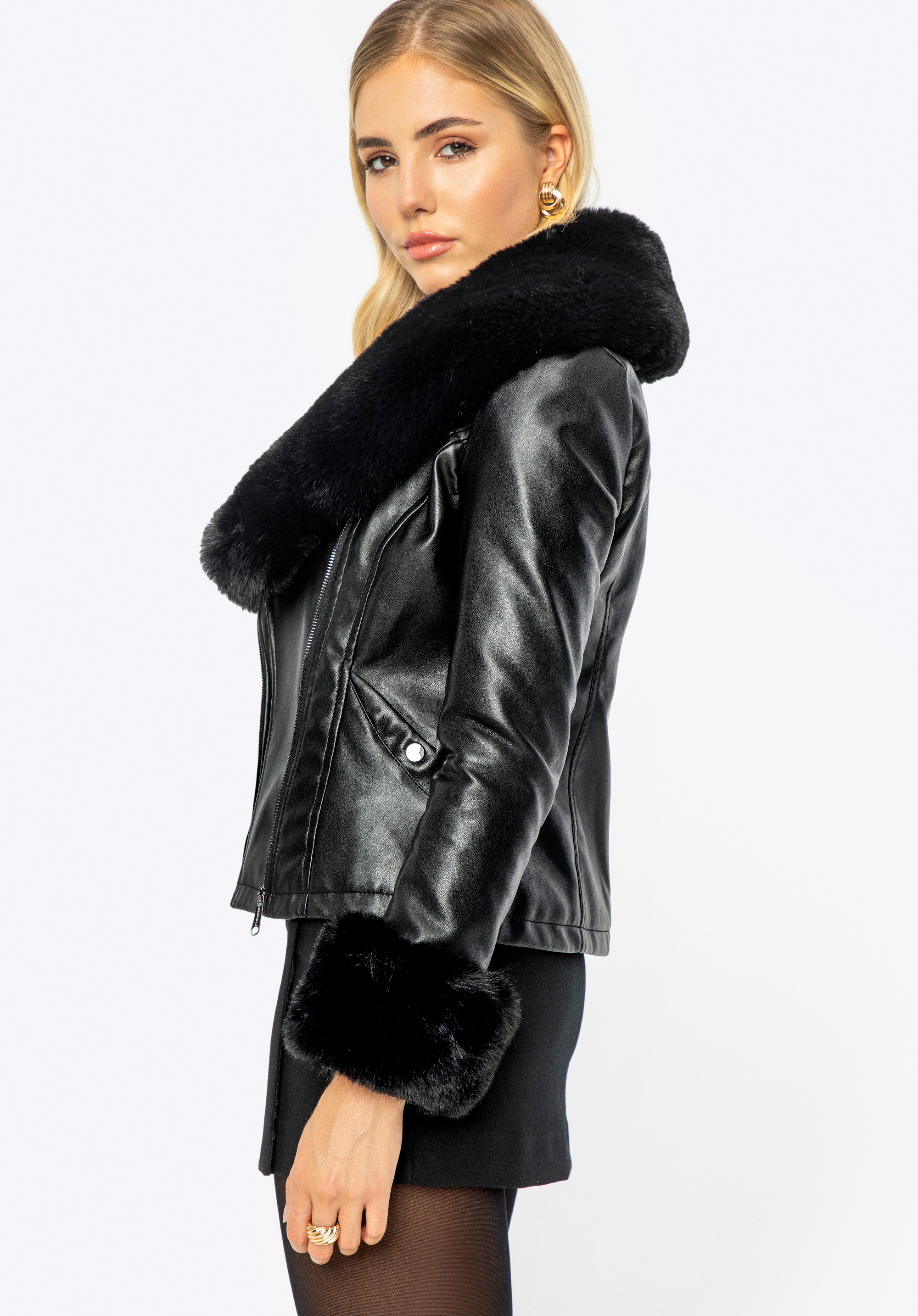Elegancia sa snúbi s pohodlím v našej dámskej bunde z ekokože. Vďaka modernému dizajnu a starostlivo vybraným detailom sa každá žena bude cítiť štýlovo a jedinečne. Pevný zips zaručuje jednoduché obliekanie a vyzliekanie a funkčné vrecká s patentkami bezpečne pojmú tie najdôležitejšie veci. Kožušinový golier a manžety dodávajú bunde luxusný charakter, zatiaľ čo možnosť rozopnutia goliera umožňuje prispôsobiť jej vzhľad rôznym príležitostiam.