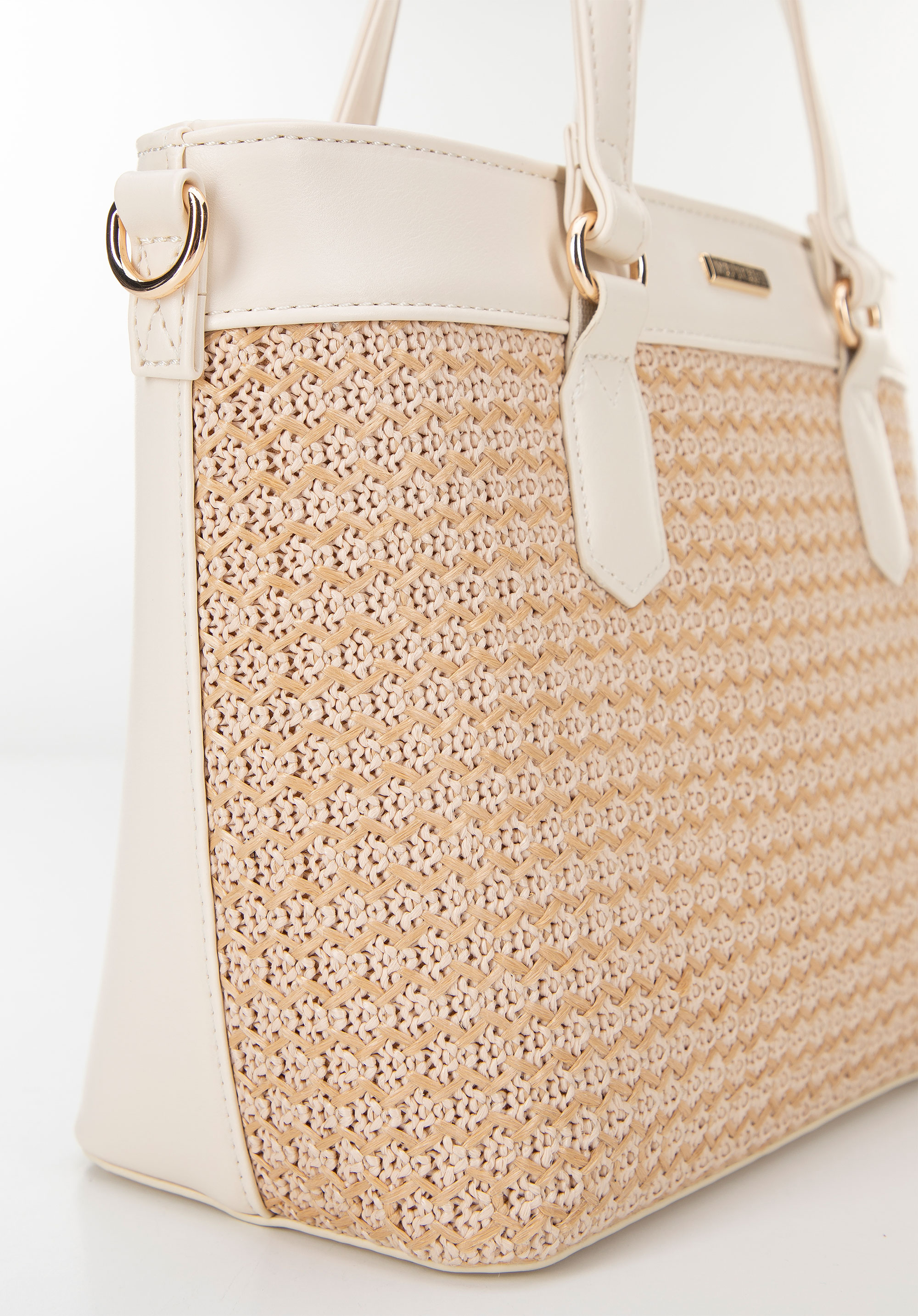 Táto kabelka v štýle tote bag spája jedinečný dizajn a praktickosť, čím spĺňa potreby každej ženy, ktorá oceňuje štýl a pohodlie. Vyrobené z vysoko kvalitnej umelej kože a polypropylénu , vyniká svojou odolnosťou a trendovým dizajnom inšpirovaným boho . Kompaktný interiér s dvoma vreckami – vrátane jedného na zips – ponúka pohodlné uloženie vašich nevyhnutností. Je ideálny na každodenné použitie, ponúka funkčnosť a elegantný vzhľad.