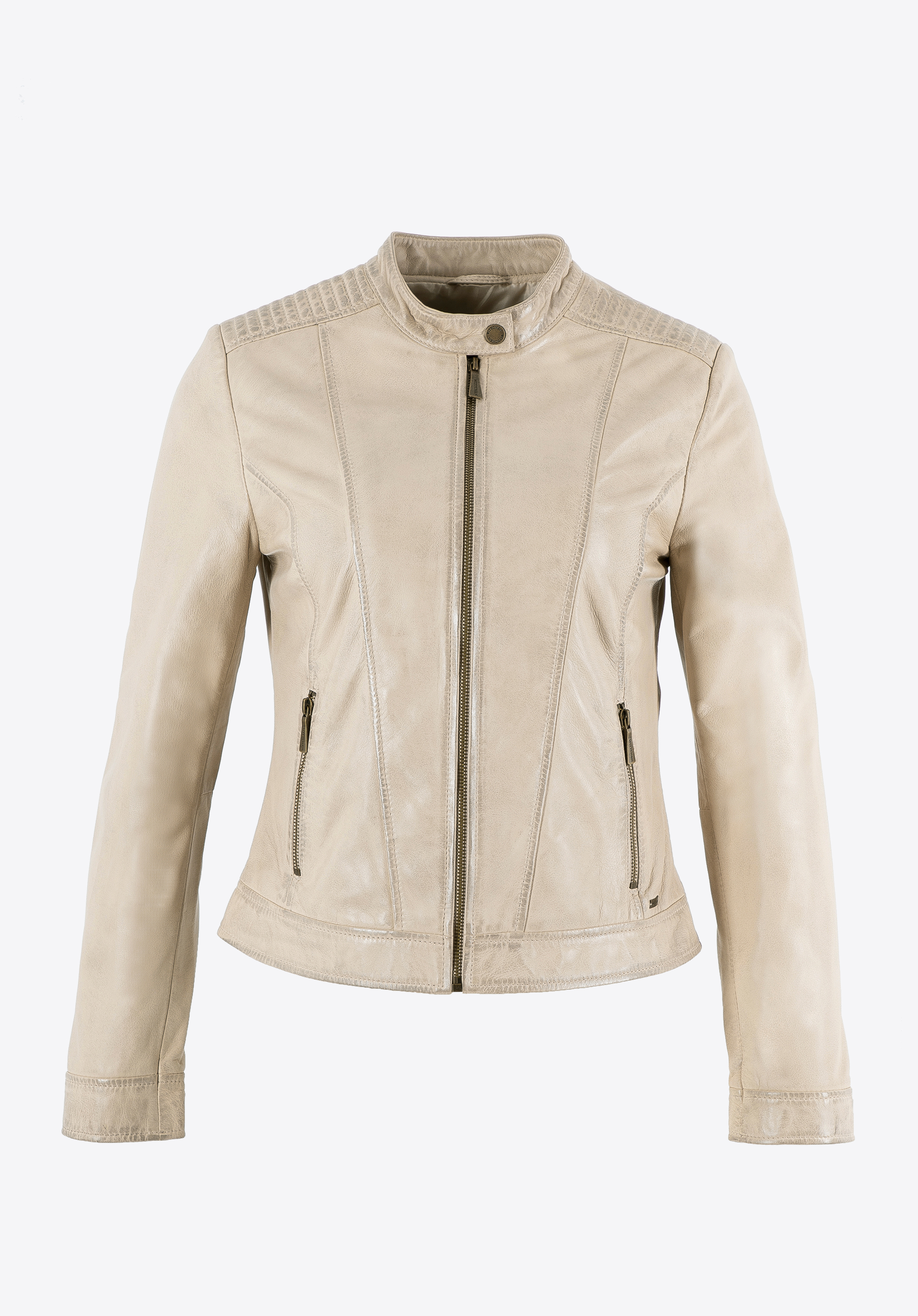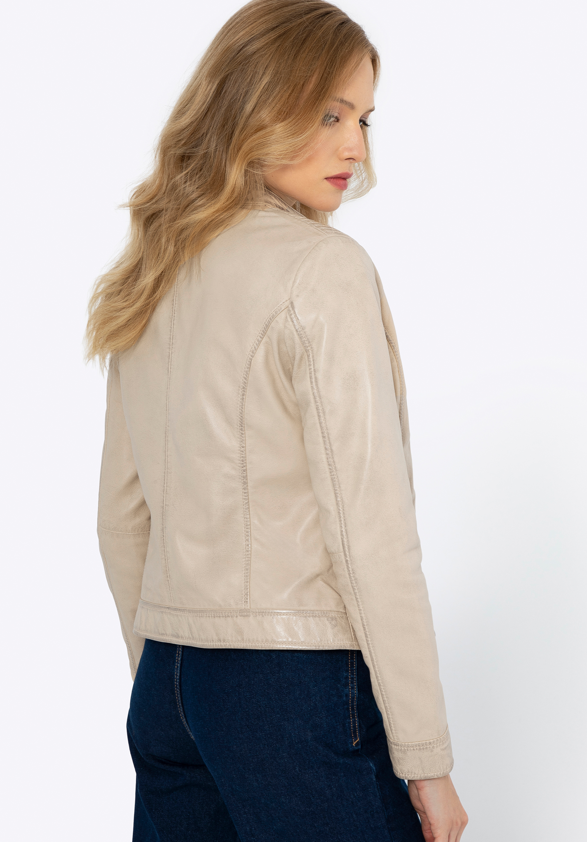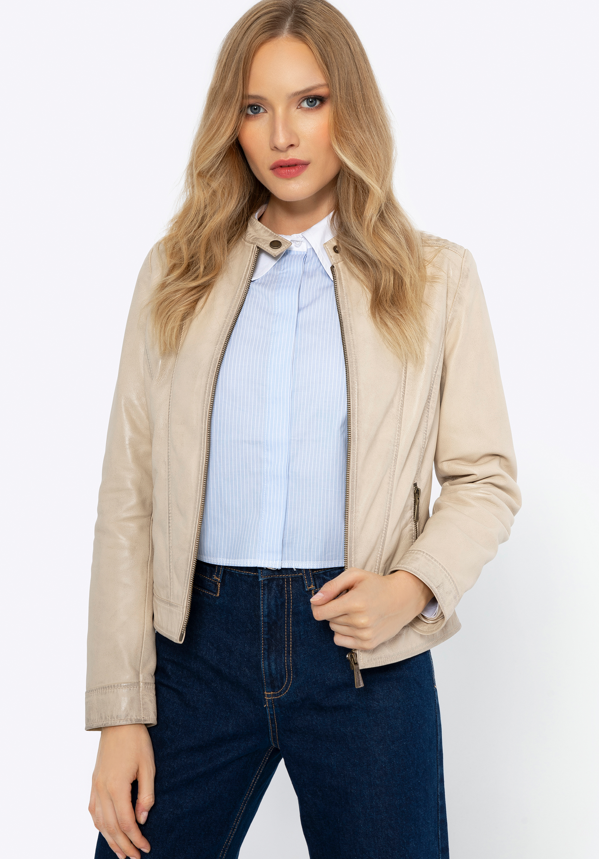 Táto klasická kožená bunda je povinnou výbavou každej ženy, ktorá si cení pohodlie a nadčasový štýl. Vyrobená z vysokokvalitnej, mäkkej a jemnej ovčej kože, zaručuje dlhodobé používanie. Kožená bunda nikdy nevyjde z módy vďaka vlastnosti ušľachtilého starnutia. V priebehu rokov získa vintage vzhľad, po ktorom mnohí túžia. Tento luxusný materiál sa vyznačuje priedušnými vlastnosťami, vďaka ktorým sa bunda pohodlne používa. Kratší strih bundy vám poskytne väčšiu voľnosť, zatiaľ čo zvýraznený pás vyzdvihne vaše ženské kvality. Zapína sa jednoduchým zipsom v odtieni mosadze, ktorý krásne ladí s farbou bundy. Tento model má na prednej strane dve vrecká so zipsami, ktoré pojmú vaše najnevyhnutnejšie drobnosti. Vďaka stojačiku so zapínaním na patentný gombík krásne zvýrazníte váš krk a prešívanie na ramenách oživí aj ten najjednoduchší outfit.