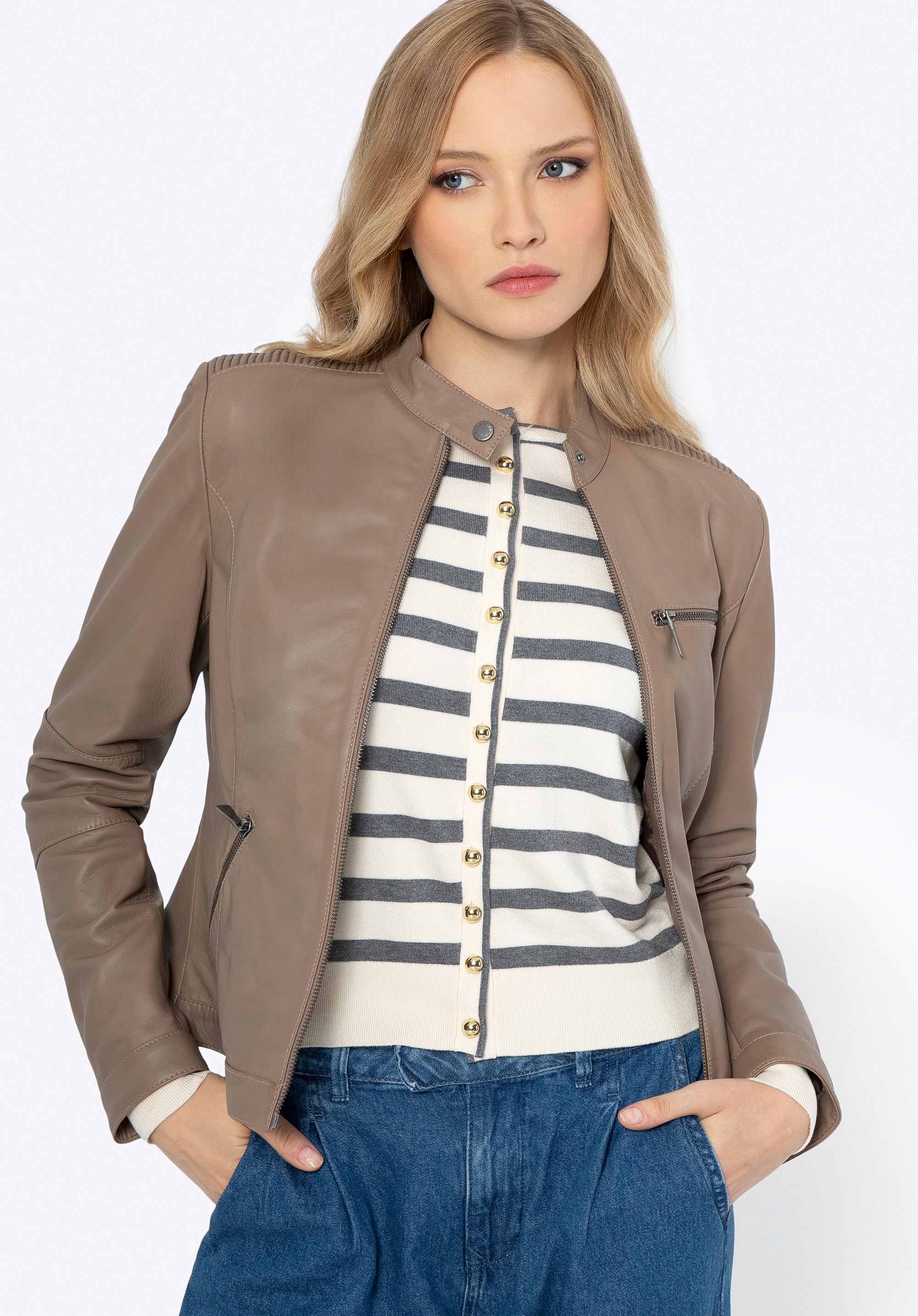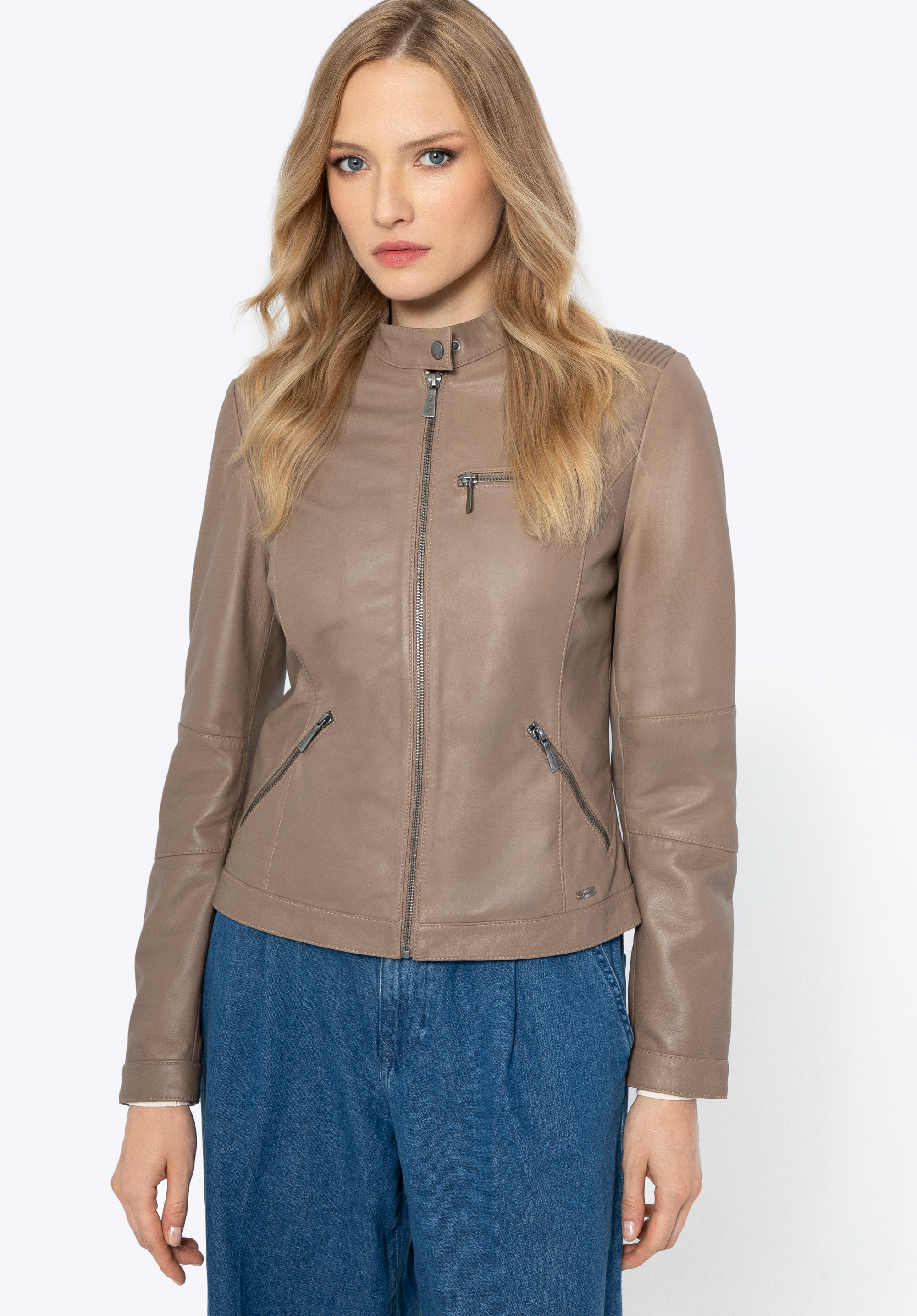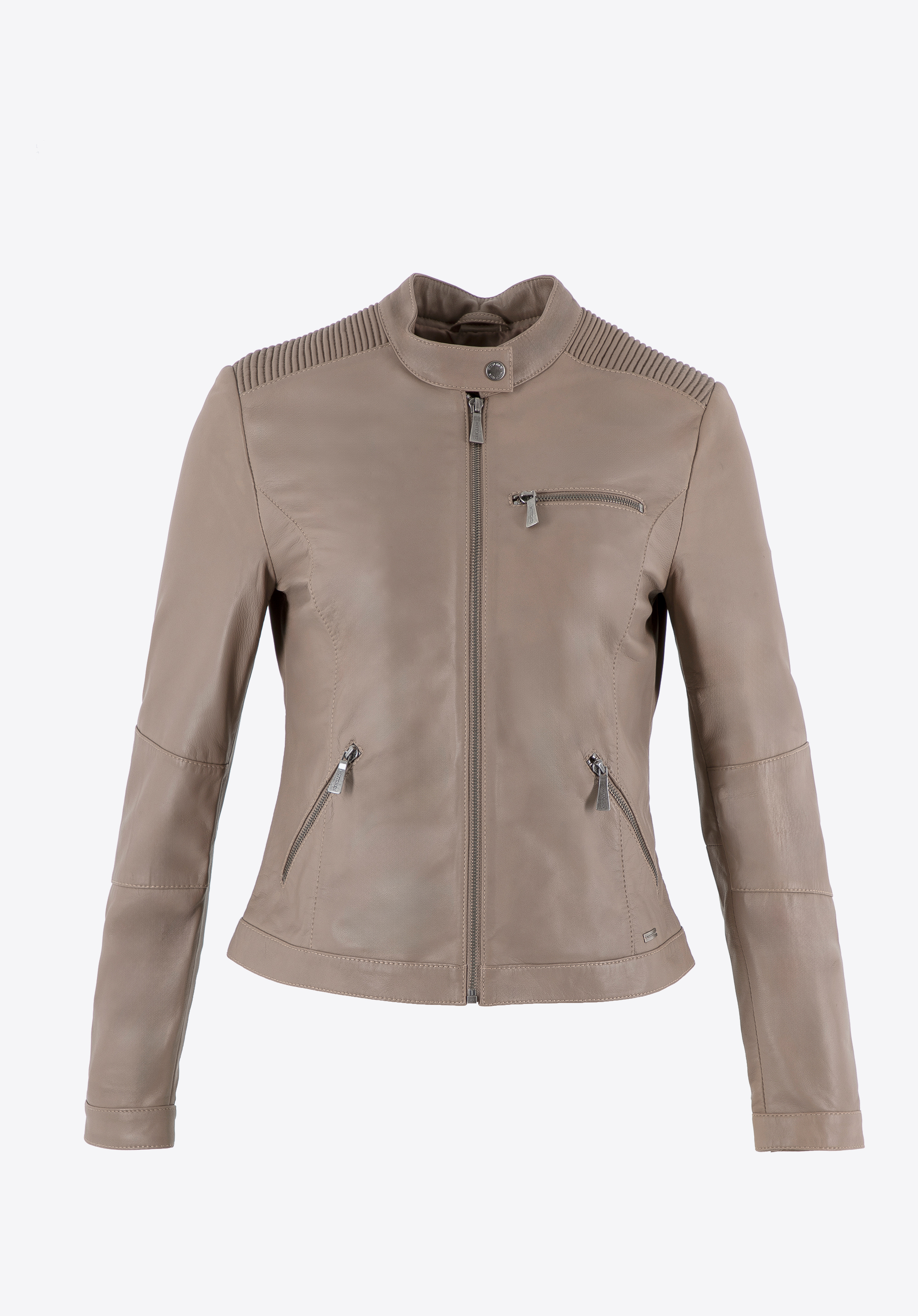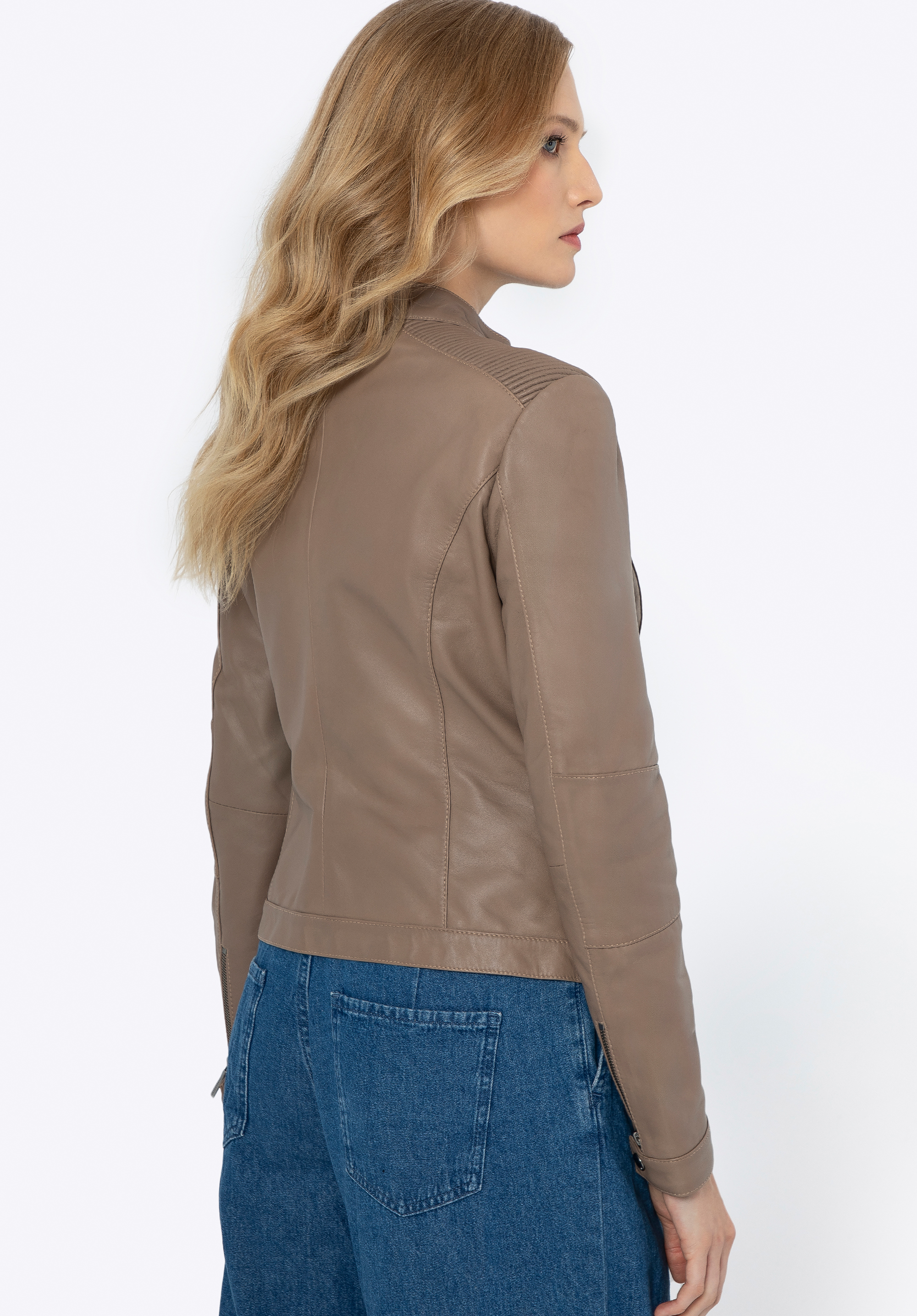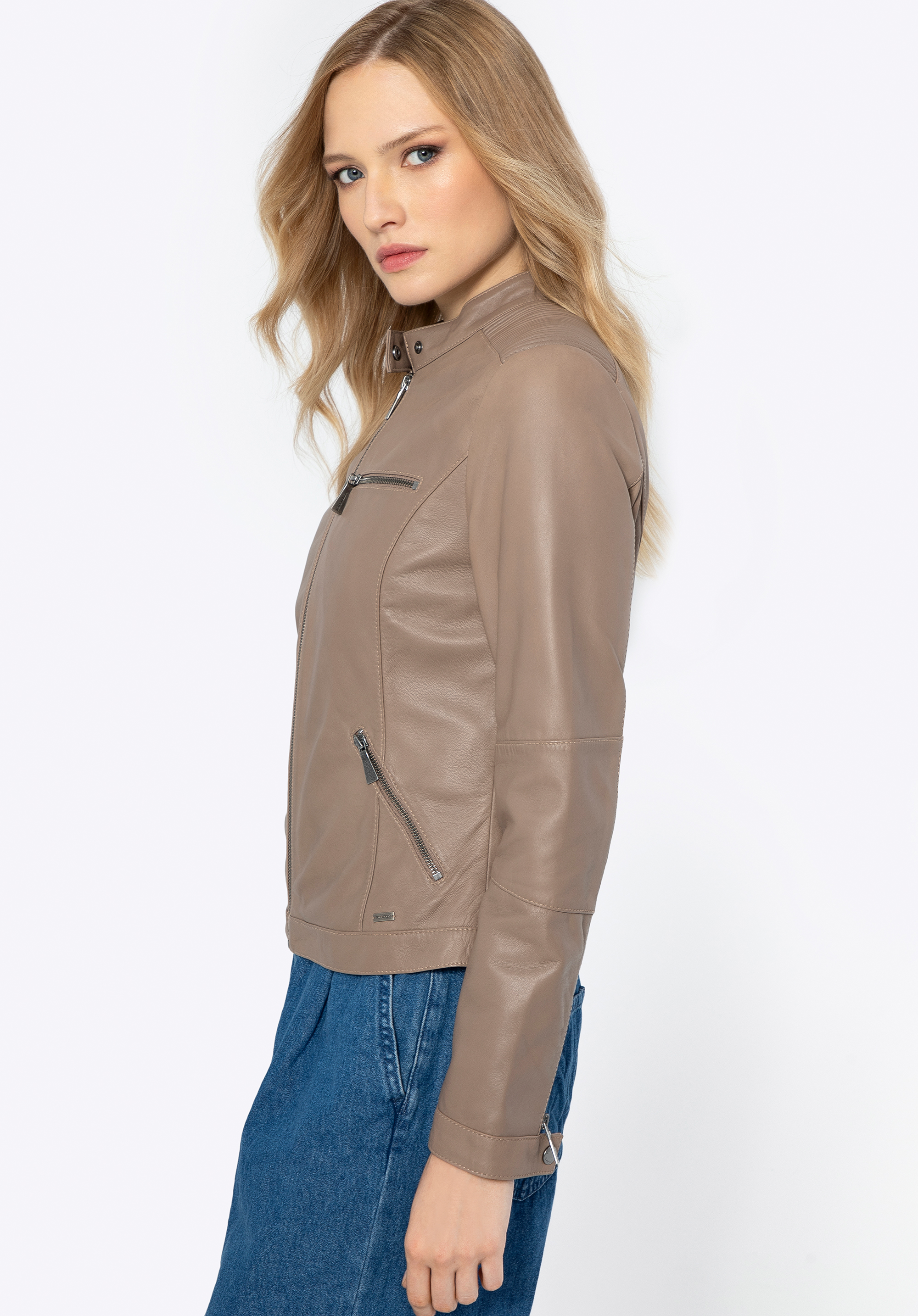Kožená bunda je nespornou módnou ikonou. Možnosti jej štylizácie sa v priebehu rokov rozšírili, pretože neustále vládne po svetových módnych mólach. Nosia ju všetky ženy, ktoré si cenia pohodlie, módny vzhľad, funkčnosť a klasiku. Pridajte sa k nim teraz! Vyrobená z vysokokvalitnej ovčej kože, zaistí vám pohodlie pri nosení počas mnohých sezón. Zvýraznený pás bundy rozhodne odhalí vašu postavu. Mimoriadne cennou estetickou kvalitou tejto bundy je prešívanie na ramenách, ktoré zvýrazňuje moderný a dynamický vzhľad. Bunda je zapínaná na rovný zips a má dve diagonálne vrecká vpredu. Tretie náprsné vrecko je hlbšie a okrem svojich estetických vlastností je aj funkčné. Všetky vrecká sa zapínajú na zips striebornej farby. Zaujímavým riešením sú zipsy na rukávoch so zapínaním na patentný gombík, ktoré po vyhrnutí spestria váš outfit.