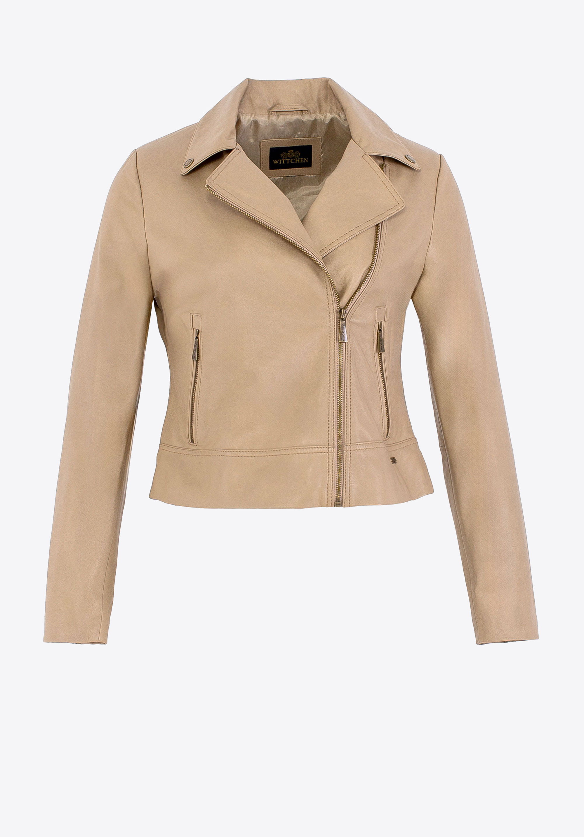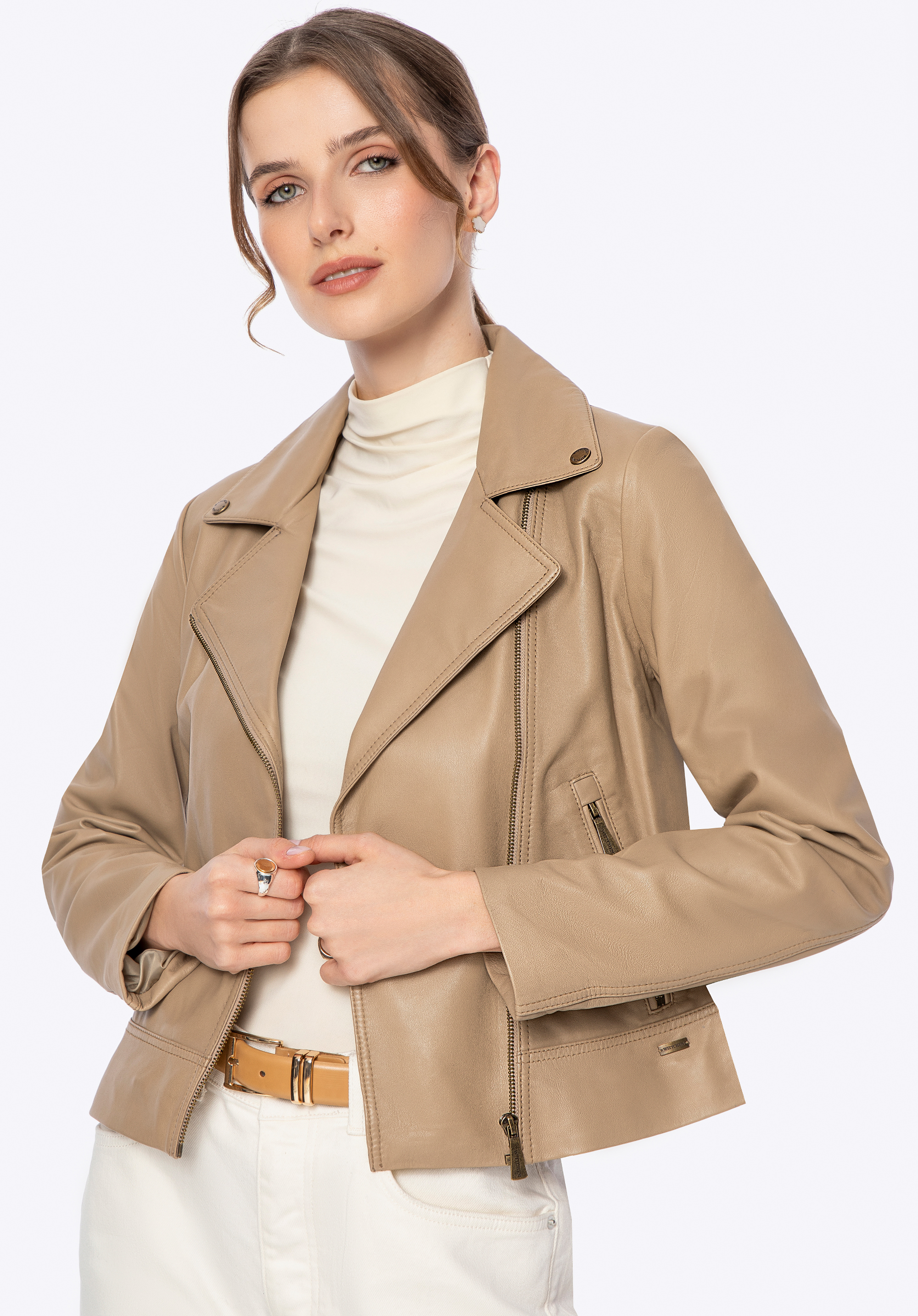 Táto výnimočná bunda vyrobená z prírodnej kože je skutočnou nevyhnutnosťou pre každého, kto hľadá kombináciu luxusu, štýlu a funkčnosti. Vďaka polyesterovej podšívke ponúka extra pohodlie a mäkkosť, vďaka čomu je radosť nosiť. Diagonálne zapínanie na zips a ozdobné patentné gombíky na golieri zvýrazňujú jeho moderný, nápaditý štýl. Prispôsobený strih krásne tvaruje postavu, zatiaľ čo dve vrecká na zips zaisťujú funkčnosť aj eleganciu.