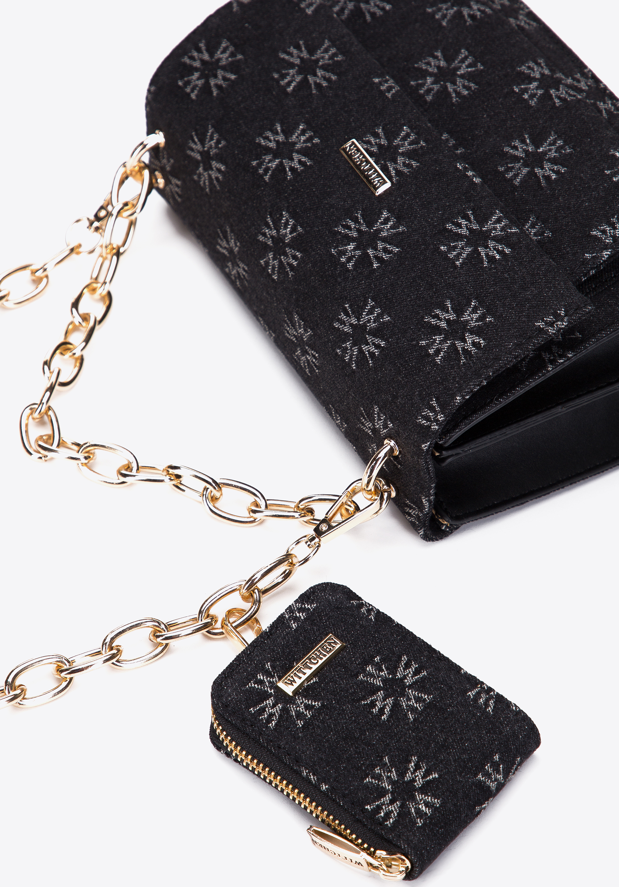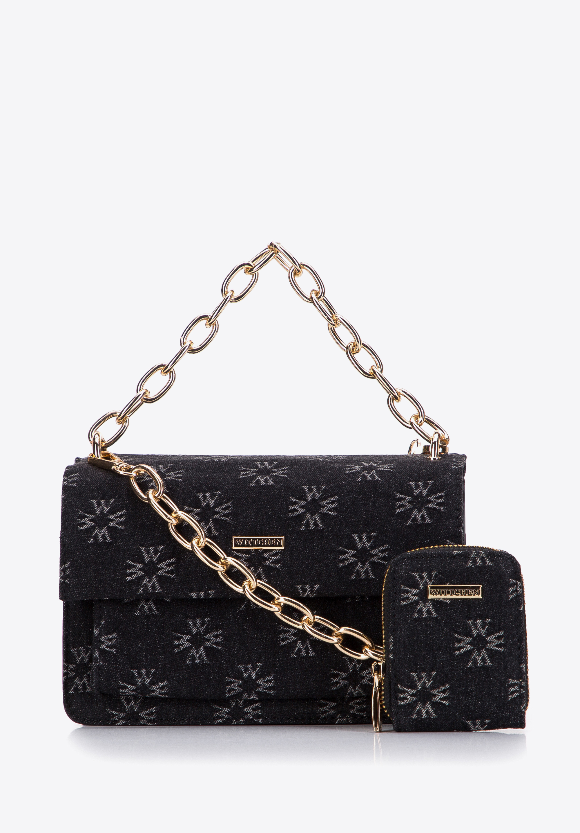 Predná strana a chlopňa sú pokryté džínsovou tkaninou vyšívanou v monograme WITTCHEN. Bočné strany sú vyrobené z ekokože. Môžete ju nosiť v ruke alebo pripojiť retiazku a zavesiť si ju cez rameno. Tento model je