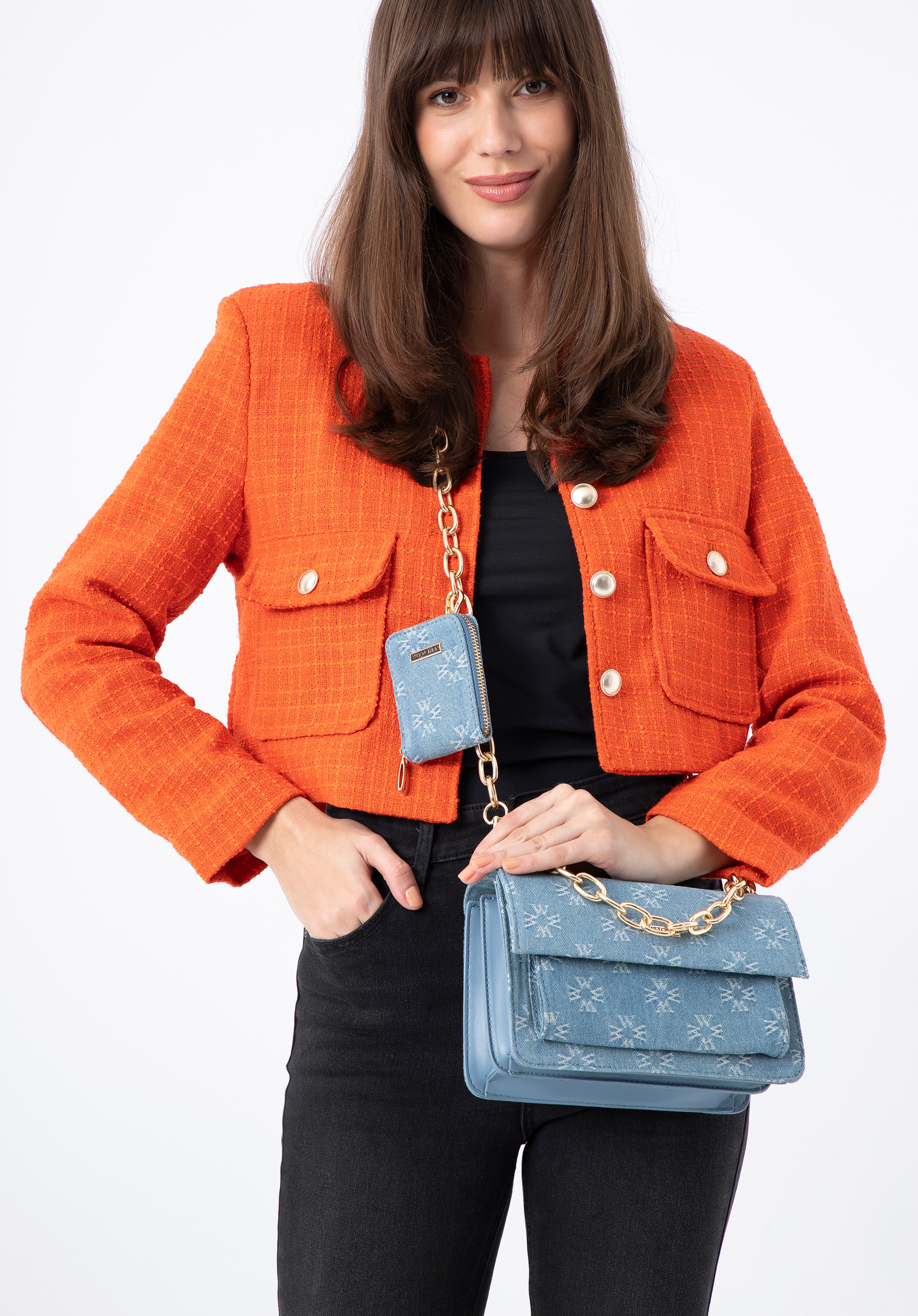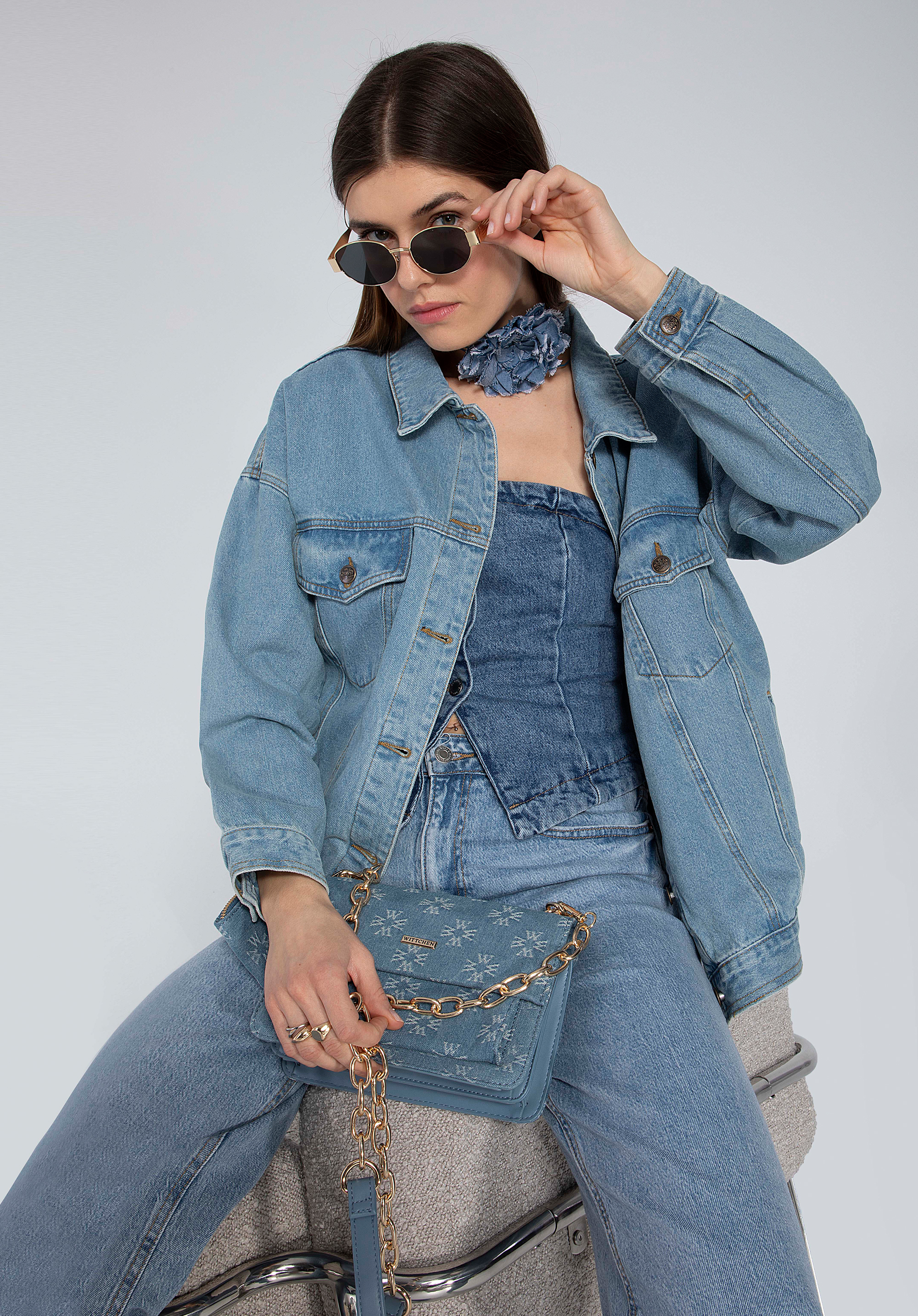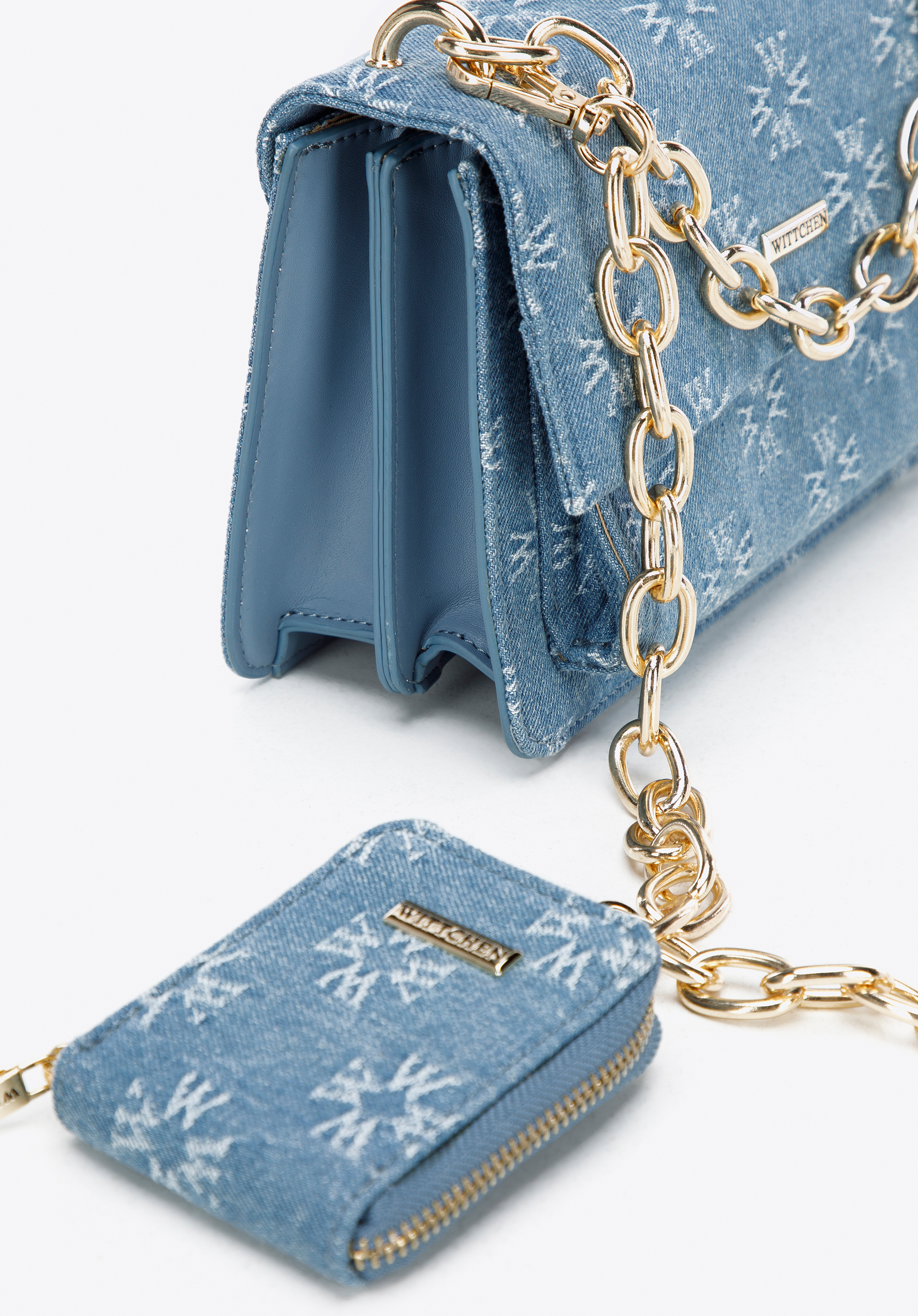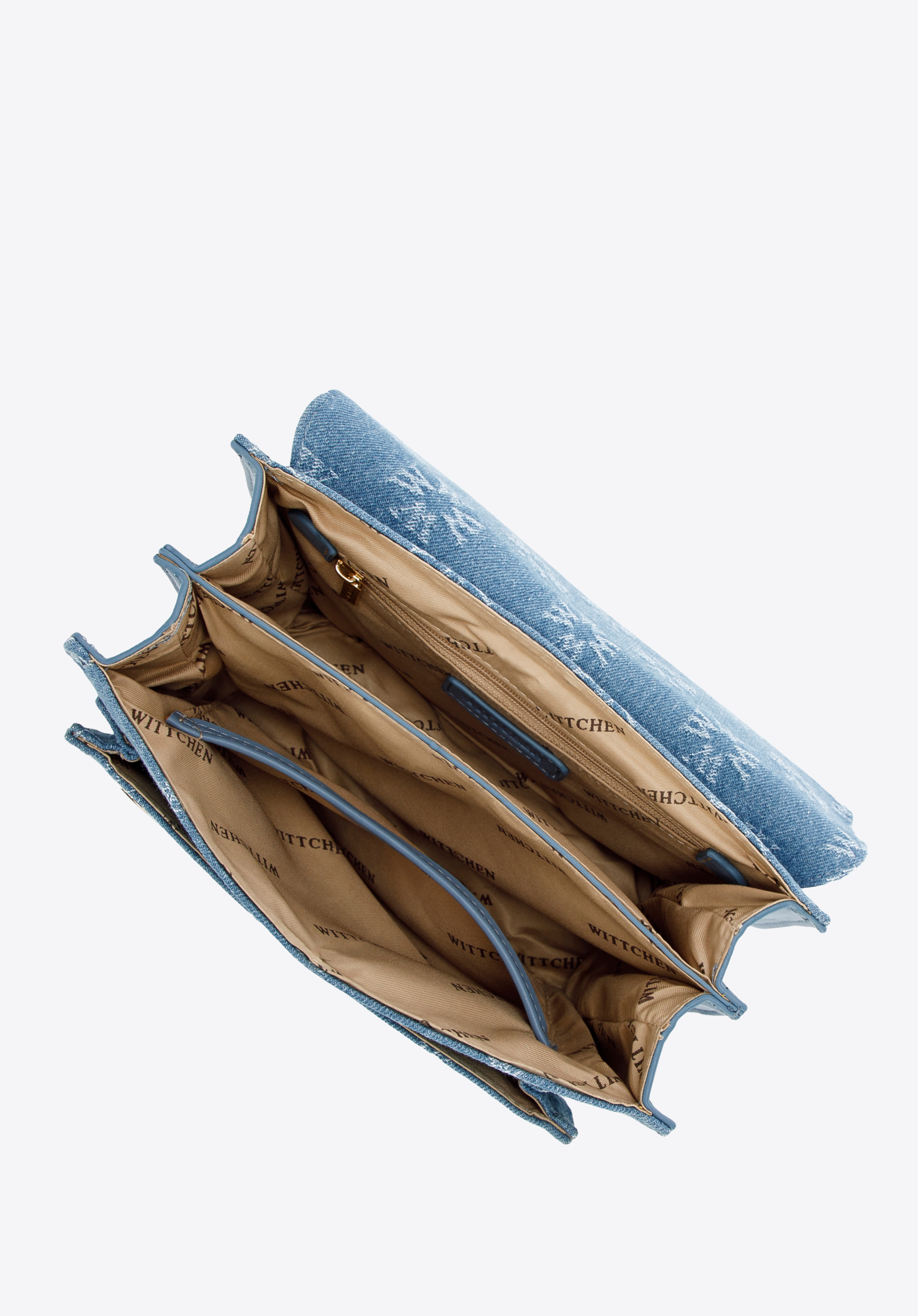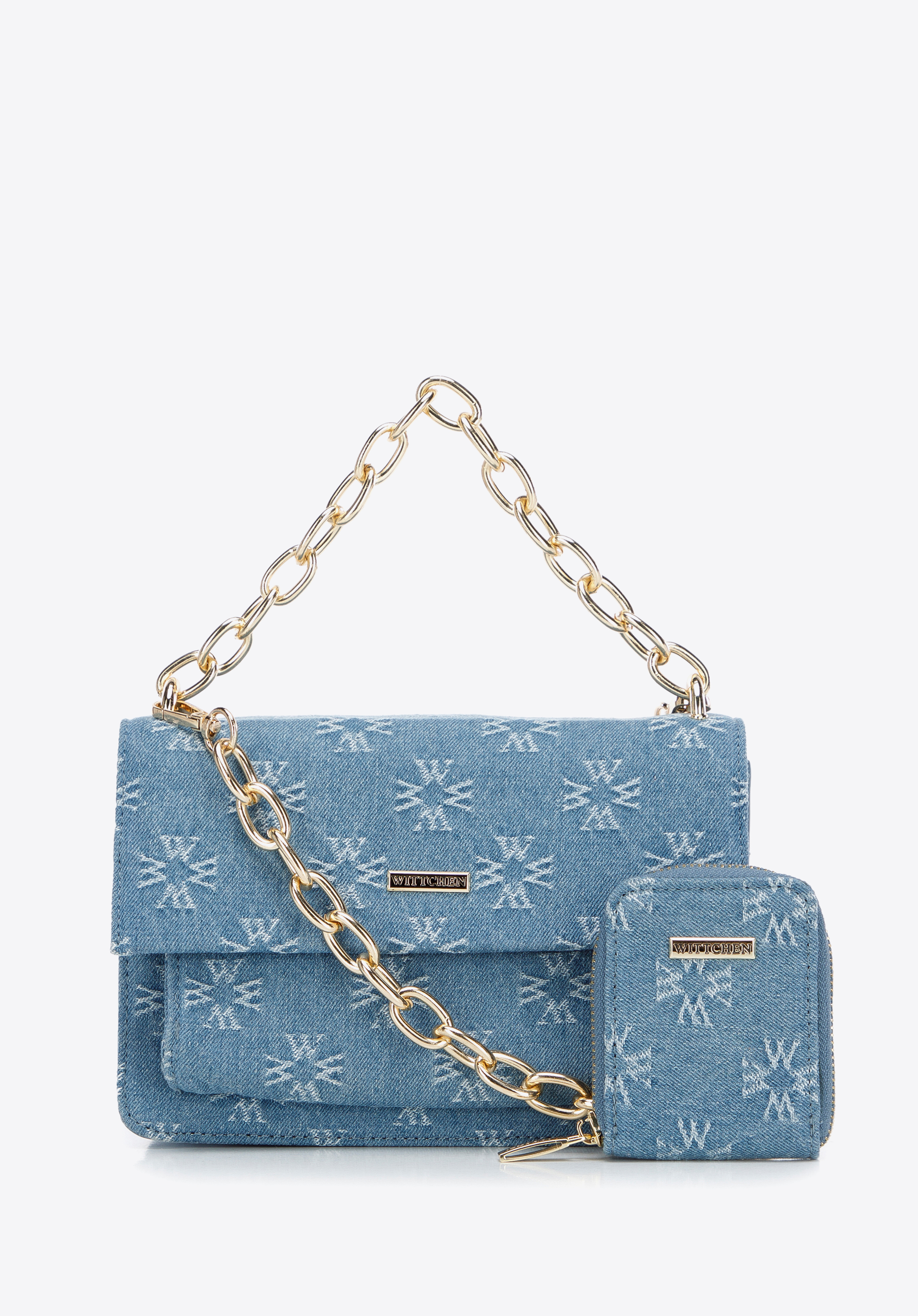 Predná strana a chlopňa sú pokryté džínsovou tkaninou vyšívanou v monograme WITTCHEN. Bočné strany sú vyrobené z ekokože. Môžete ju nosiť v ruke alebo pripojiť retiazku a zavesiť si ju cez rameno. Tento model je