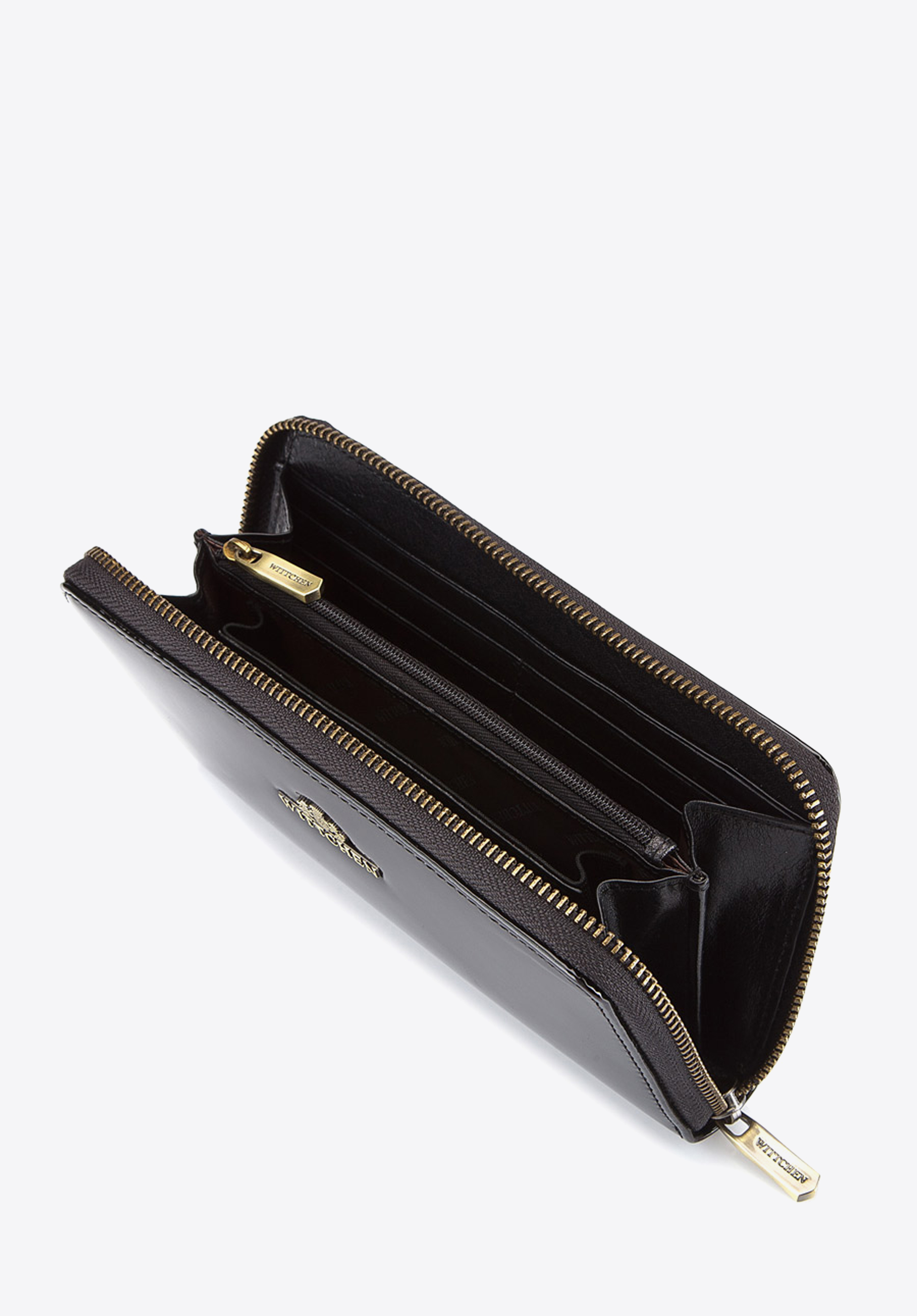 Veľká dámska peňaženka potiahnutá lakovanou kožou je funkčným doplnkom so sofistikovaným štýlom. Model sa vyznačuje jedinečnou estetikou a dokonale zvýrazní večerný outfit.