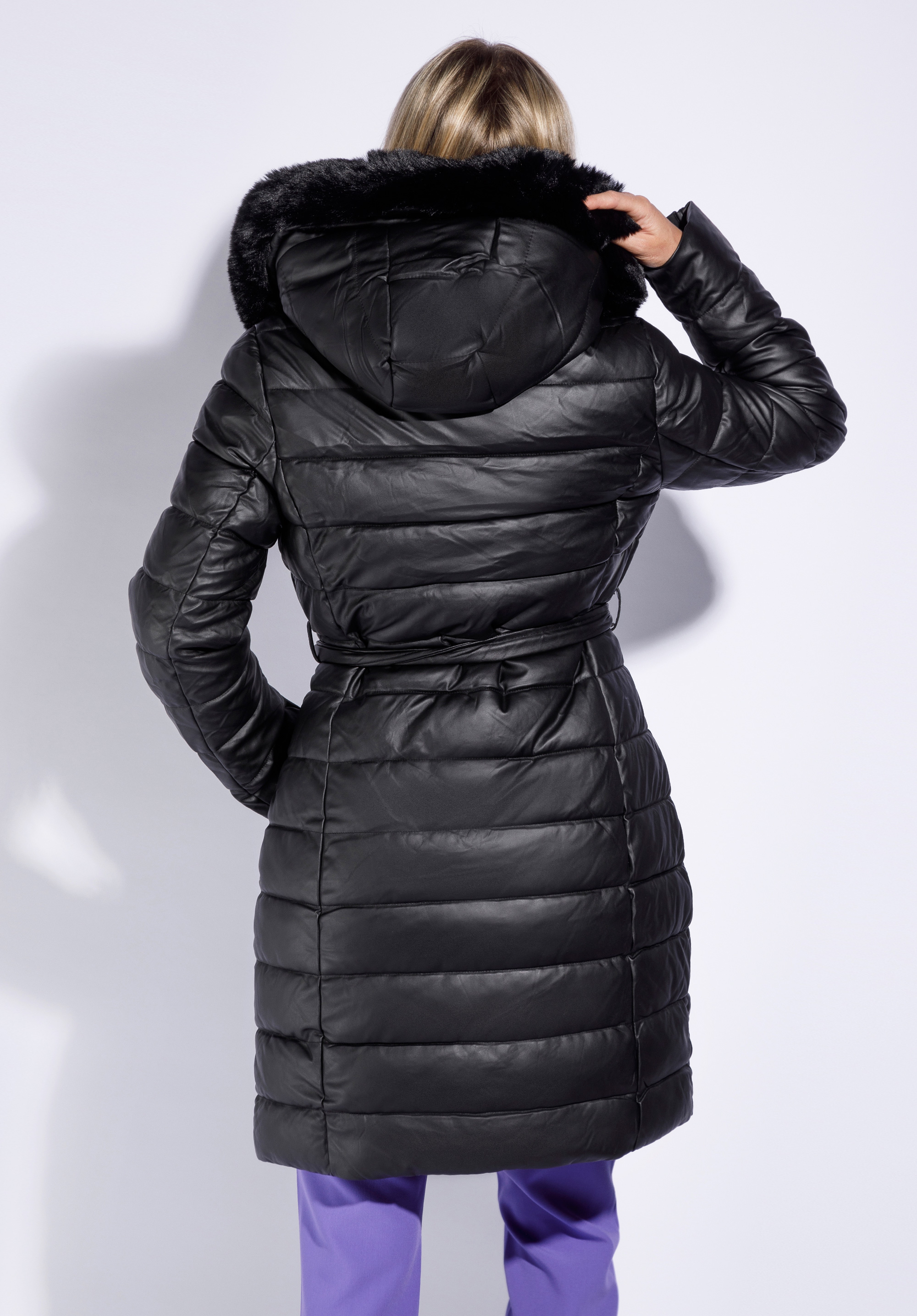 veľkou kapucňou lemovanou umelou kožušinou. Bunda má aj opasok, ktorým si môžete zvýrazniť pás. Dámska dlhá bunda z prešívanej ekokože je nadčasovým elegantným doplnkom na mnohé príležitosti. Bude sa hodiť ku každodennému oblečeniu alebo na špeciálnu príležitosť k šatám – vždy budete vyzerať klasicky, ale zaujímavo.