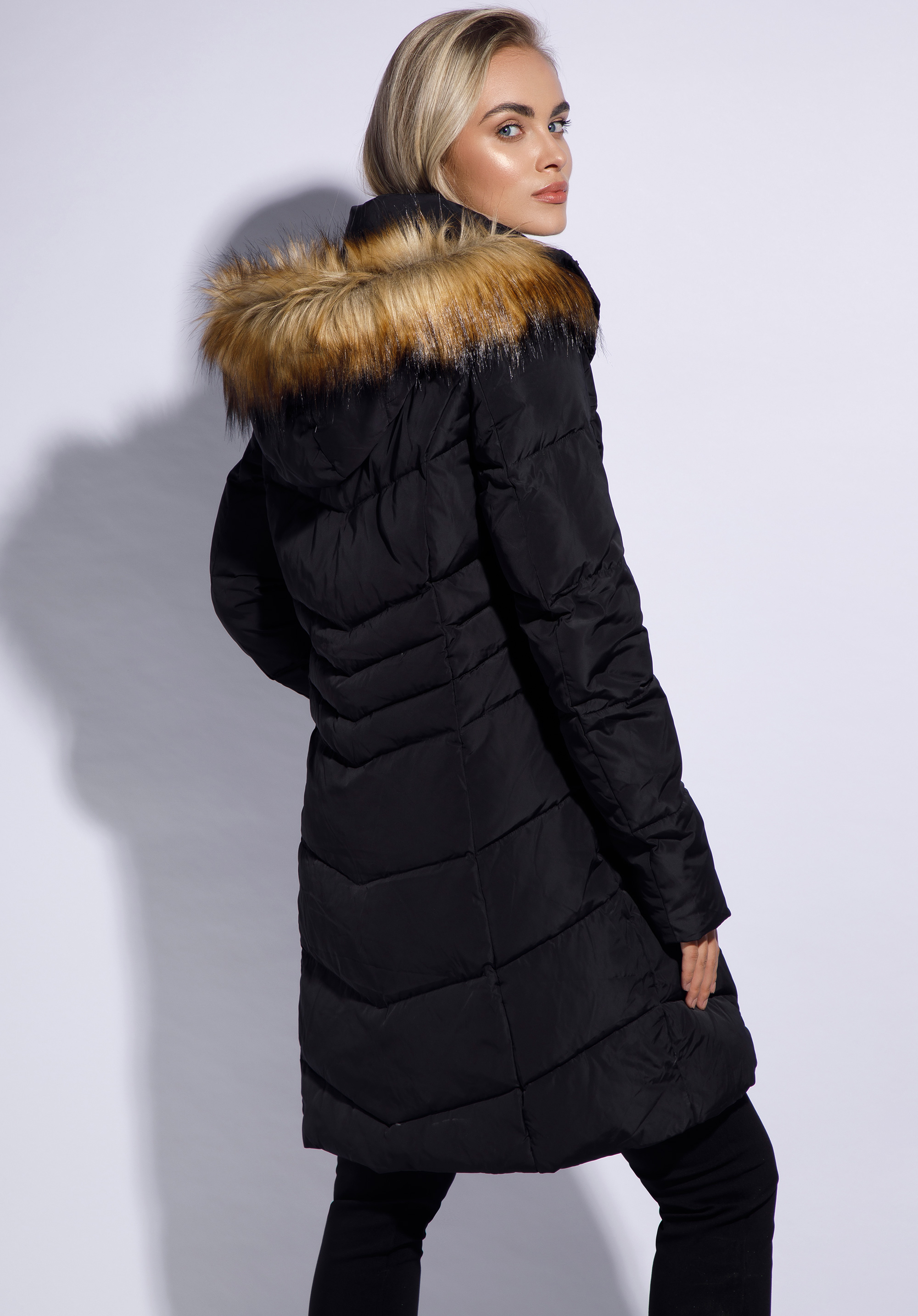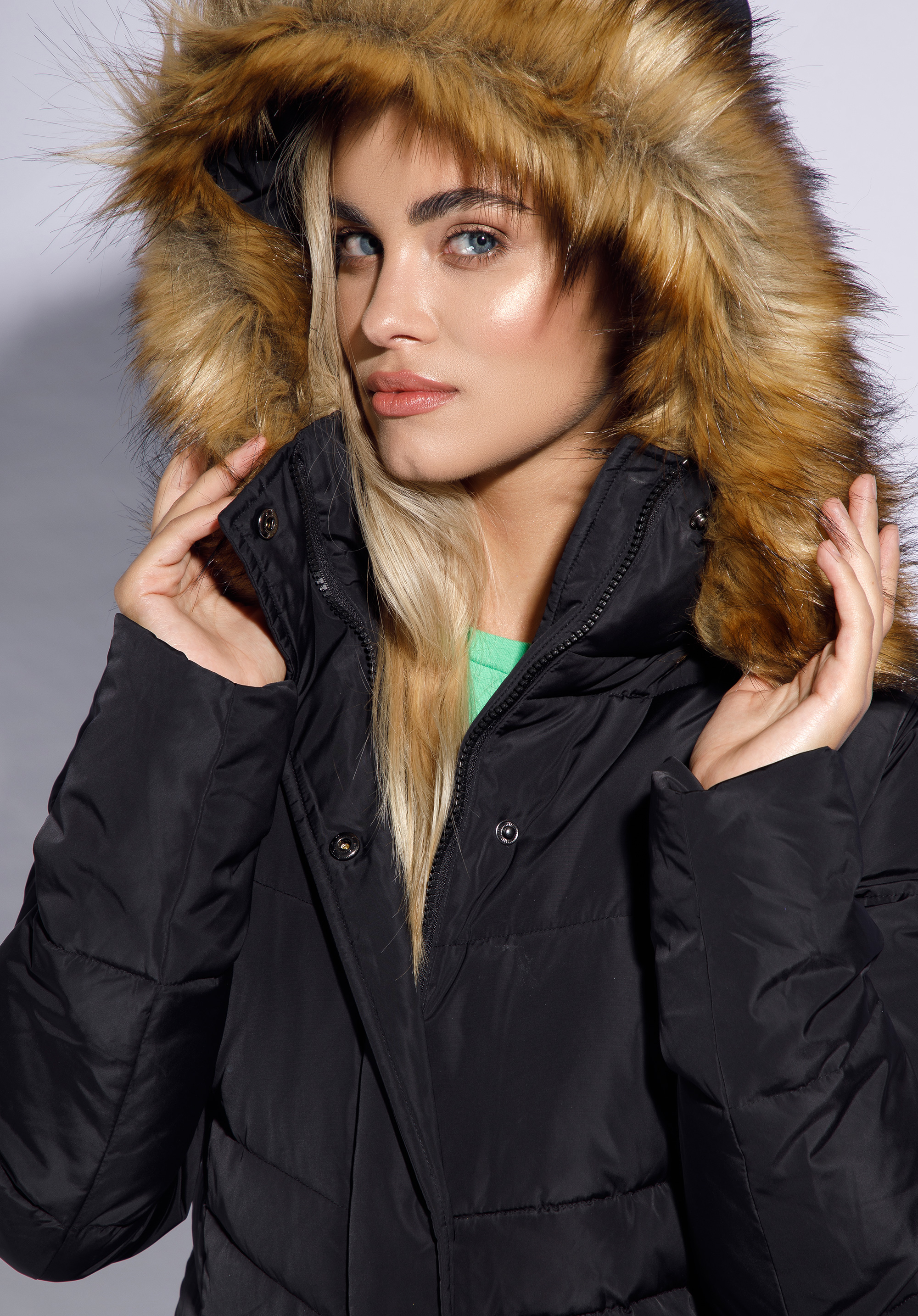 veľkú kapucňu s odnímateľnou umelou kožušinou, takže bude ideálna, ak nemáte radi čiapky. Vo švíkoch sú skryté vrecká na zips, do ktorých si môžete schovať ruky, keď si zabudnete rukavice.