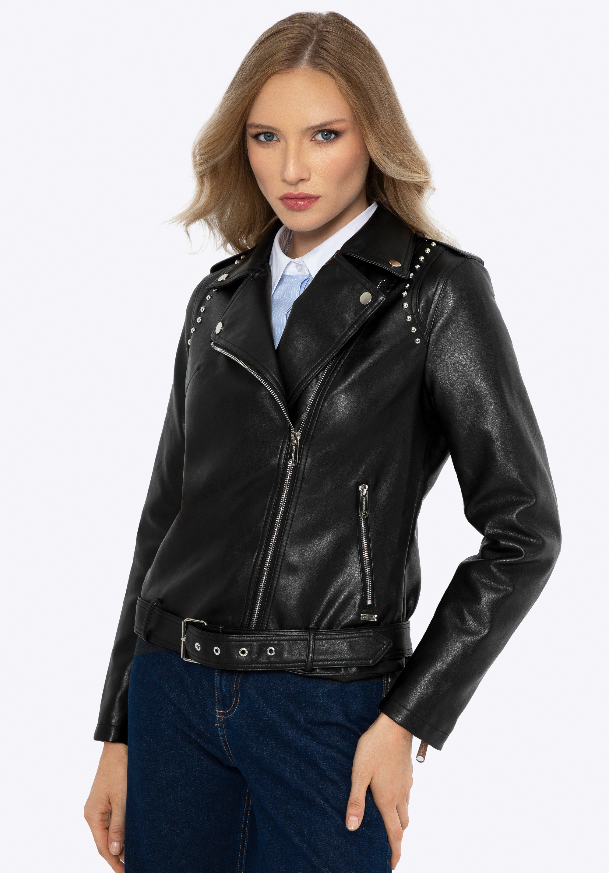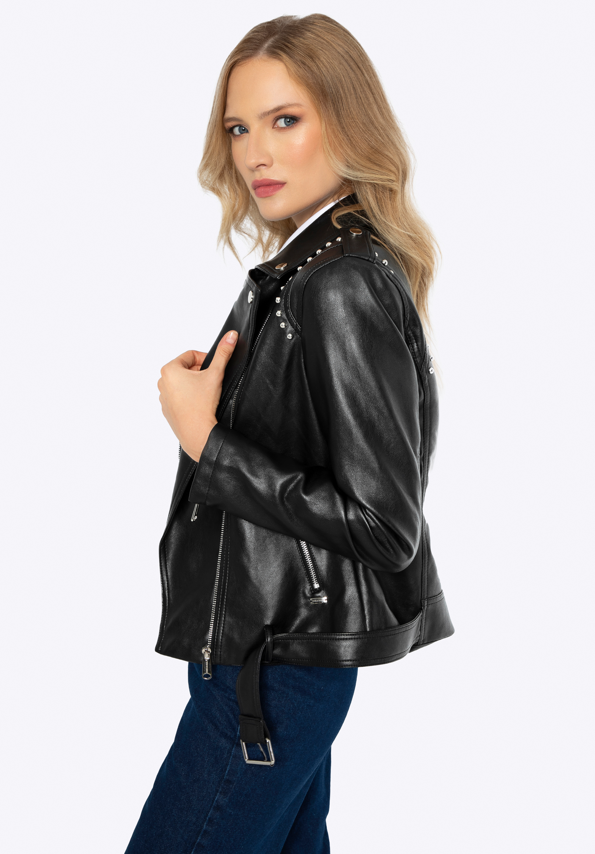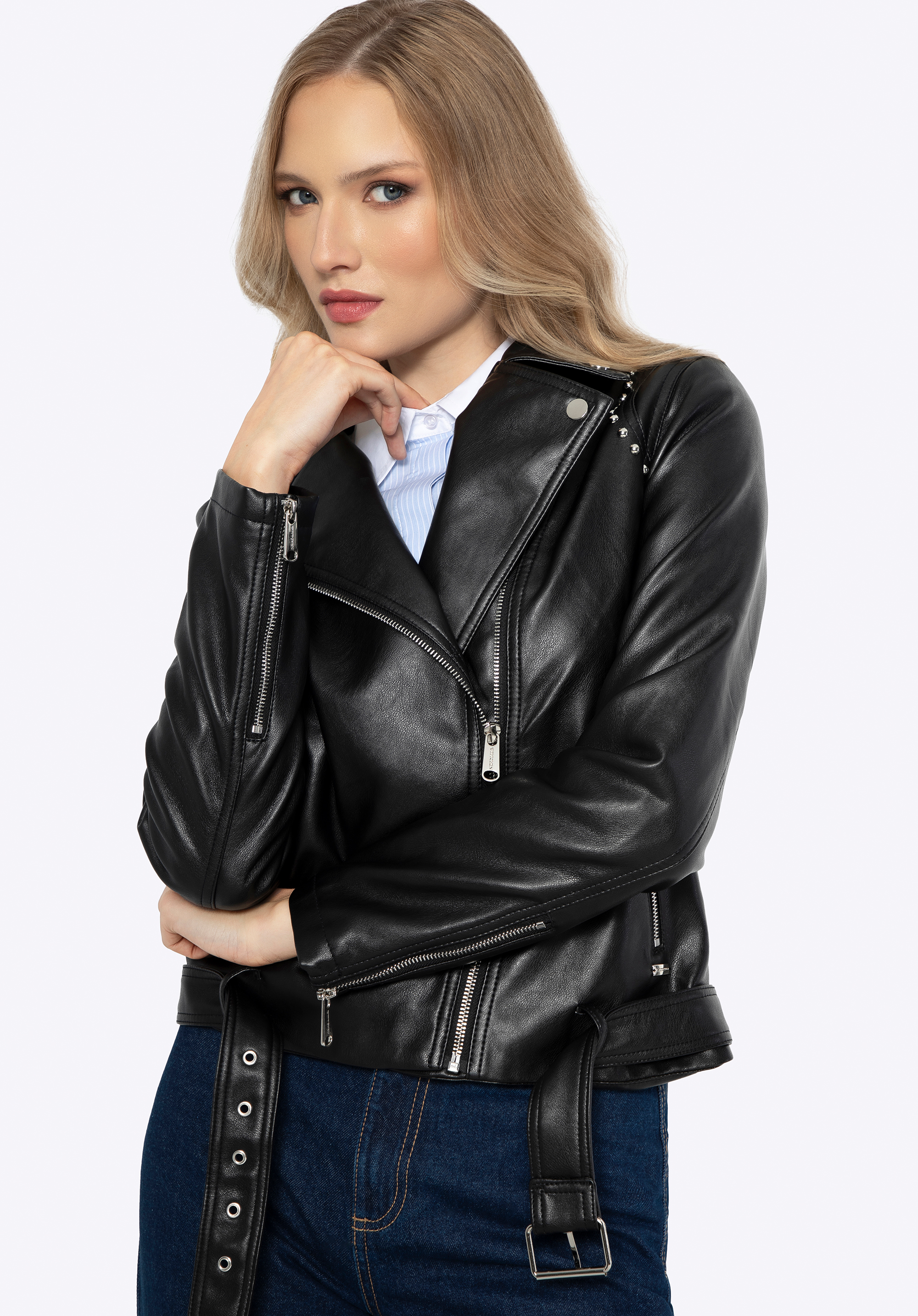 Obohaťte váš šatník o rockový nádych s našou štýlovou dámskou bundou z ekokože. Táto bunda je nielen módnym kúskom, ale aj praktickou voľbou na všetky ročné obdobia. Štýlové detaily, ako sú ozdobné nity a nastaviteľný remienok, zdôrazňujú jej jedinečný dizajn, vďaka čomu je skvelou voľbou pre každú príležitosť. Vďaka modernému a dynamickému vzhľadu so zipsom bunda získava jedinečný charakter.