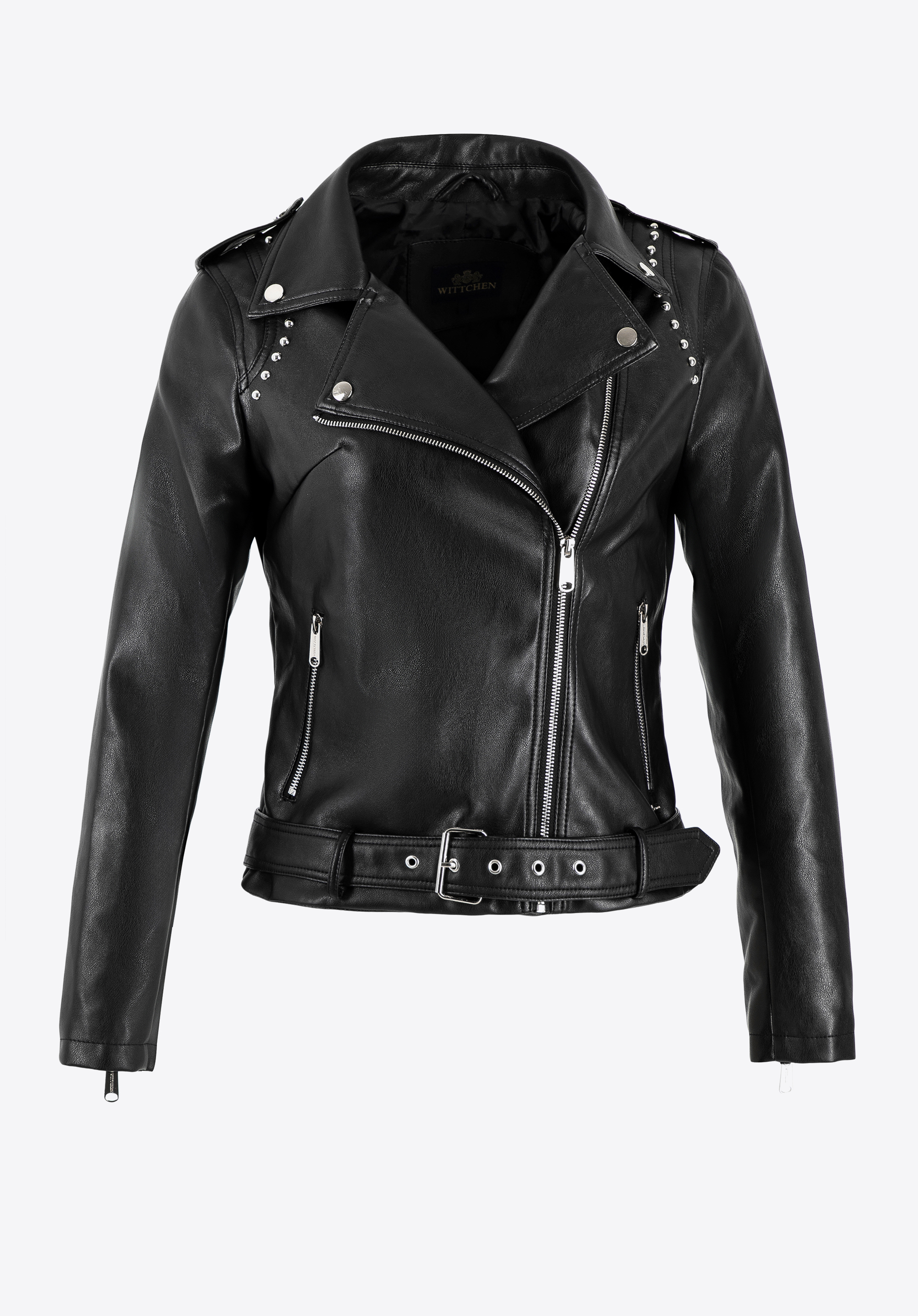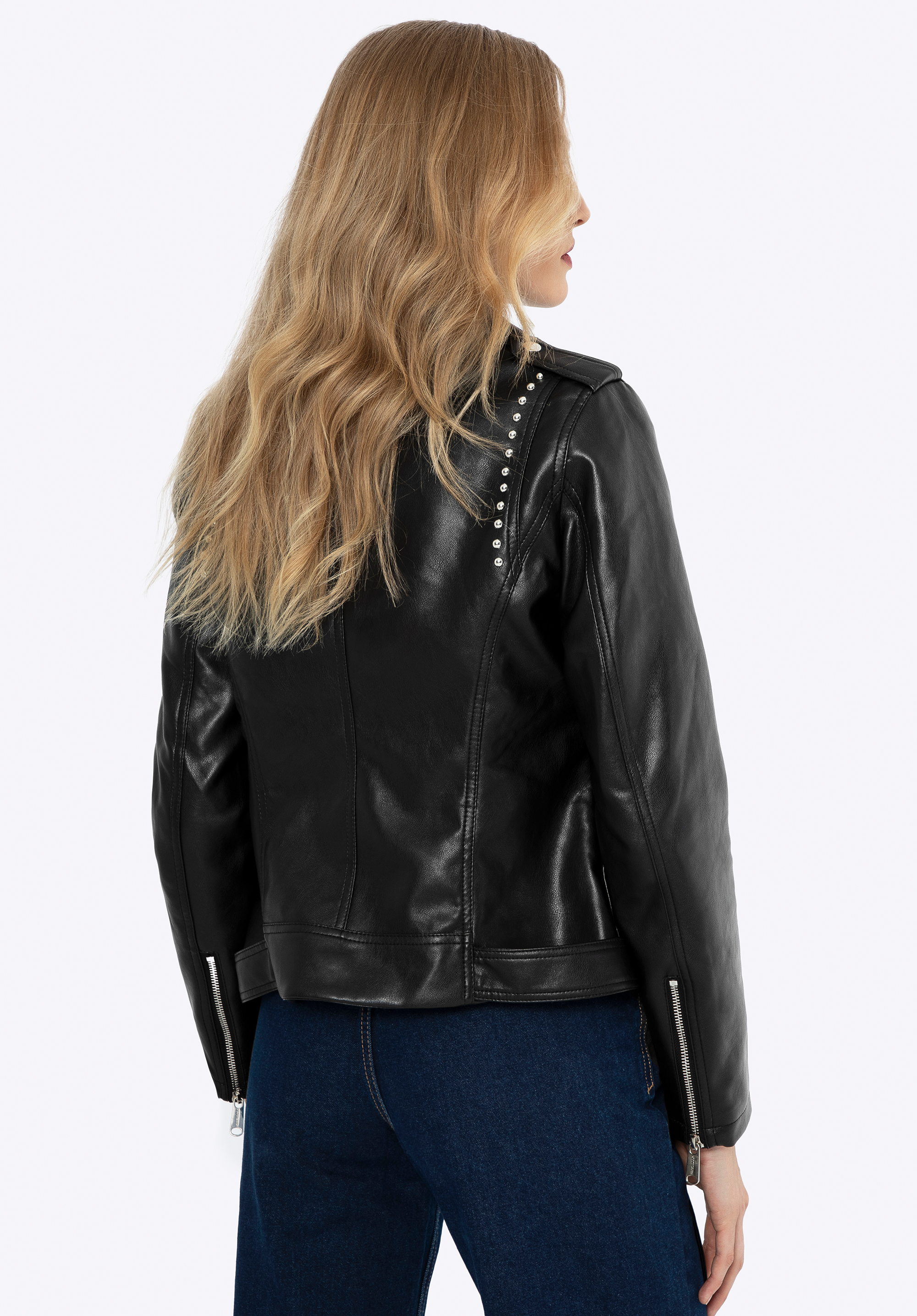 - Detaily: Dekoratívne nity na golieri dodávajú bunde výrazný rockový charakter.