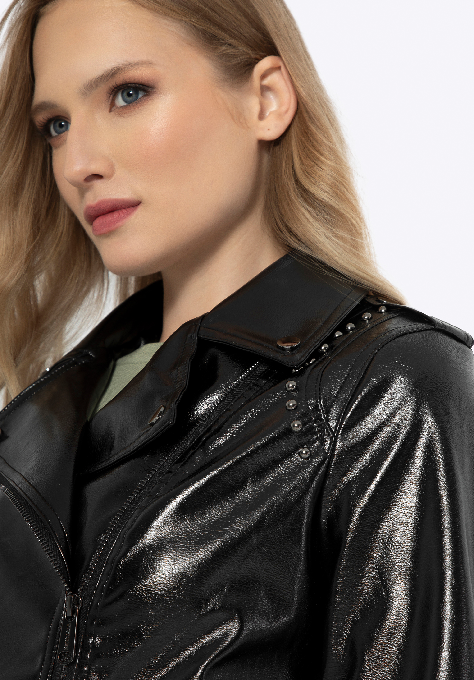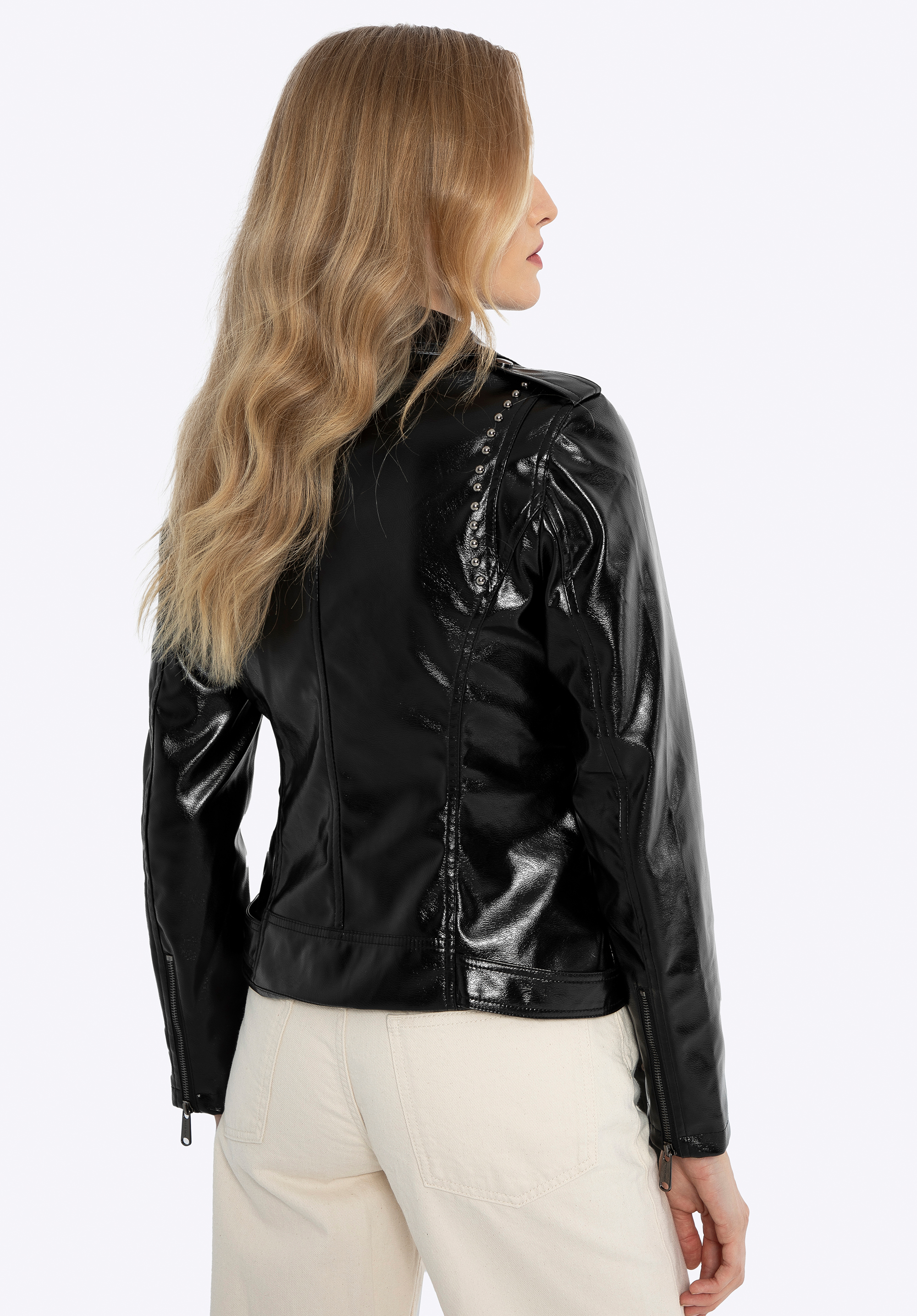 - Detaily: Dekoratívne nity na golieri dodávajú bunde výrazný rockový charakter.
