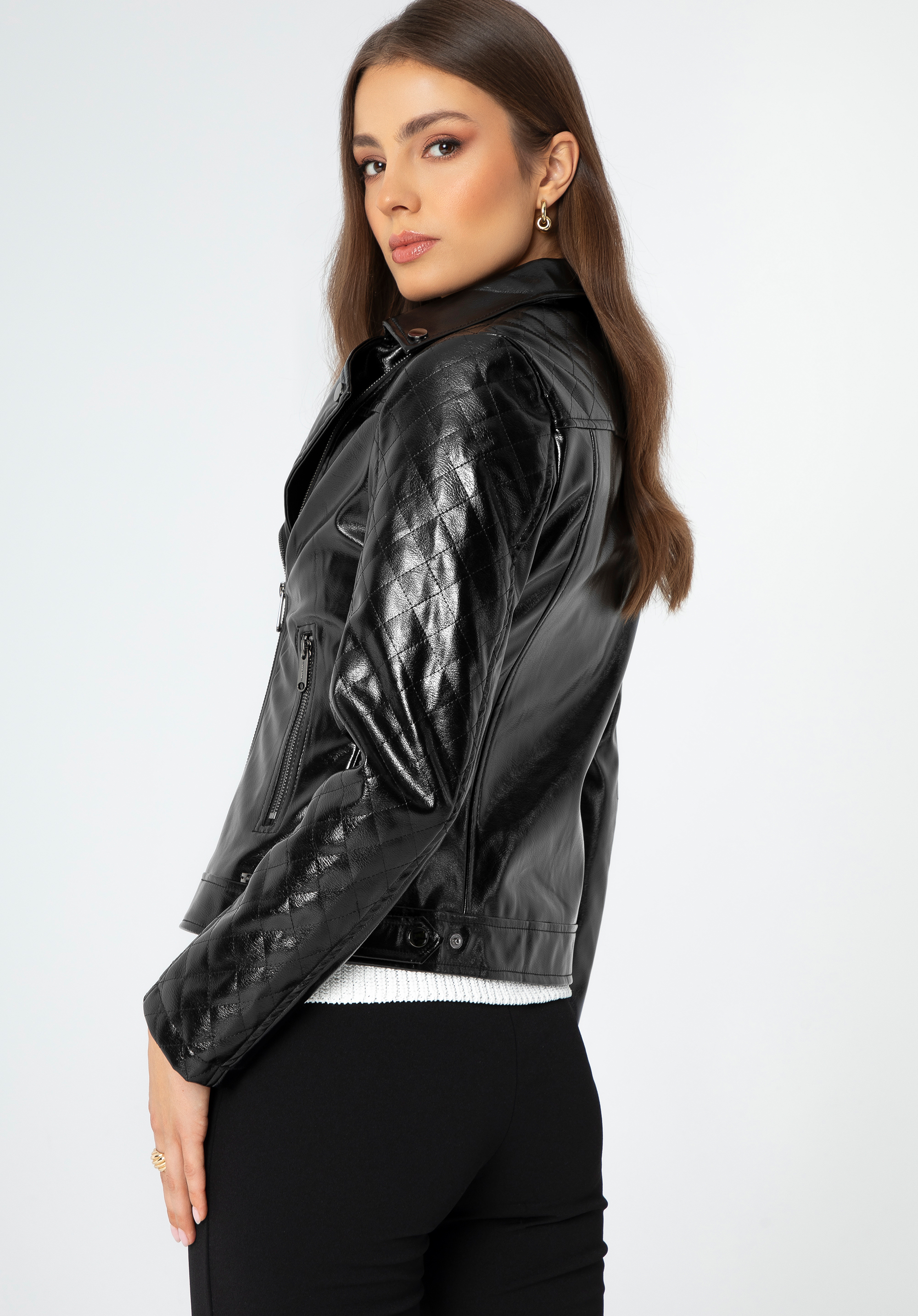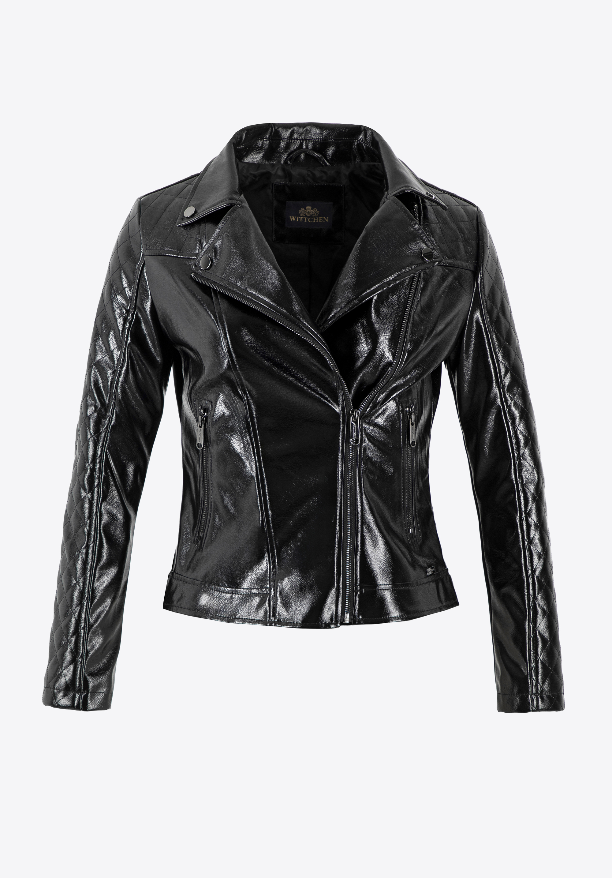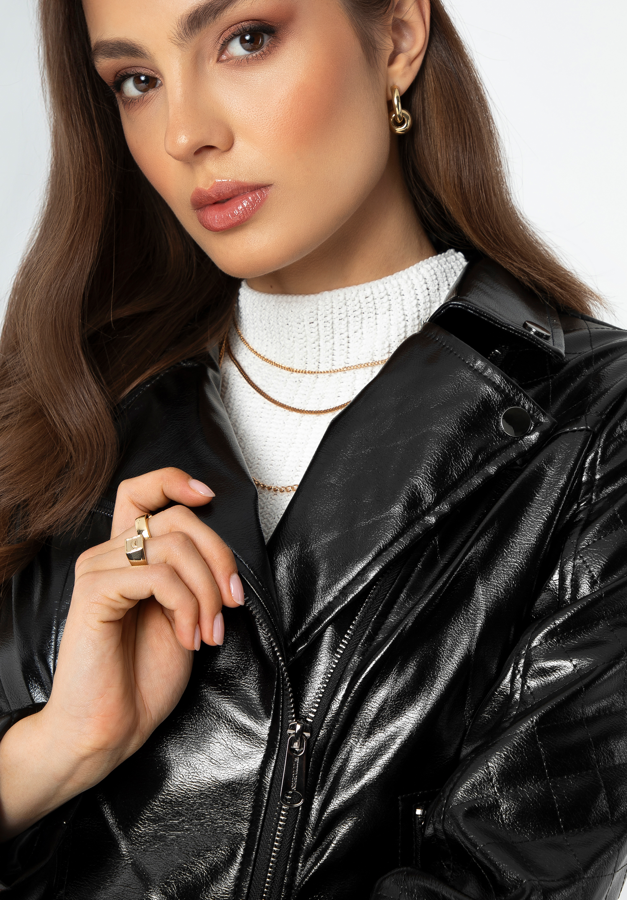 Vneste do vášho šatníka nádych rockového štýlu s našou dámskou ramoneskou z ekokože. Ozdobné patentné gombíky na golieri a prešívanie na ramenách obohacujú celok o jedinečné detaily, ktoré upútavajú pozornosť a zdôrazňujú individuálny štýl. Táto moderná a funkčná bunda je ideálnou voľbou pre každú ženu, ktorá si cení odvážne a elegantné módne riešenia.