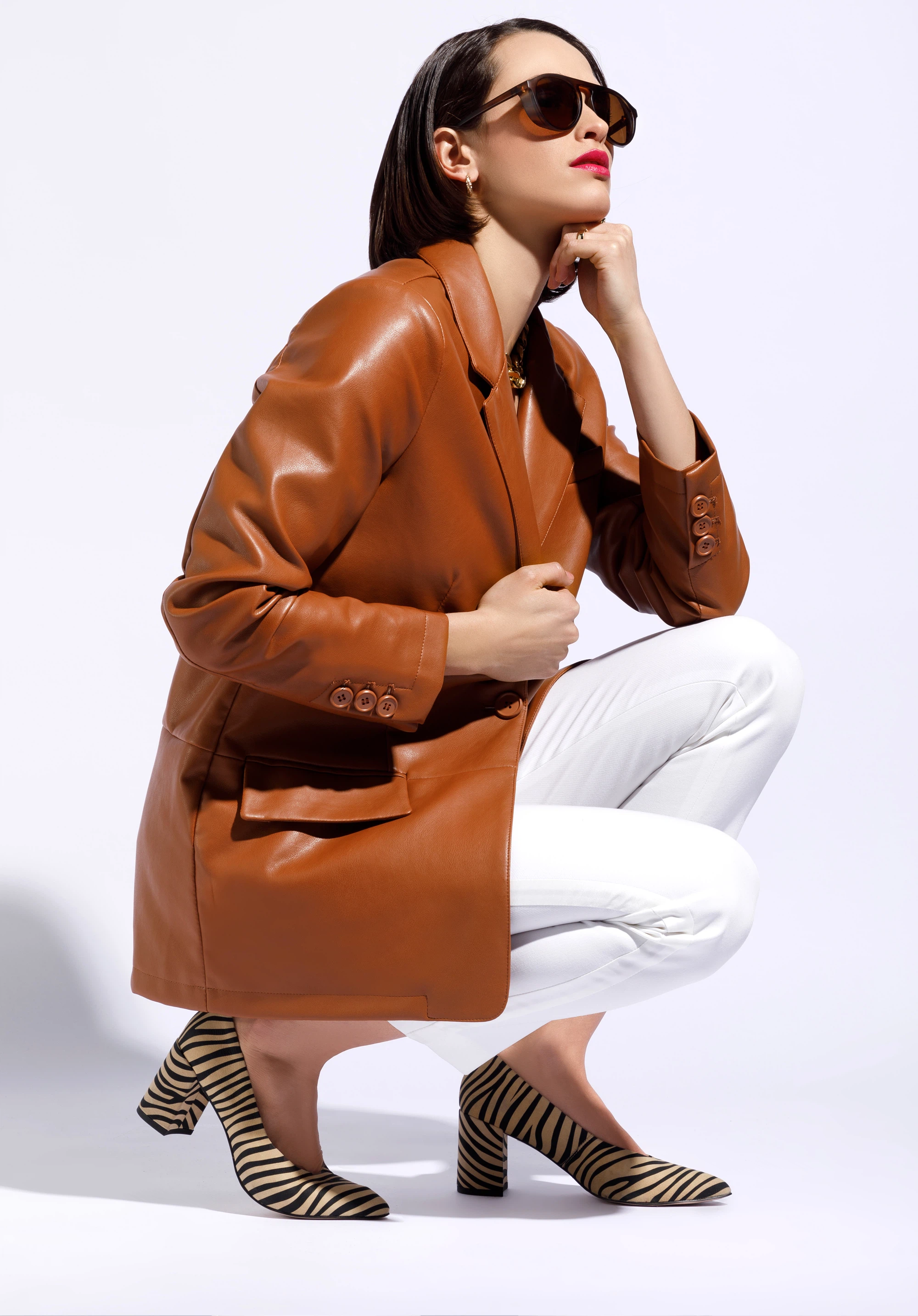 Jednoduchý strih s ozdobným rozparkom vzadu spestrí váš každý styling, a to nielen s obľúbenými džínsami, ale aj s koženou minisukňou. Jednoduché dámske sako z ekokože je nadčasový doplnok, ktorý môžete nosiť mnoho sezón.