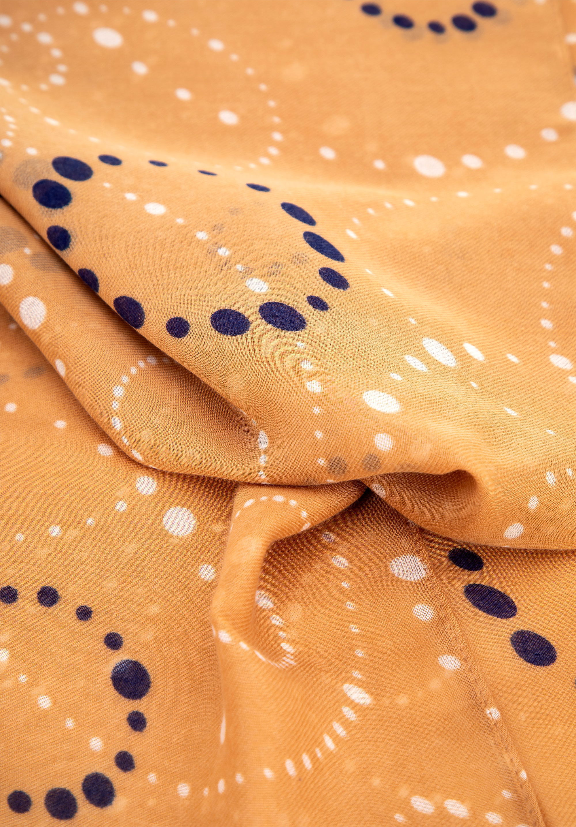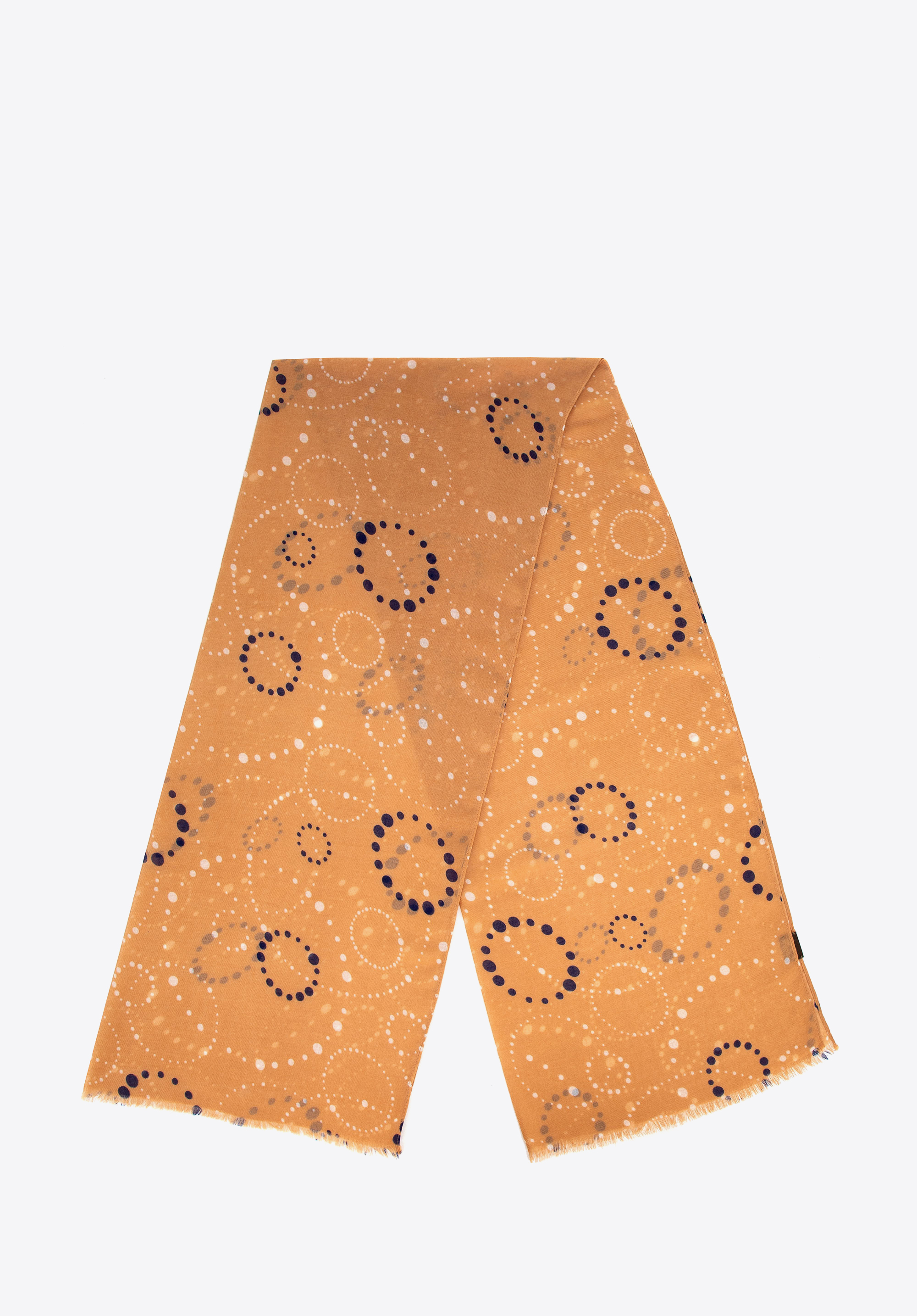 Tento jedinečný šál vyrobený z mäkkého a ľahkého polyesteru sa pýši výnimočným dizajnom. Geometrické kruhy z drobných bodiek vytvárajú harmonický vzor, ktorý ľahko doplní ležérne outfity aj sofistikovanejšie komplety.