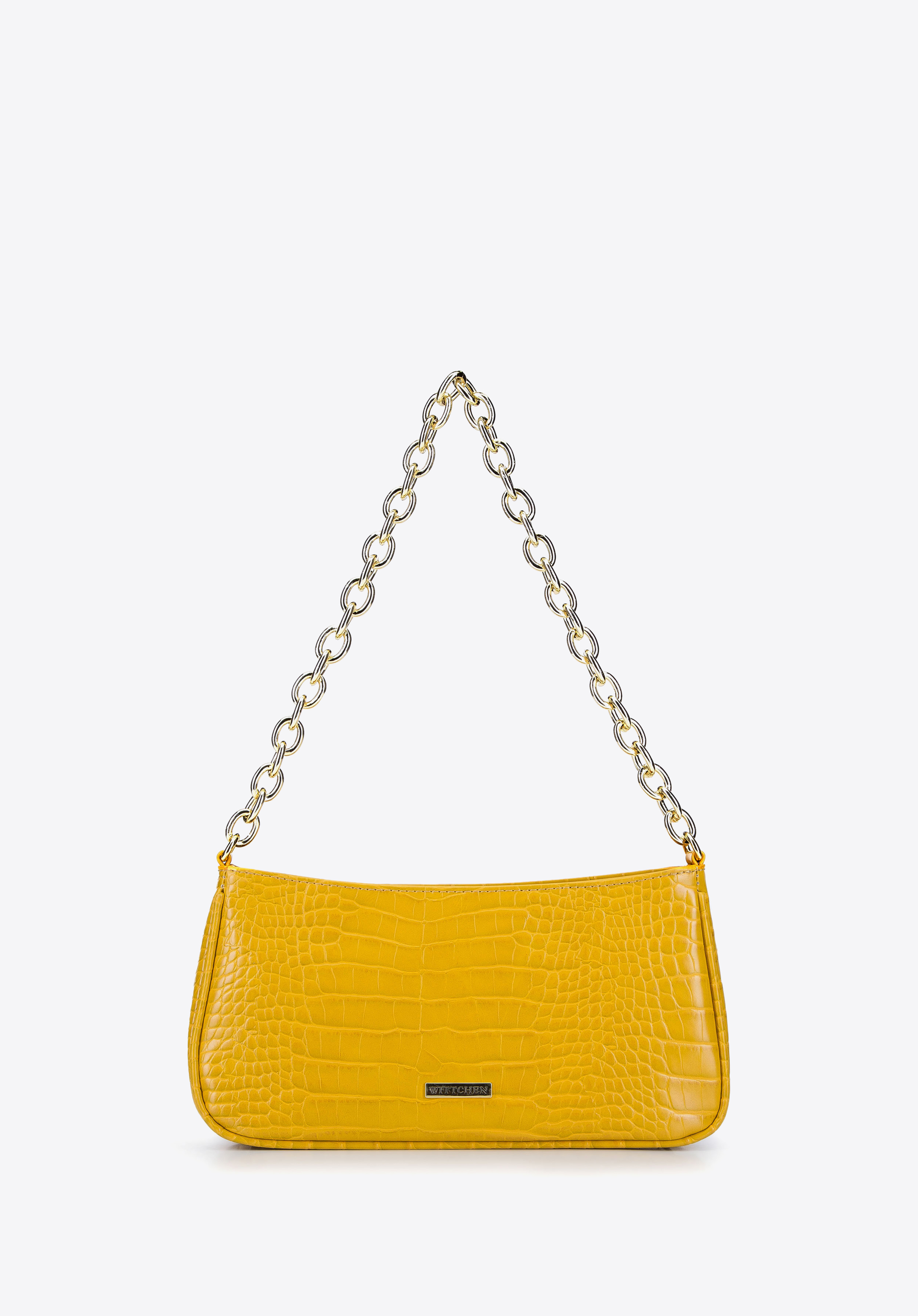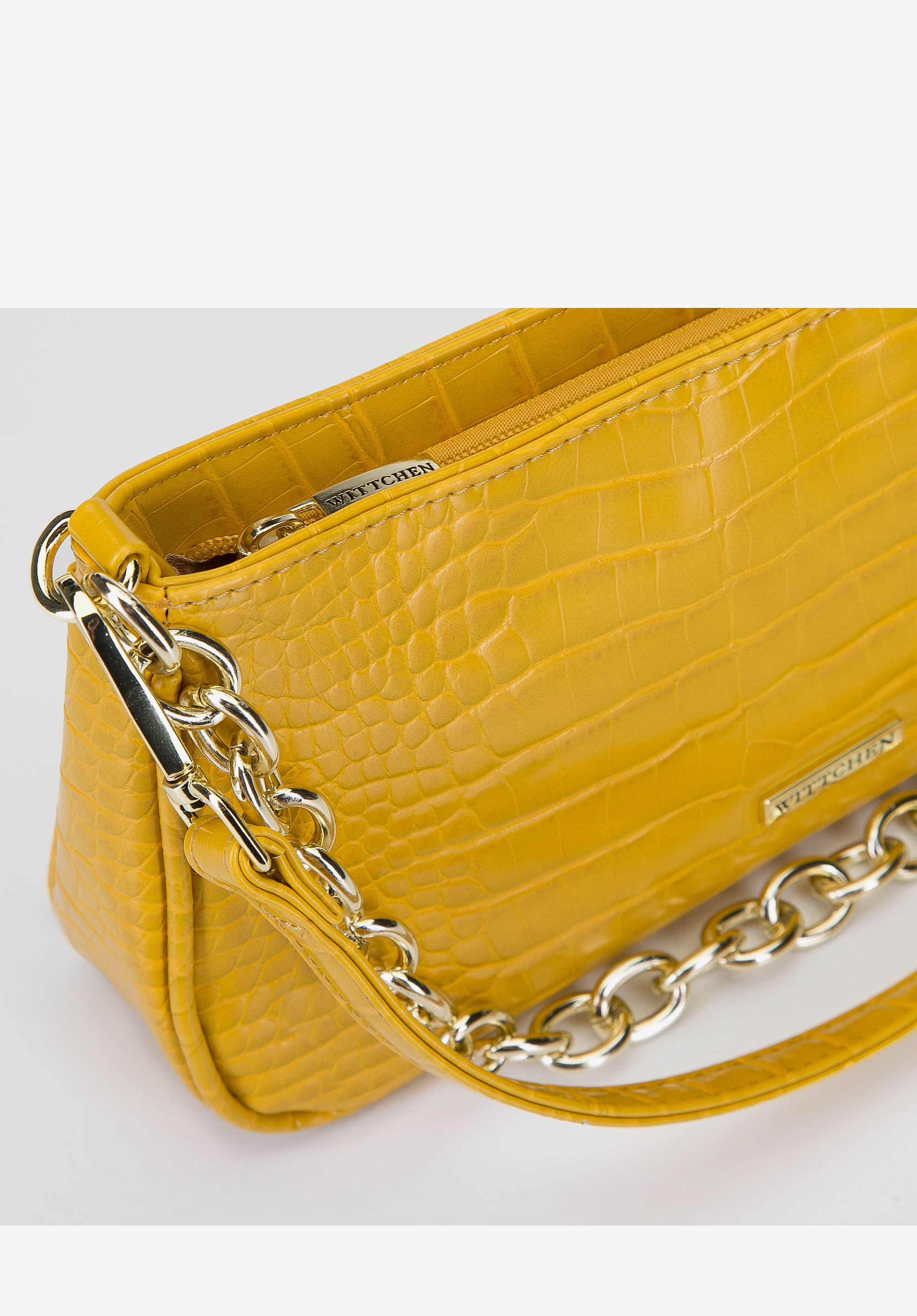 Malá kabelka typu baguette s podlhovastým tvarom a očarujúcim motívom imitujúcim krokodíliu kožu - dodá vašim outfitom osobitý charakter. Vynikajúcej kvality ekokoža pripomína prírodnú kožu, ľahko sa čistí, je mäkká a ľahká. Vzhľad kabelky je obohatený o zlaté prvky vrátane reťaze, ktorá dodáva celej taške rockový štýl.Model má tak akurátnu veľkosť, aby sa doň zmestili všetky dámske nevyhnutnosti, napríklad veľká peňaženka, slnečné okuliare, púder a mobilný telefón. Dámska kabelka typu baguette na retiazke bude ideálna na každodenné nosenie aj na výnimočné príležitosti.