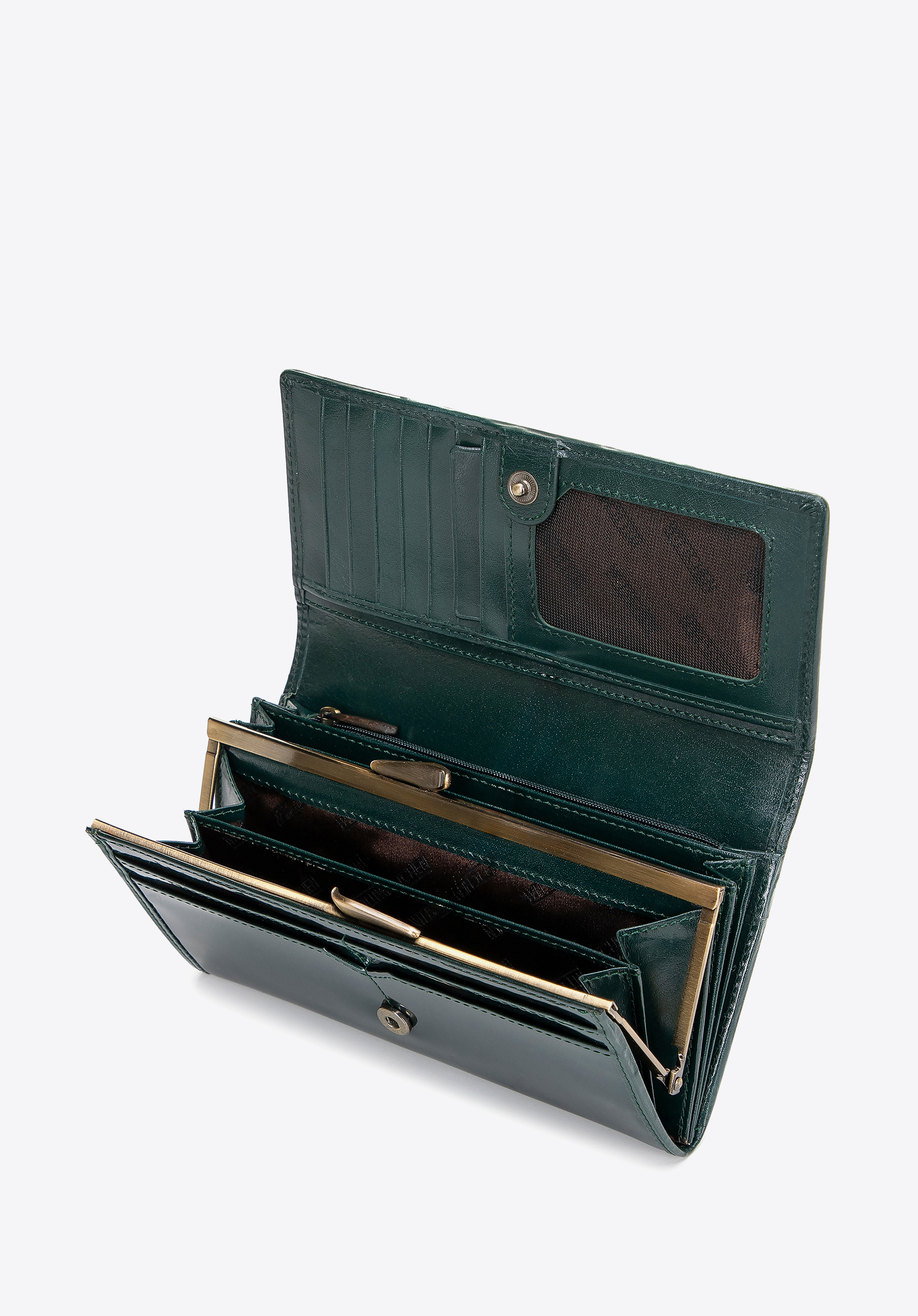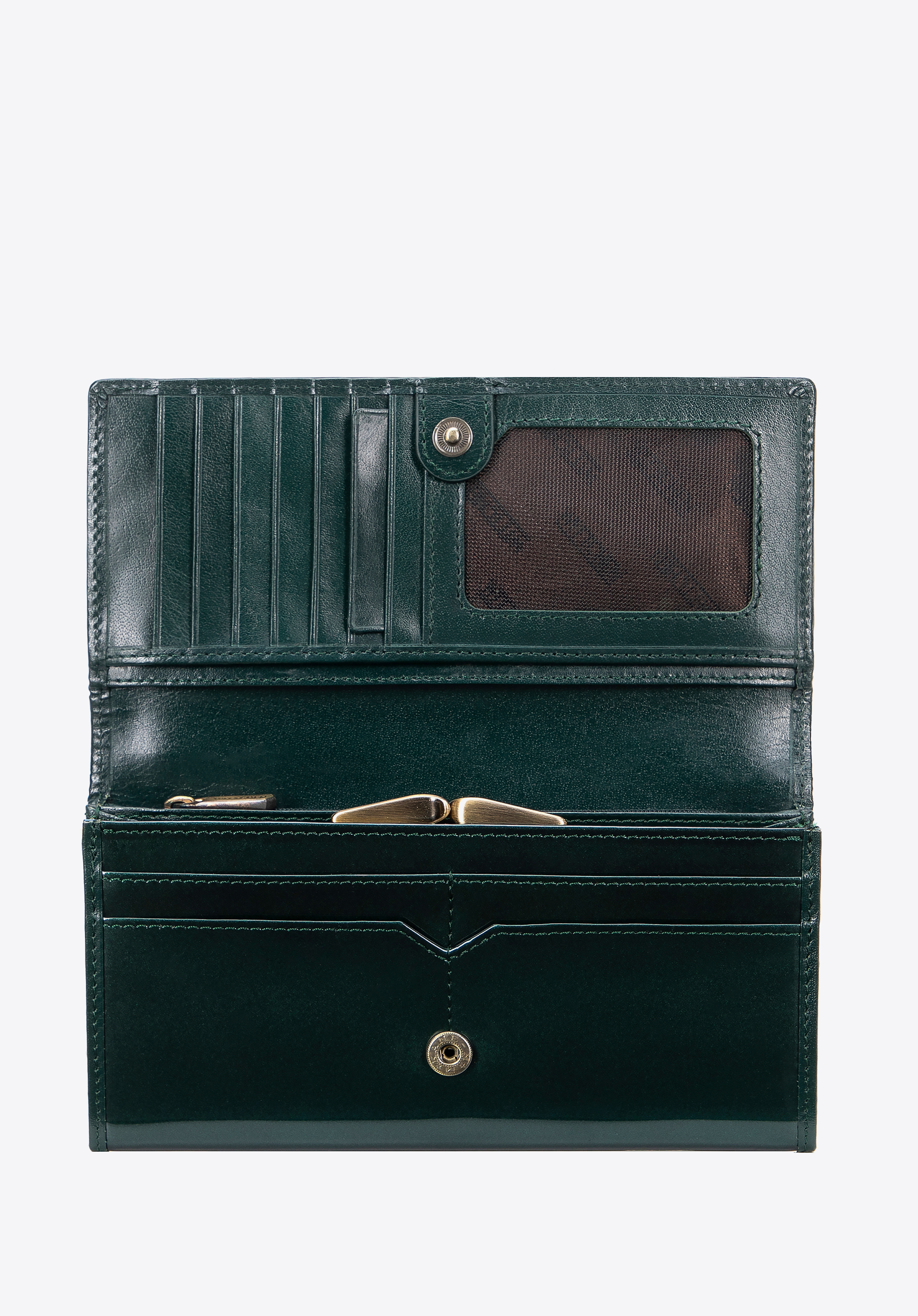 - Premyslená organizácia: Peňaženka obsahuje 3 priehradky na bankovky, 12 priehradiek na karty a 6 vreciek, vrátane 2 priehradiek na zips a priehradky na mince zaistené elegantnou sponou.