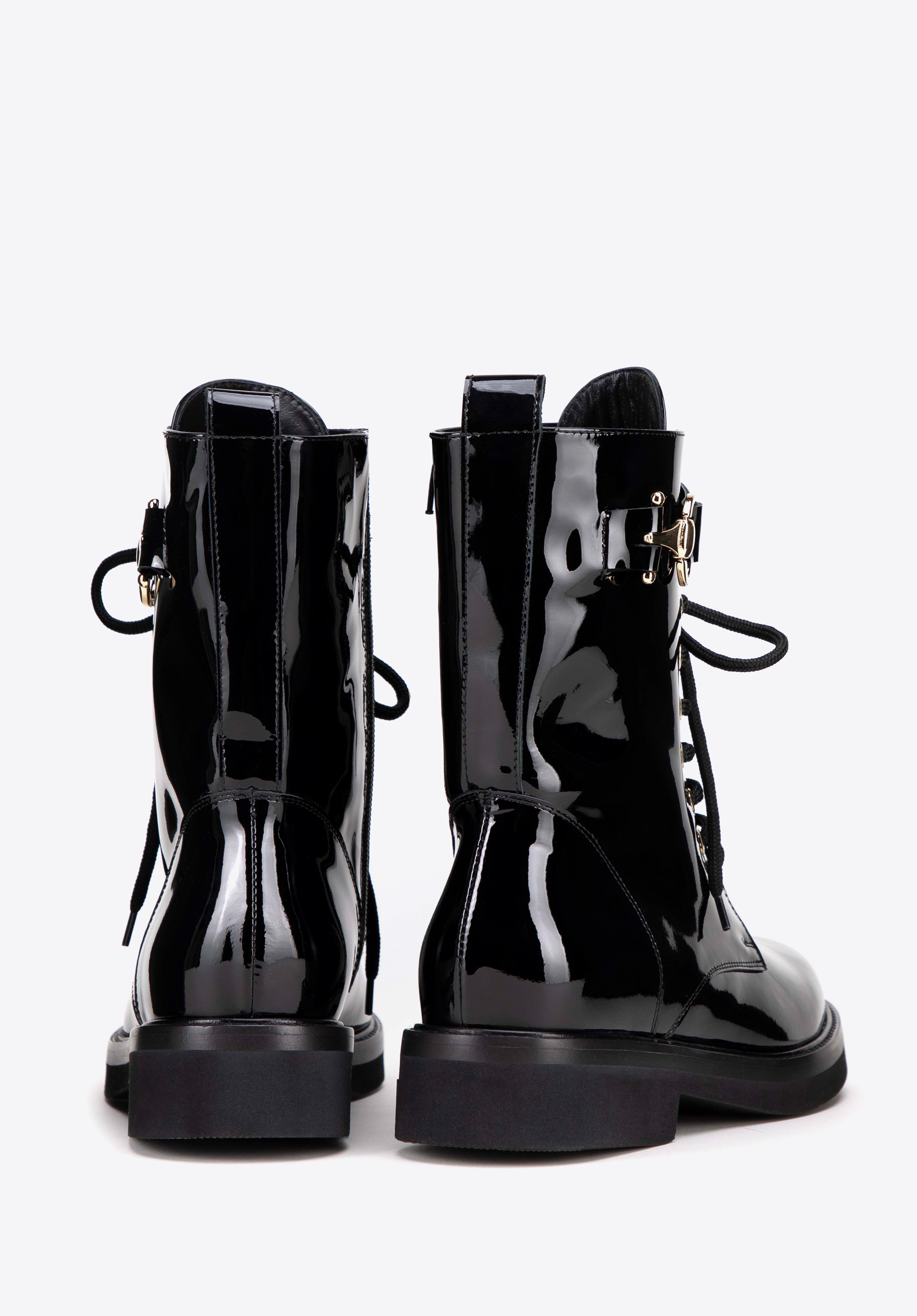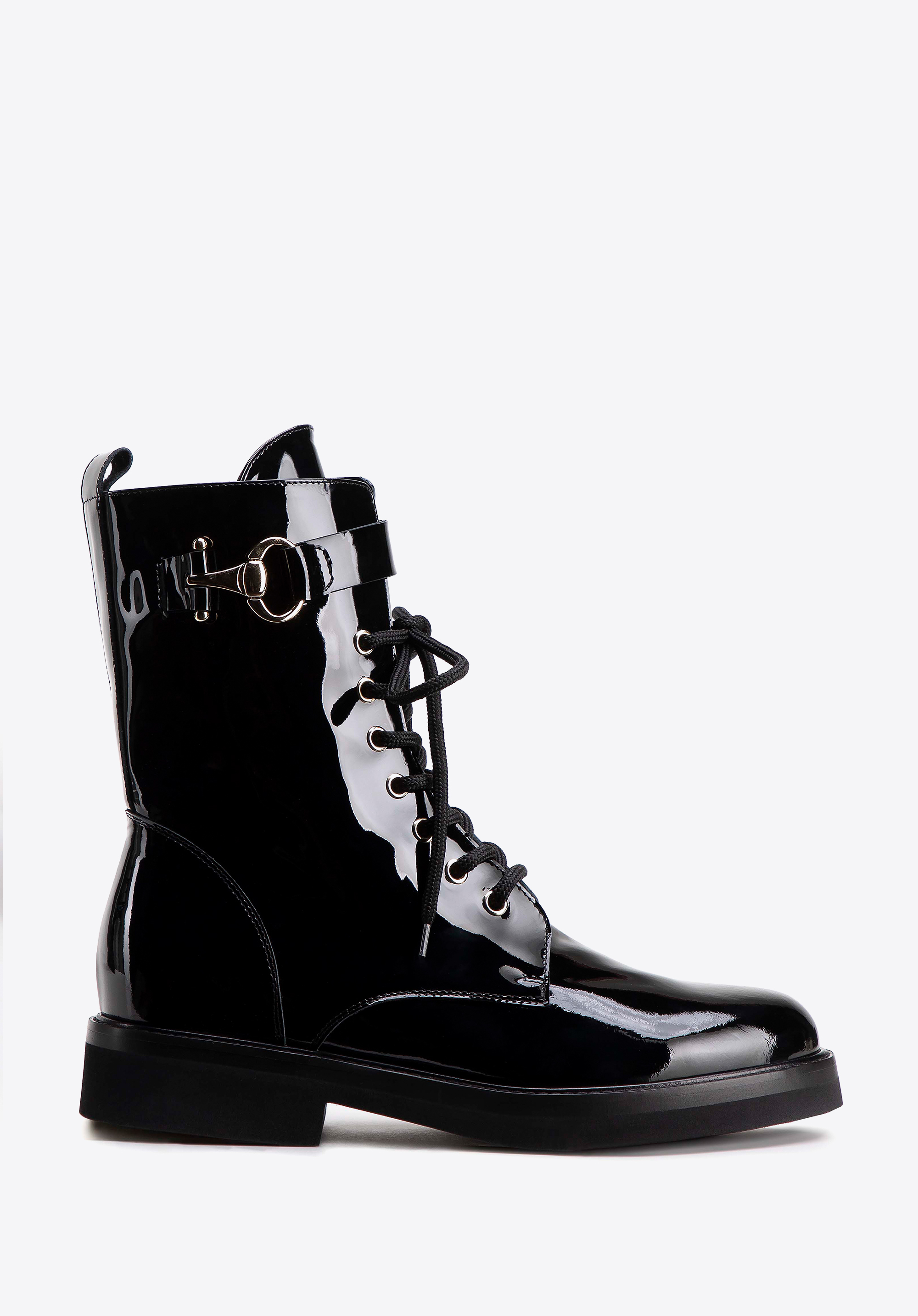 - Materiál: Členkové čižmy sú vyrobené z lakovanej prírodnej kože, ktorá im dodáva elegantný a lesklý vzhľad a zaisťuje trvanlivosť a jednoduché čistenie.