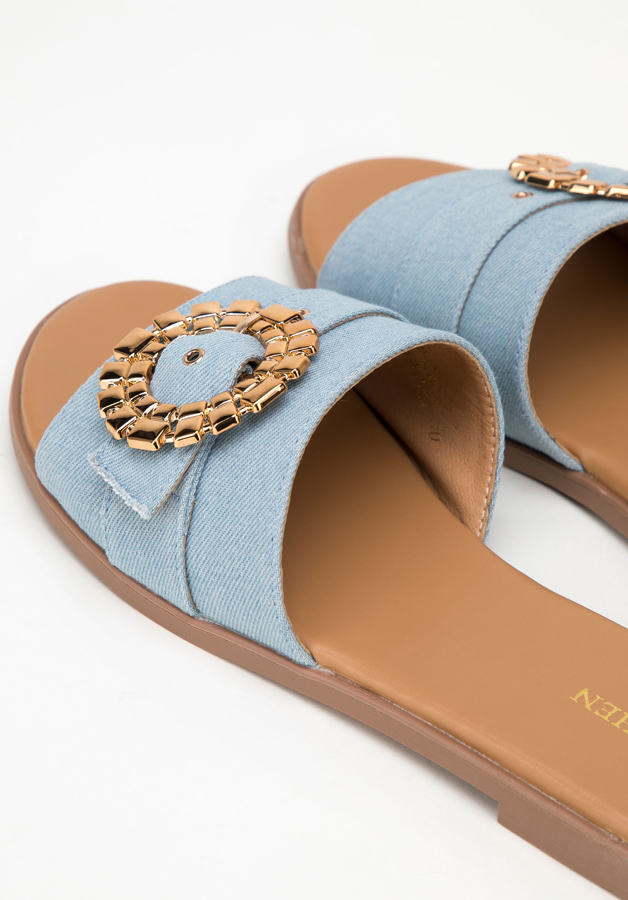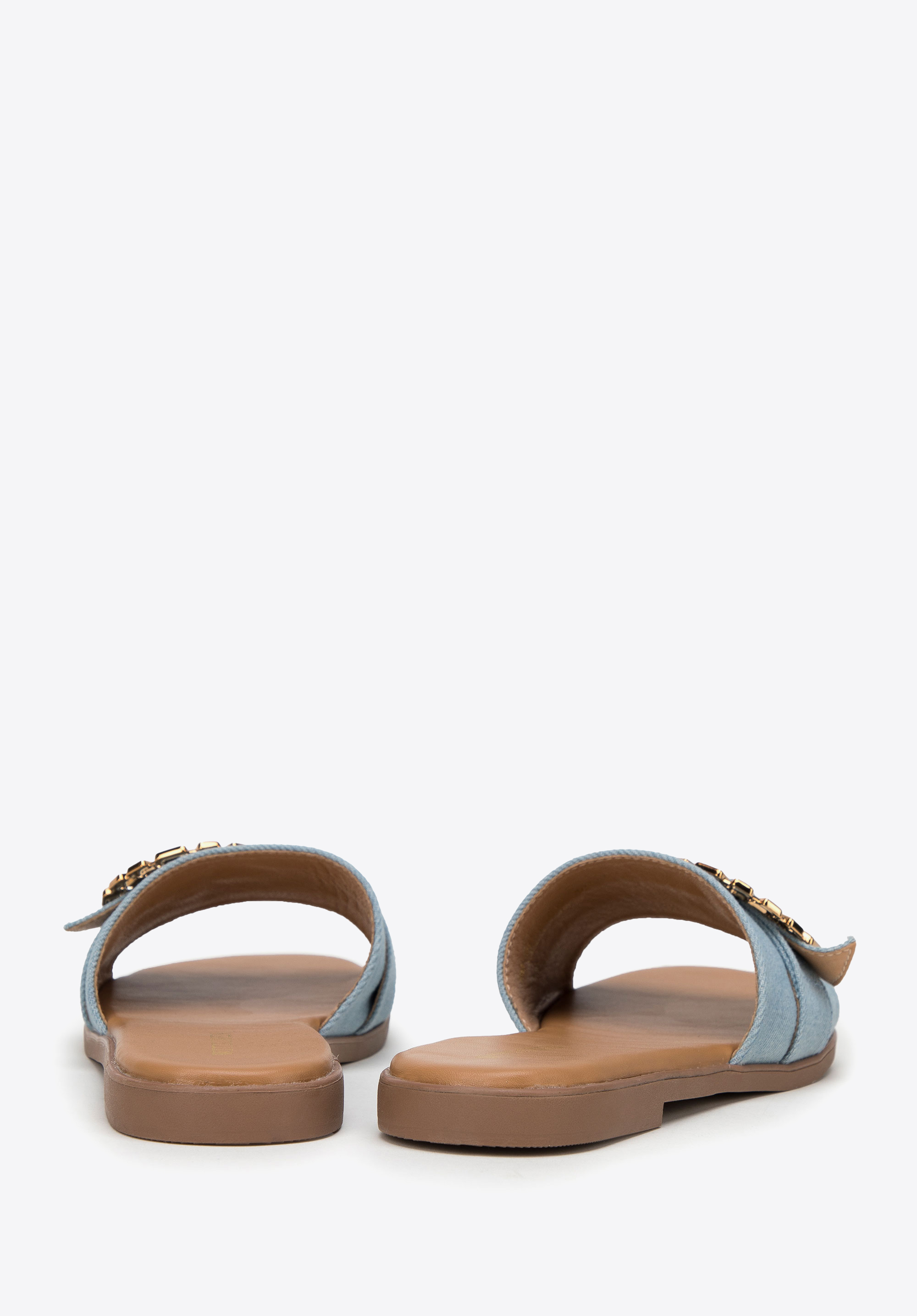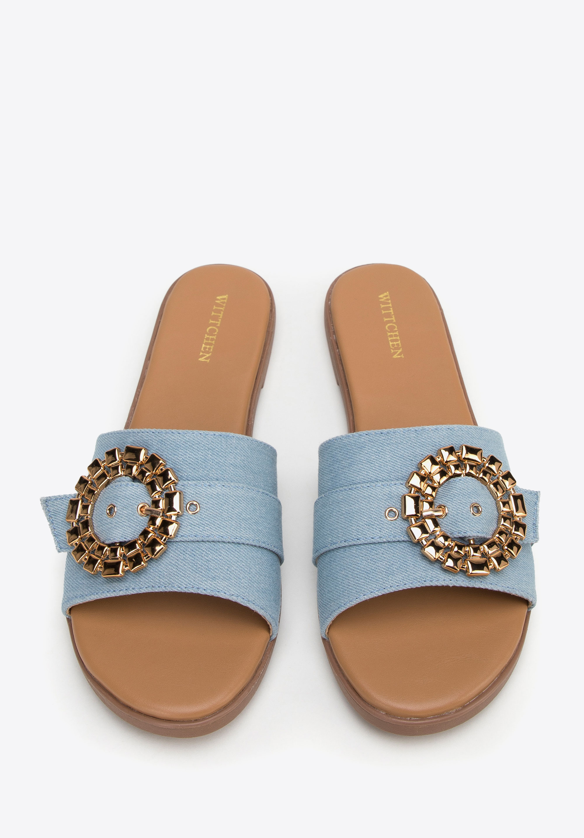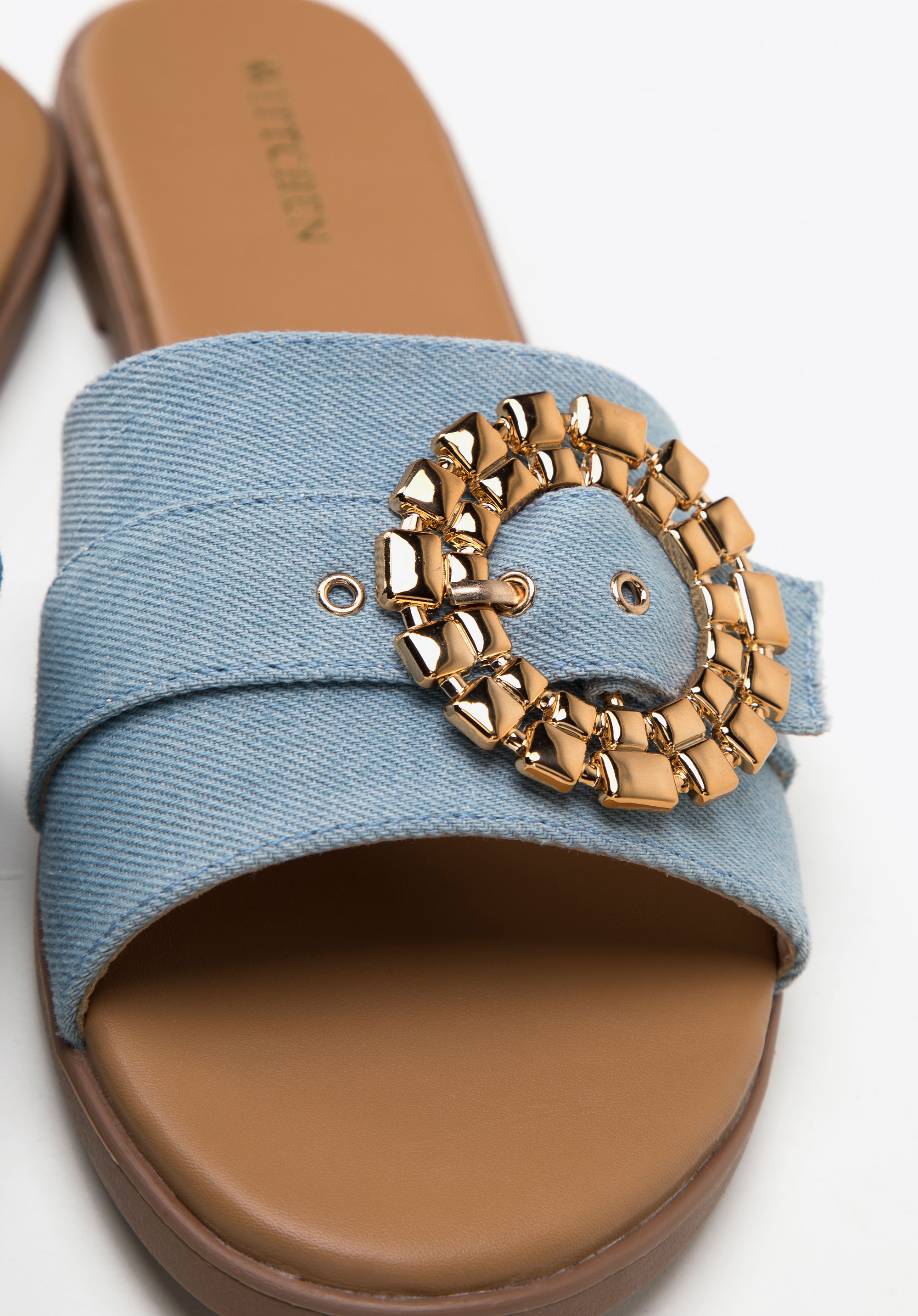 Hrubý remienok je ozdobený okrúhlou, lesklou prackou so zapínaním. Rozhodnite sa pre total look a oblečte si ich k džínsovým šatám alebo ich skombinujte s obľúbenými šortkami a tričkom, aby ste im dodali výraz. Dámske džínsové šľapky s lesklou prackou sú skvelou voľbou pre milovníčky módnych doplnkov.