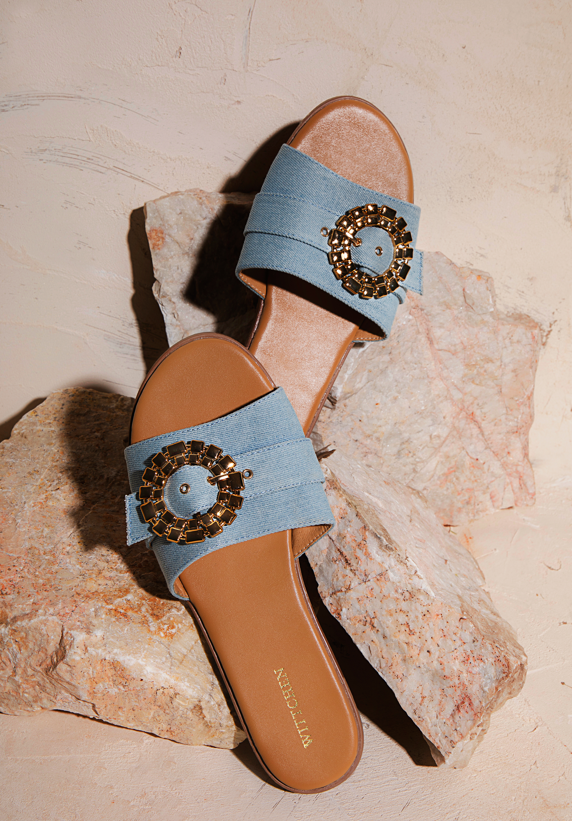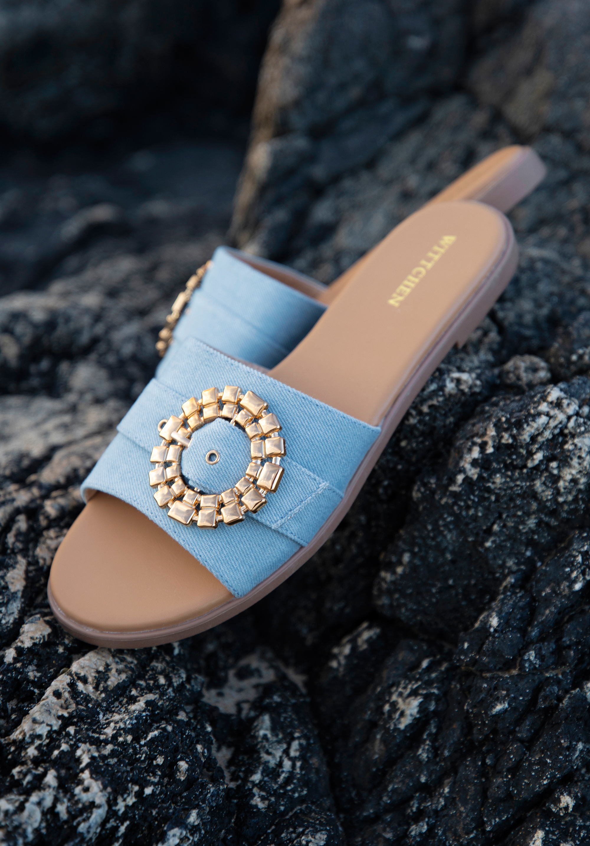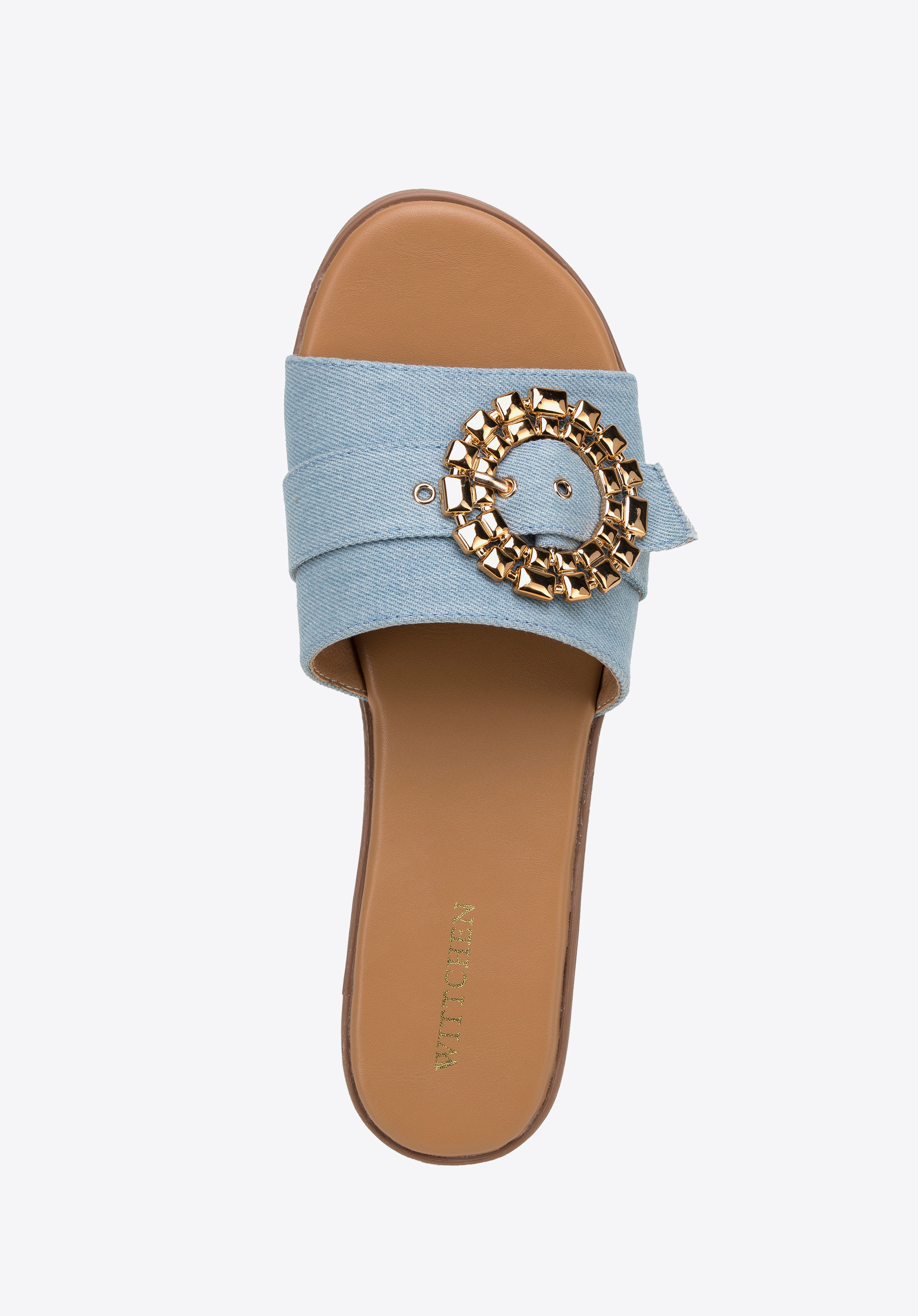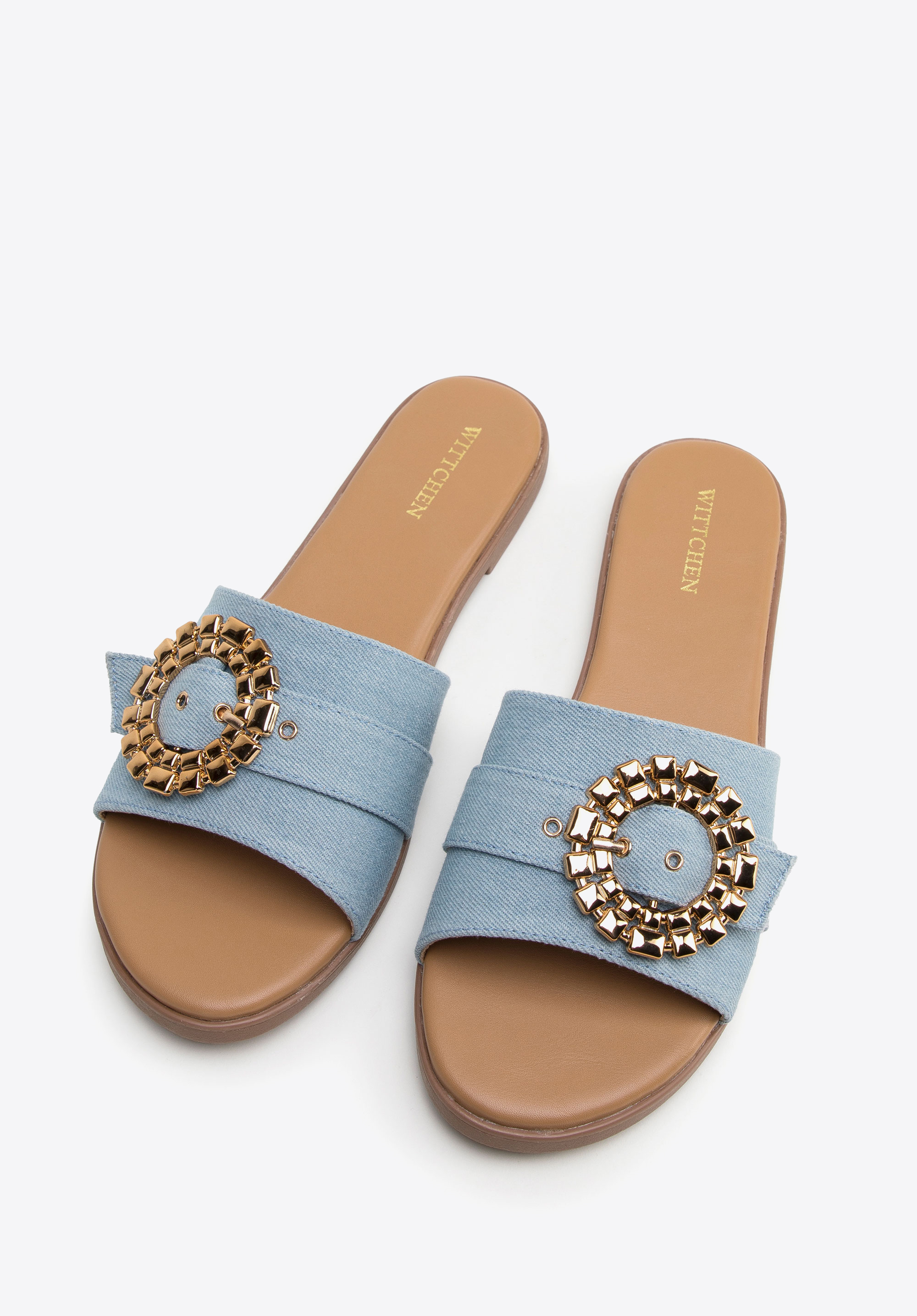Hrubý remienok je ozdobený okrúhlou, lesklou prackou so zapínaním. Rozhodnite sa pre total look a oblečte si ich k džínsovým šatám alebo ich skombinujte s obľúbenými šortkami a tričkom, aby ste im dodali výraz. Dámske džínsové šľapky s lesklou prackou sú skvelou voľbou pre milovníčky módnych doplnkov.