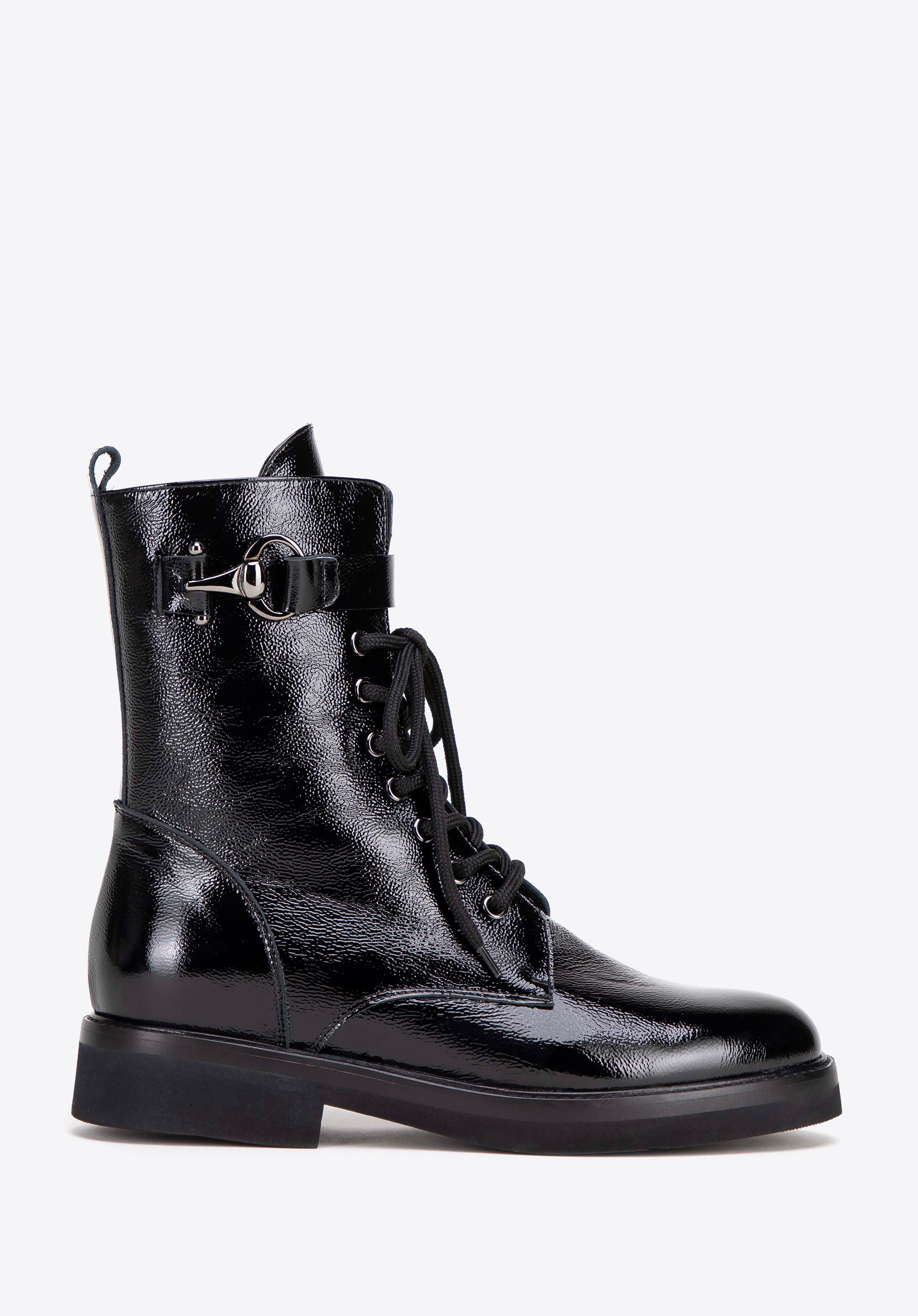 Tieto členkové čižmy sú elegantnou a štýlovou obuvou, ktorá je ideálna na chladnejšie dni a k rozmanitým štylizáciám. Vyrobené z veľmi kvalitnej kože, zapínané na bočný zips a navyše šnurované, zaisťujú perfektné prispôsobenie nohe a pohodlie pri nosení. Jemný mandľový nos dodáva topánkam decentný celkový vzhľad. Dodatočný dekoratívny remienok na gumičke s ozdobným kovovým prvkom poskytuje obuvi výraz a originalitu.
