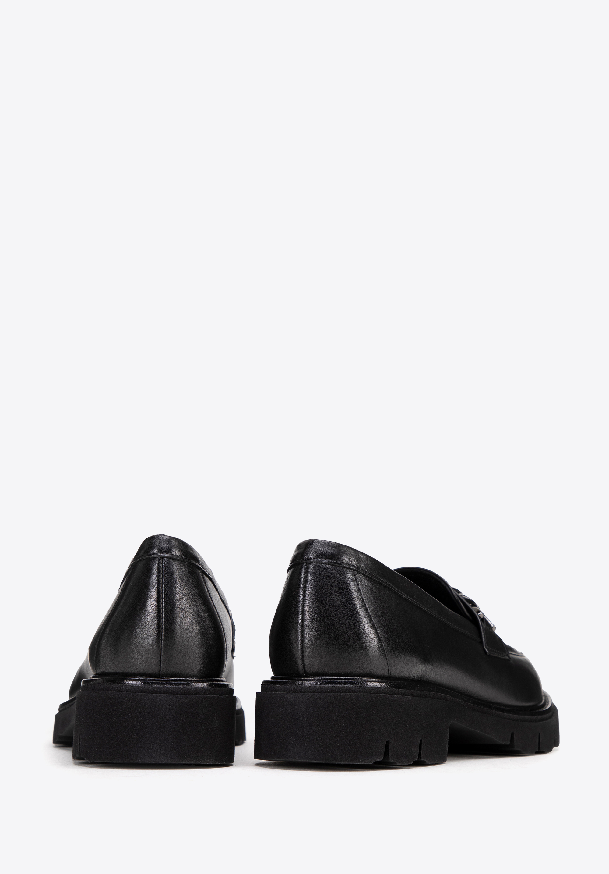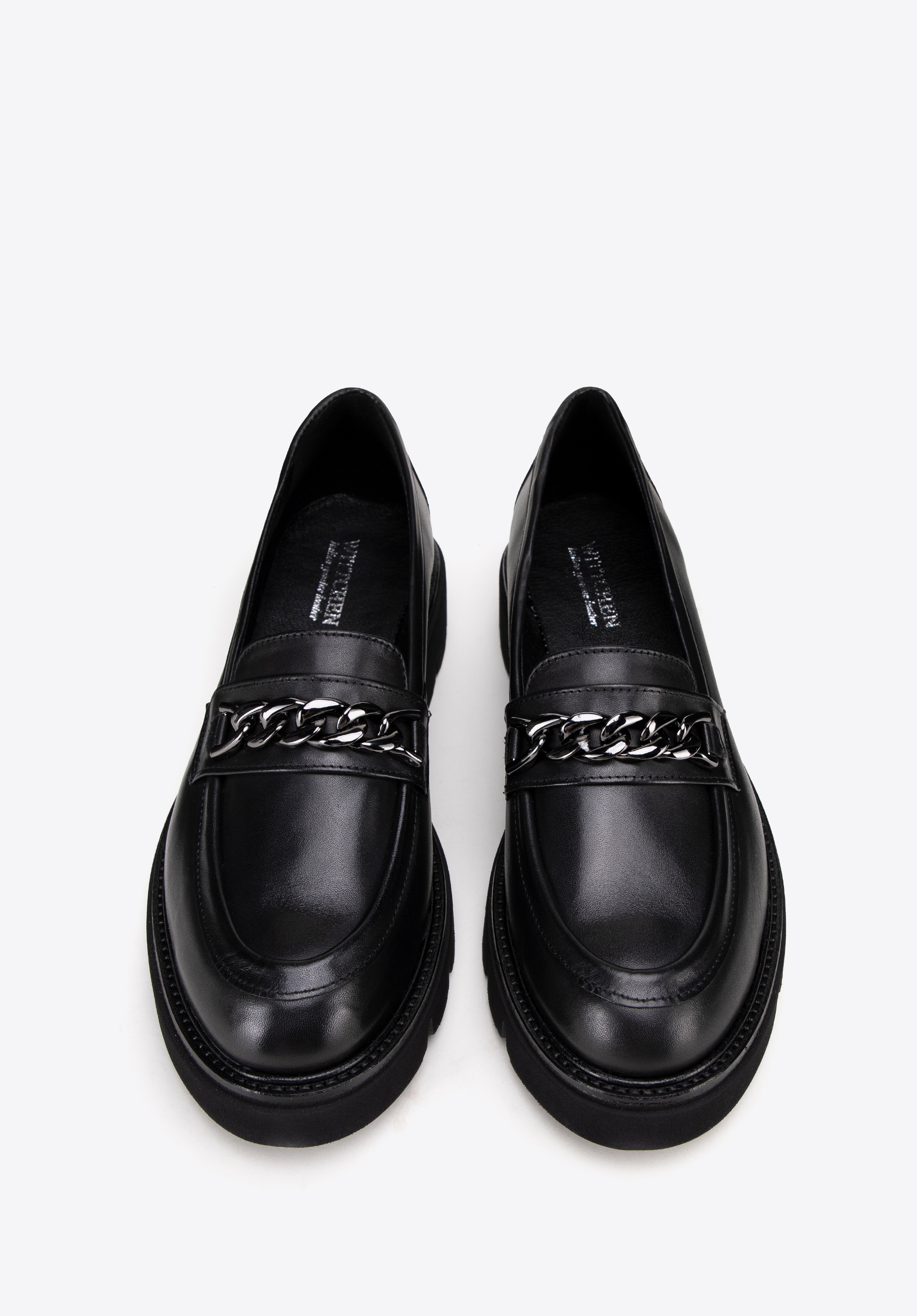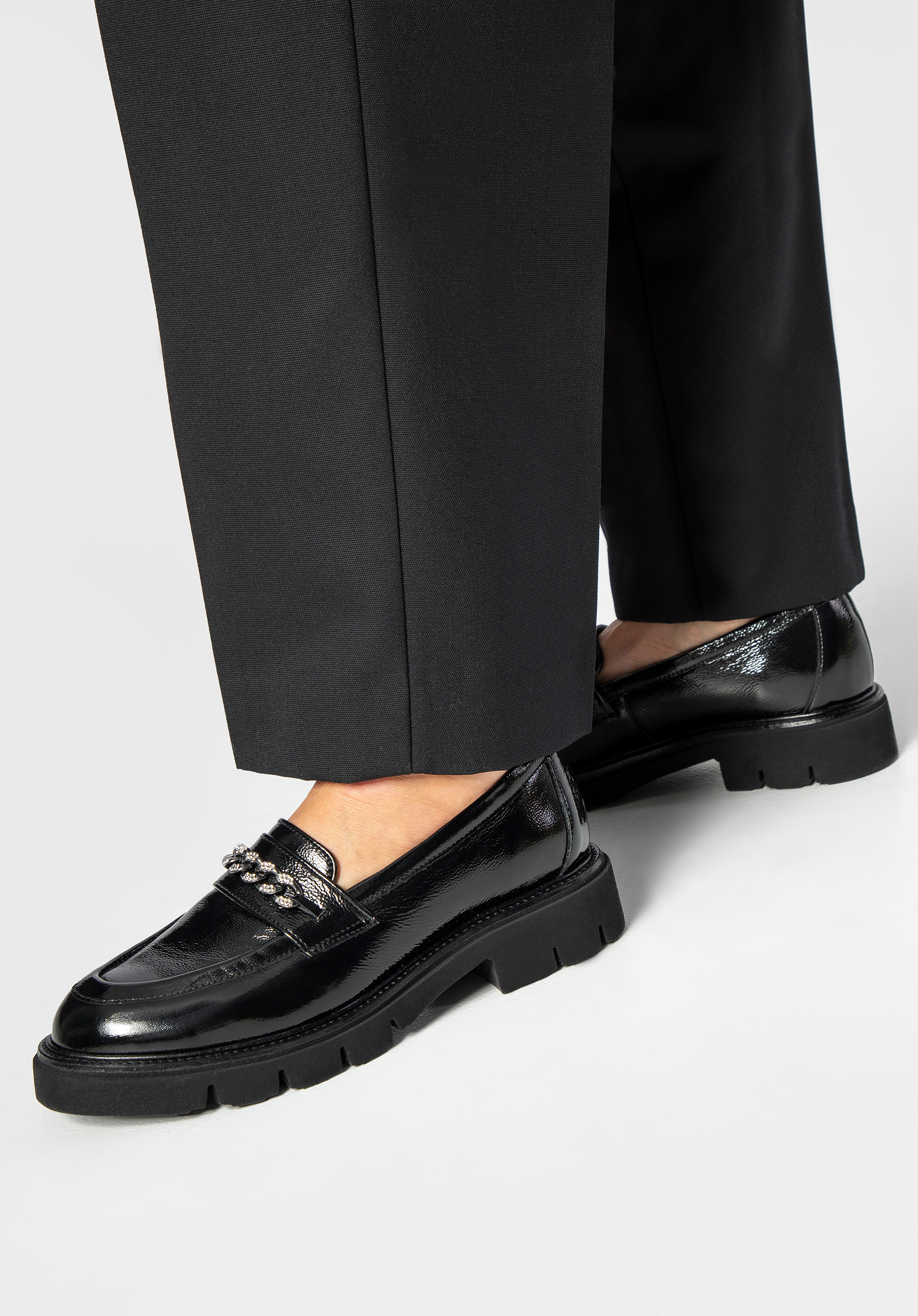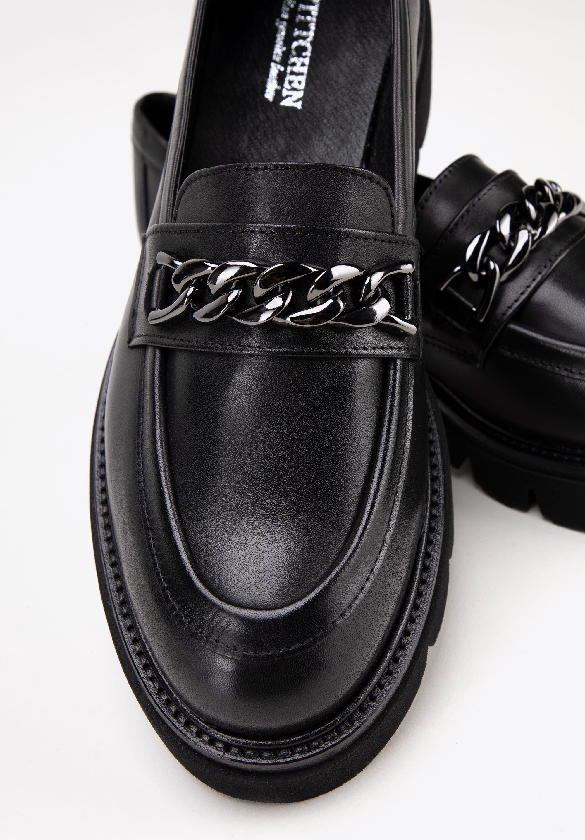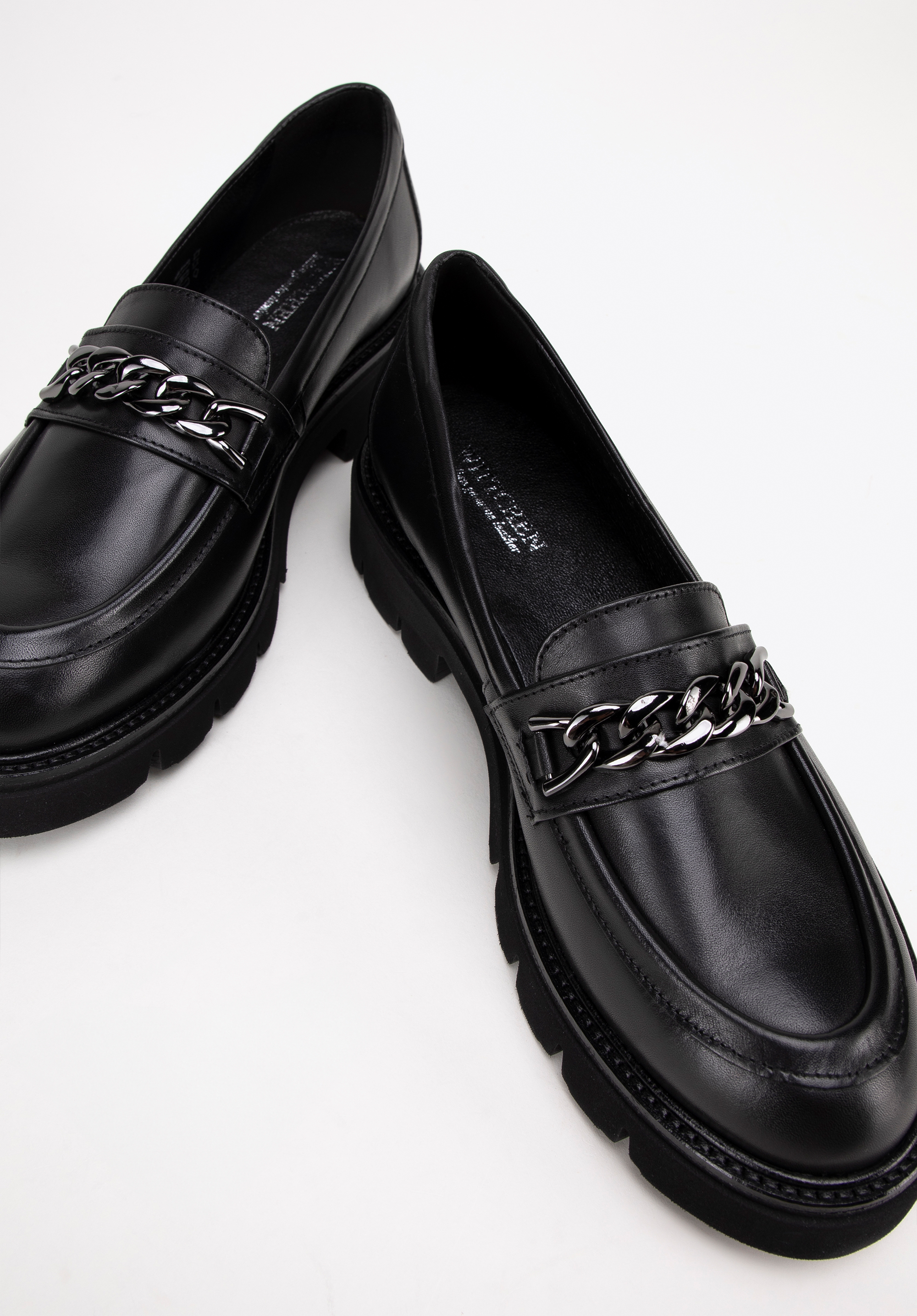 Objavte eleganciu a pohodlie v jednom s našimi mokasínami vyrobenými z najkvalitnejšej kože . Tieto topánky s plochým podpätkom , mandľovou špičkou a ozdobnou retiazkou na zvršku spájajú moderný štýl s nádychom luxusu. Pevná podrážka zaisťuje stabilitu a pohodlie, čo vám umožní vychutnať si každý krok bez obáv z nepohodlia. Mandľová špička opticky predlžuje nohy a dodáva každému outfitu jemný šarm.