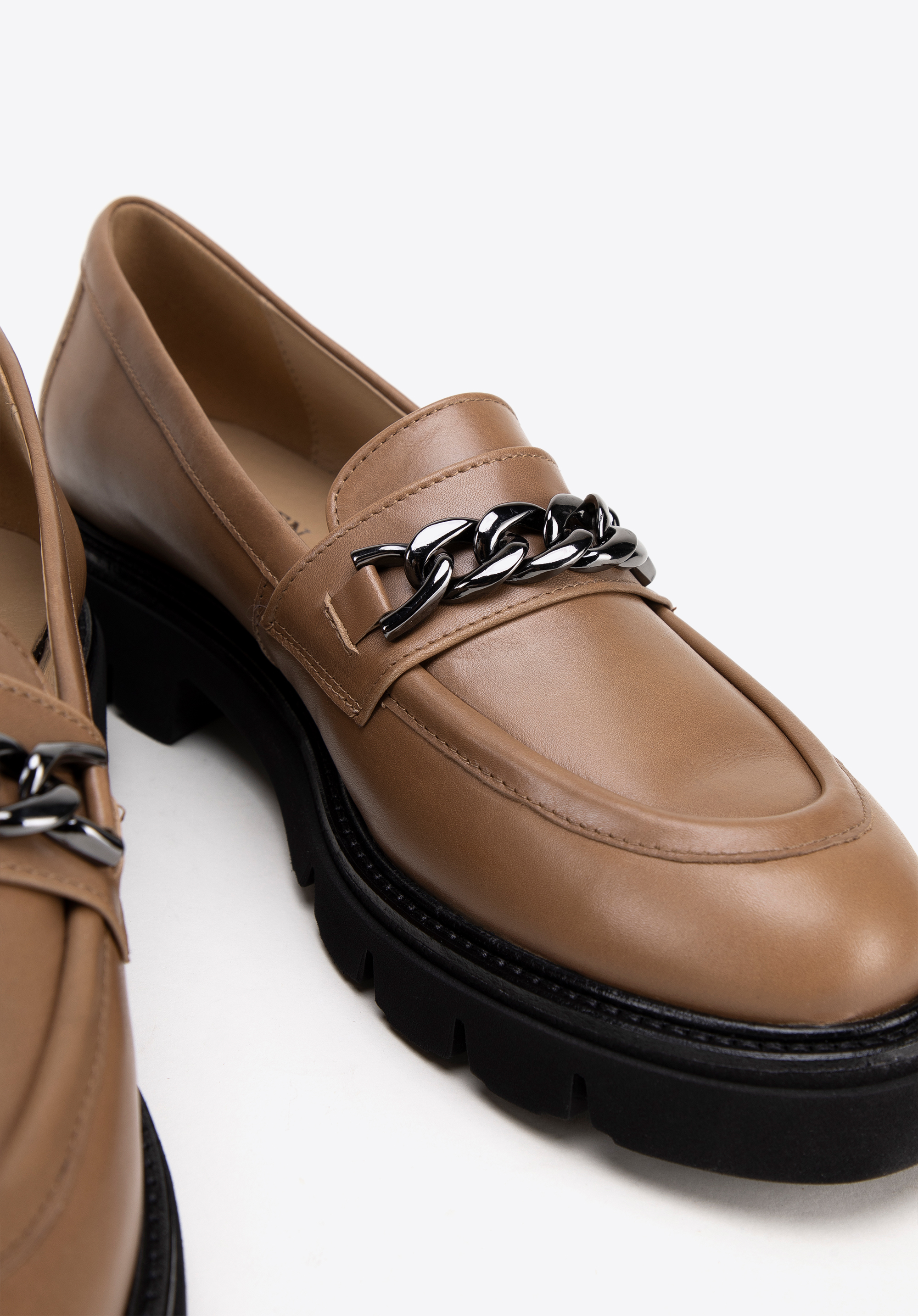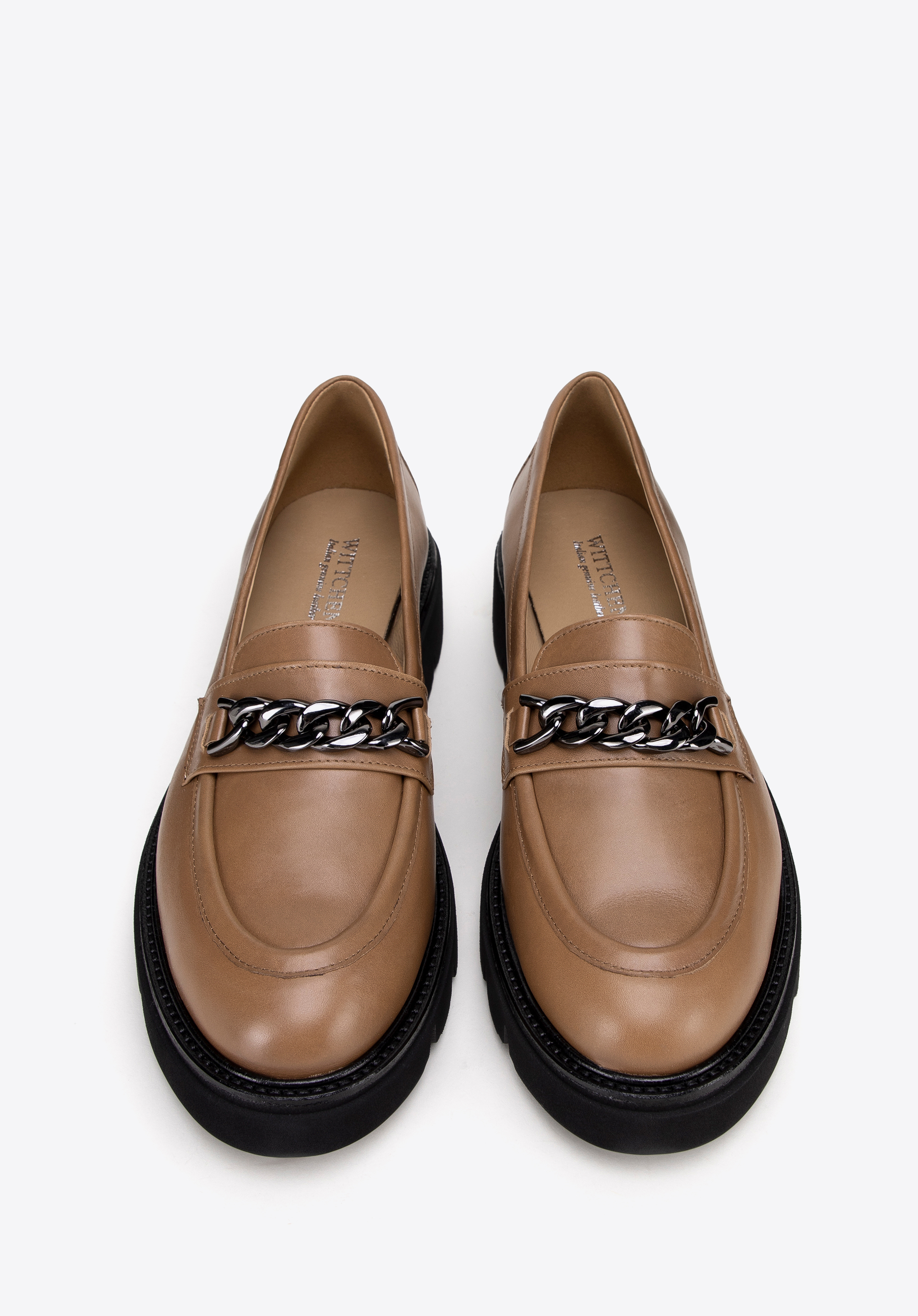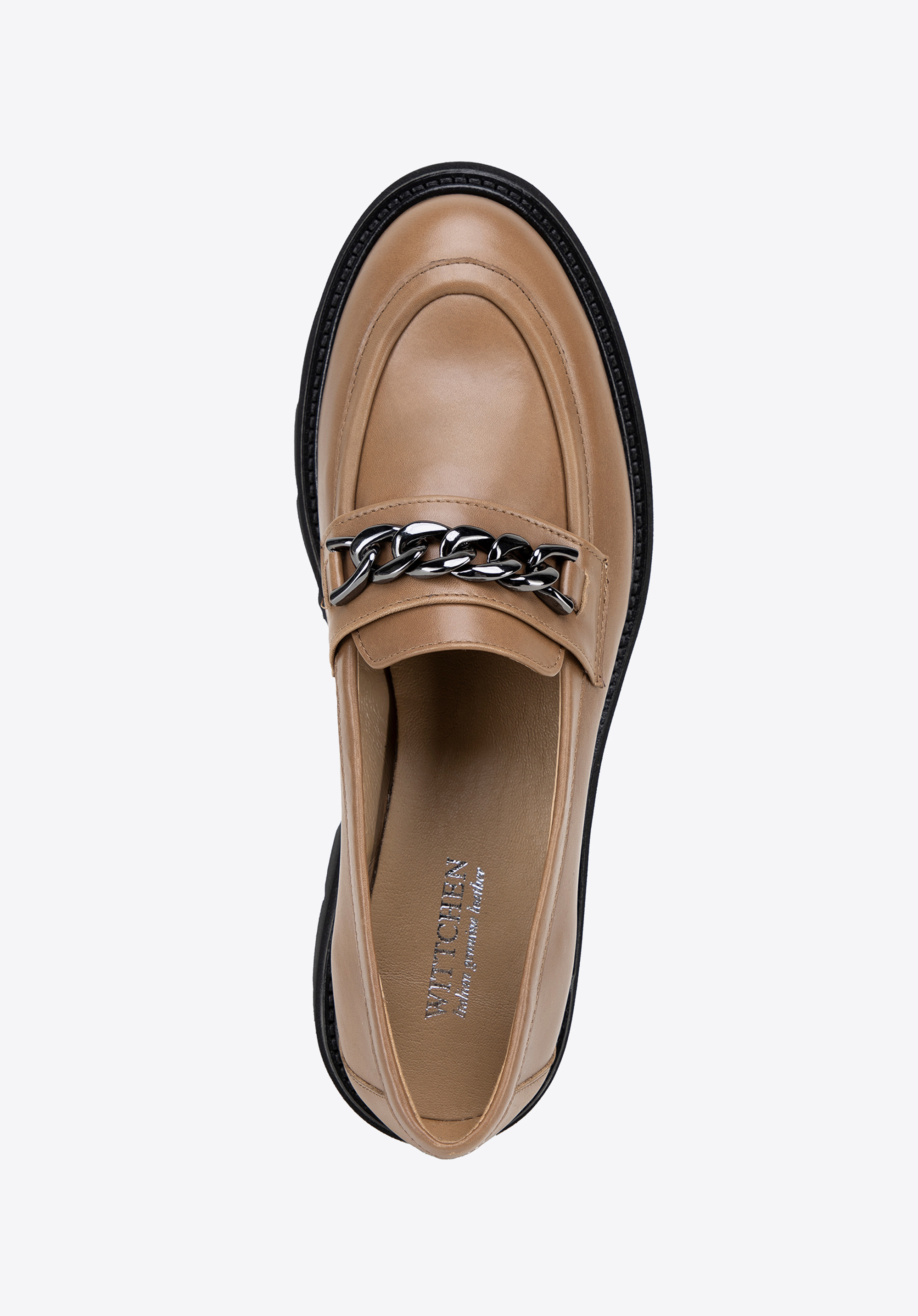Objavte eleganciu a pohodlie v jednom s našimi mokasínami vyrobenými z najkvalitnejšej kože . Tieto topánky s plochým podpätkom , mandľovou špičkou a ozdobnou retiazkou na zvršku spájajú moderný štýl s nádychom luxusu. Pevná podrážka zaisťuje stabilitu a pohodlie, čo vám umožní vychutnať si každý krok bez obáv z nepohodlia. Mandľová špička opticky predlžuje nohy a dodáva každému outfitu jemný šarm.