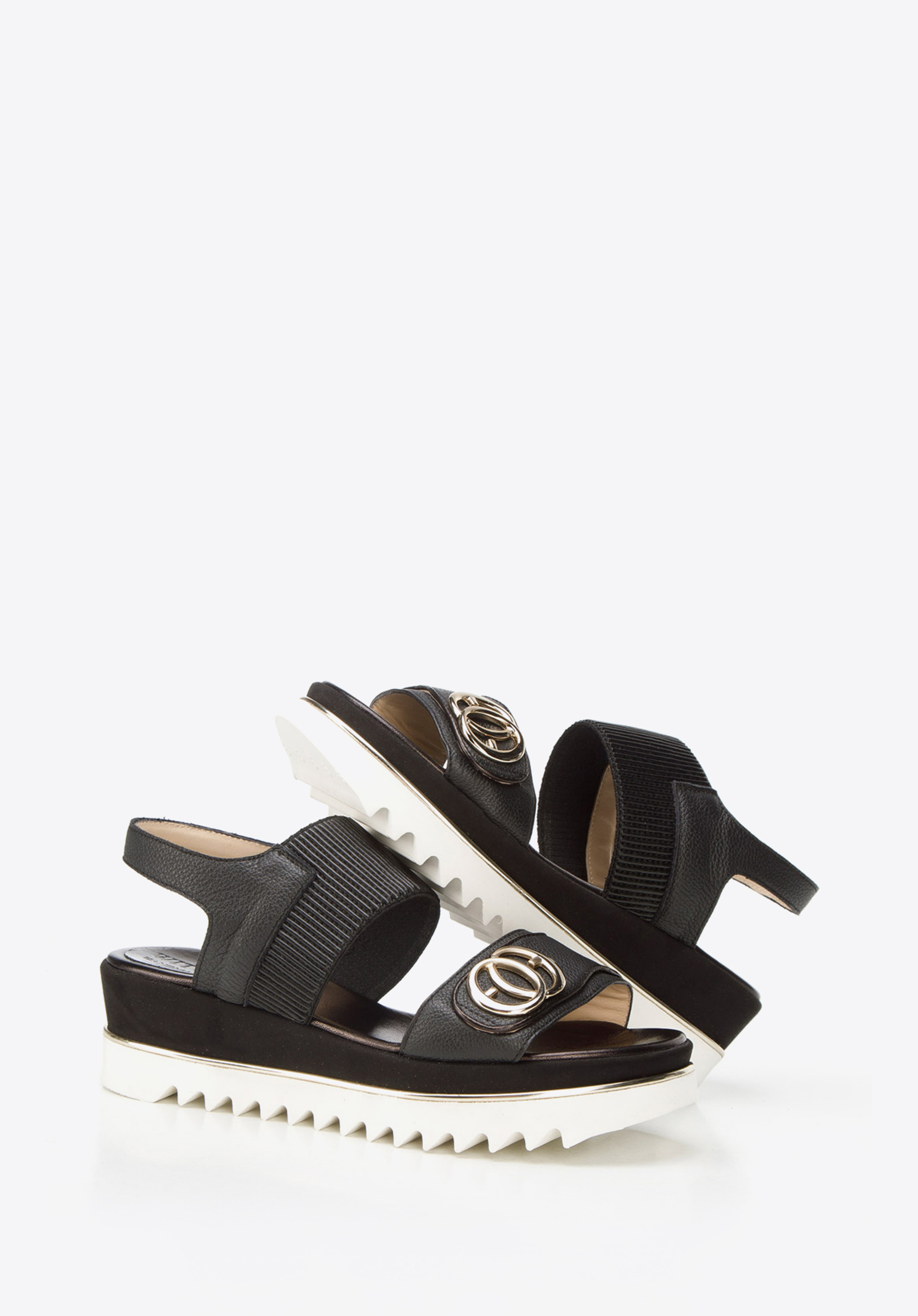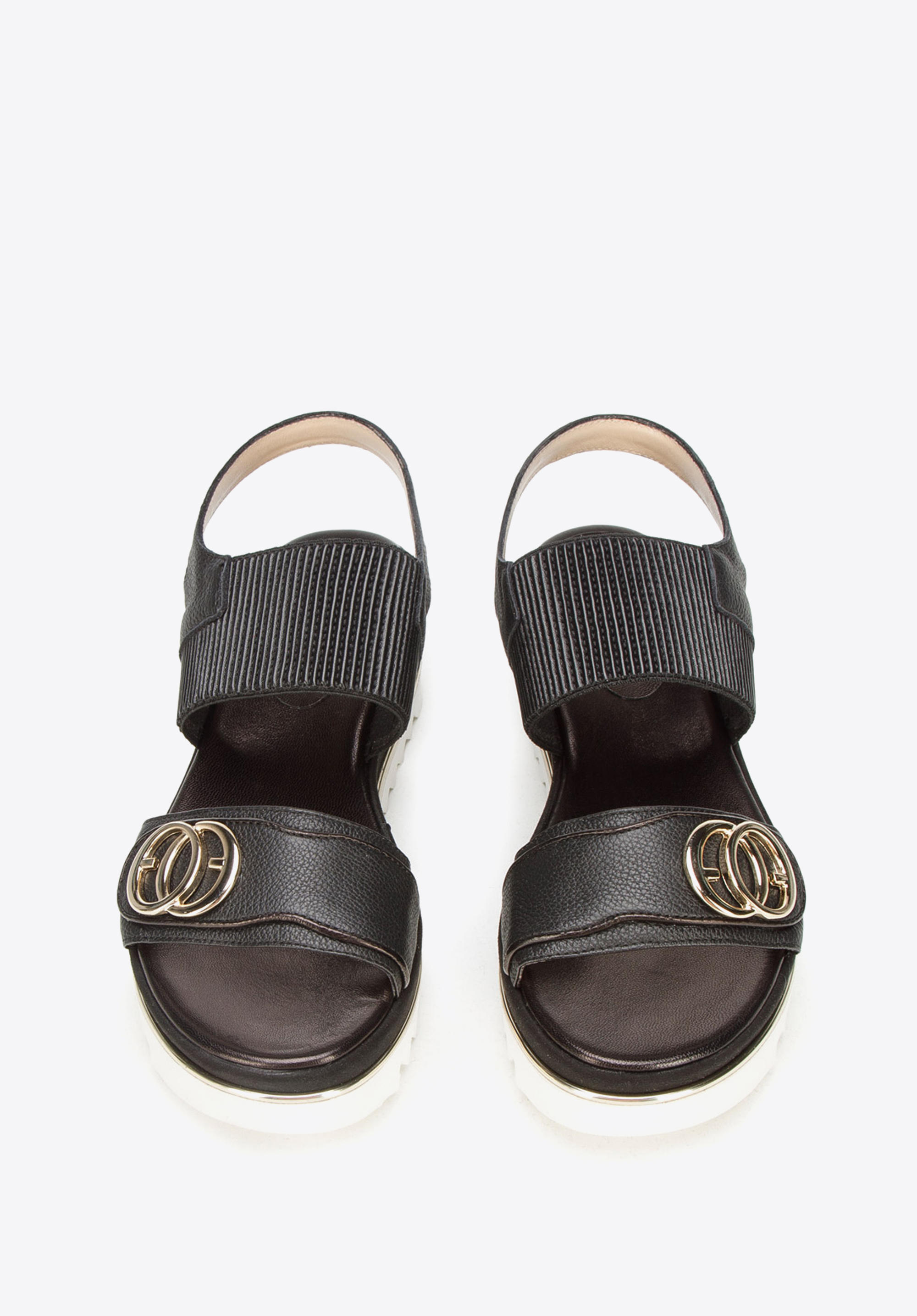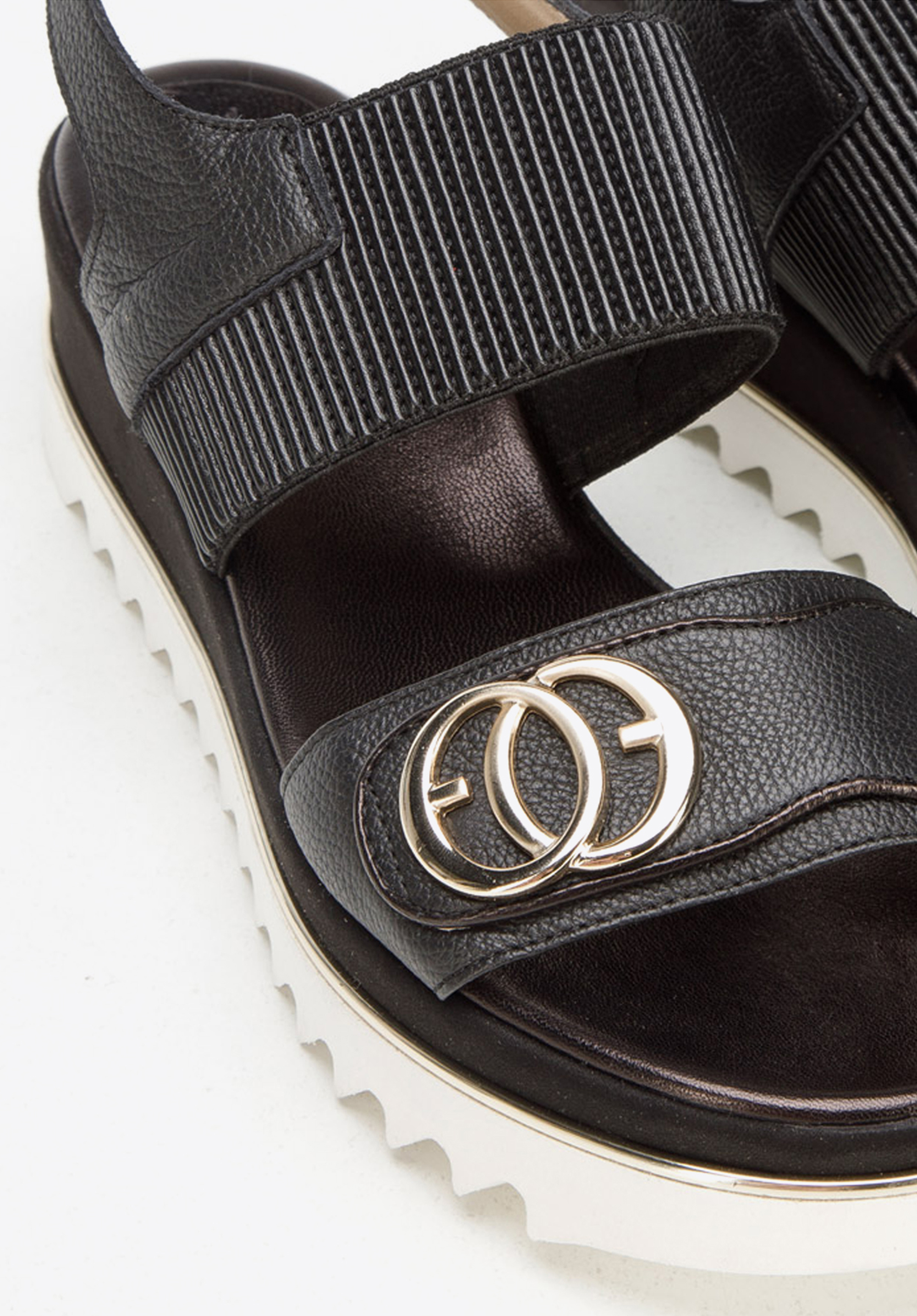 Pohodlné sandále sú základom jarného a letného vzhľadu. Boli šité a ručne dokončené v Taliansku. Nohu vpredu drží elegantný remienok s nášivkou a zlatými prsteňmi. Dodatočnou ozdobou je zlatý pruh, ktorý sa tiahne okolo topánky. Obúvanie sandálov na nohu uľahčuje široká prúžkovaná gumička. A masívne rebrovanie na spodnej strane platformy im nielen dodáva štýl, ale aj zvyšuje ich priľnavosť k zemi. Dámske kožené sandále s hrubou gumičkou sú presne v súlade s aktuálnymi trendmi; sú masívne, ale elegantné. Budú dokonalým zavŕšením vašich outfitov: či už ide o šaty na ramienkach alebo šortky s košeľou.