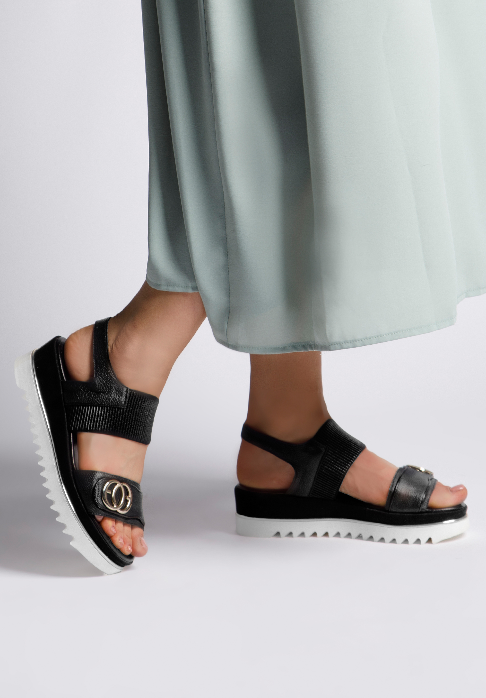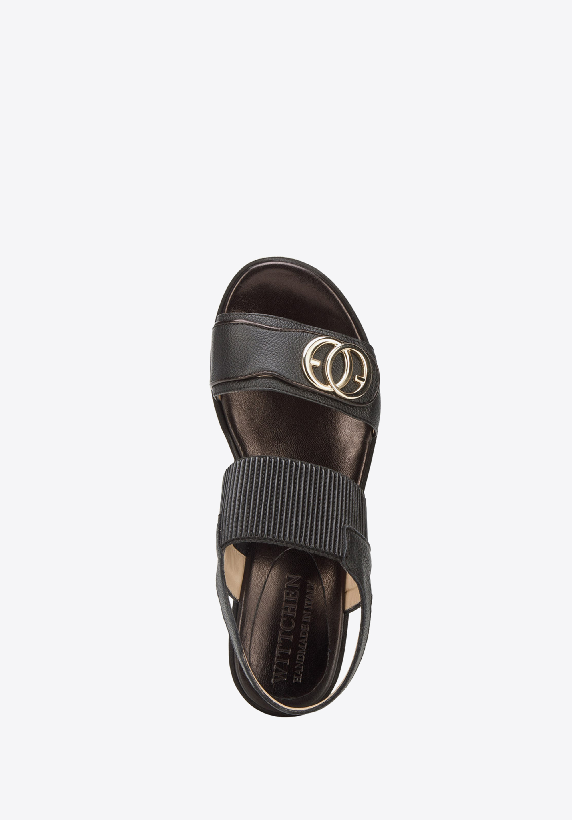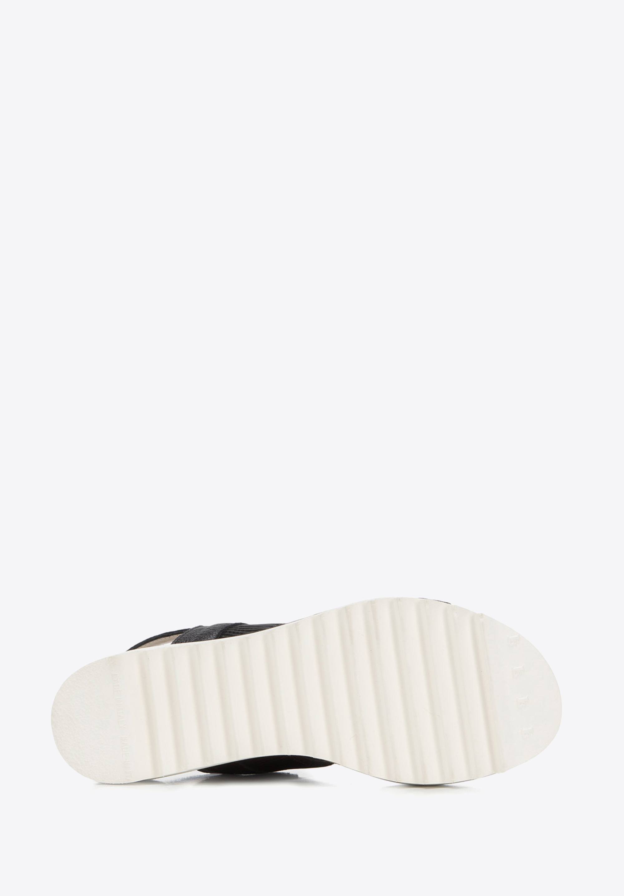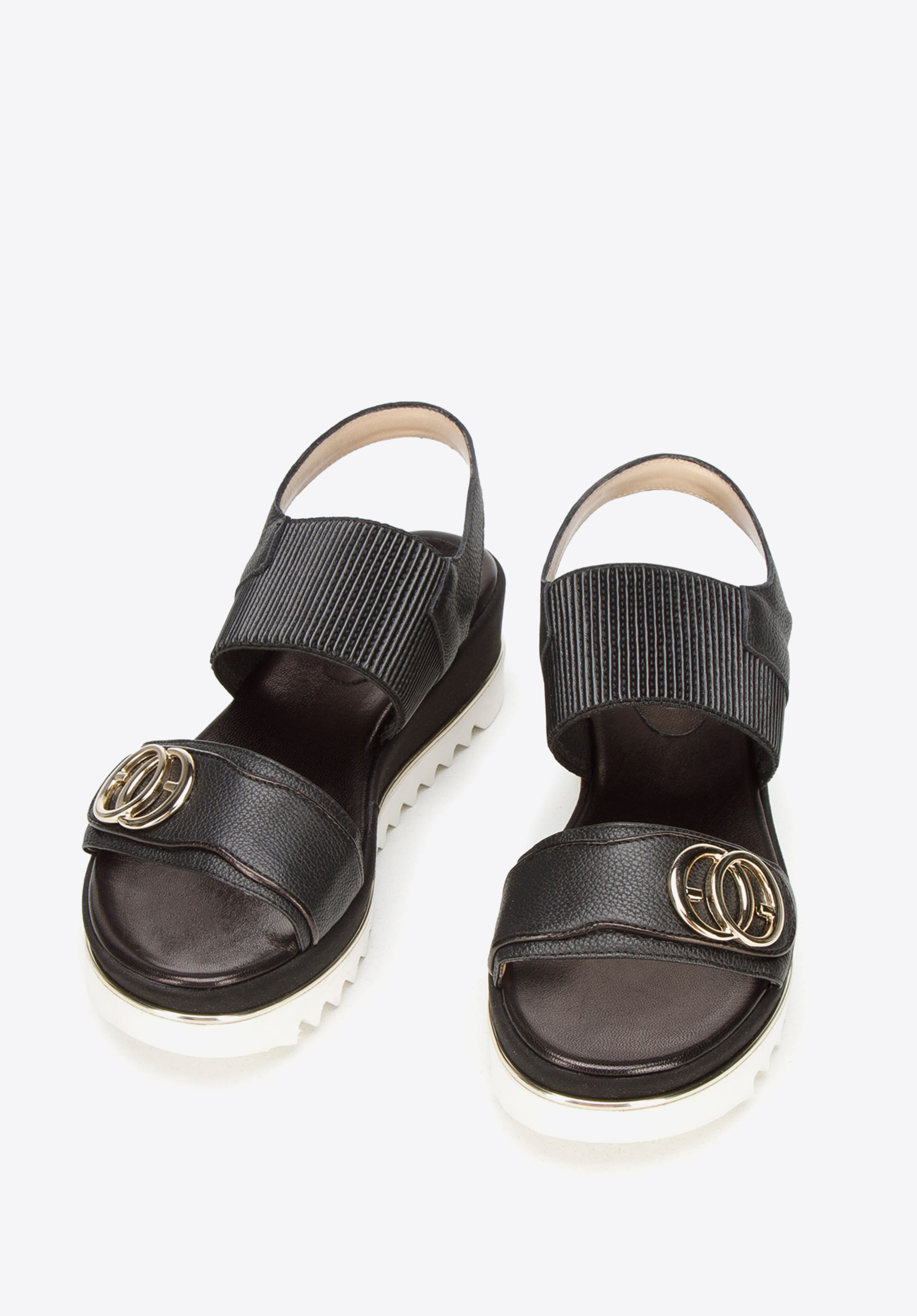 Pohodlné sandále sú základom jarného a letného vzhľadu. Boli šité a ručne dokončené v Taliansku. Nohu vpredu drží elegantný remienok s nášivkou a zlatými prsteňmi. Dodatočnou ozdobou je zlatý pruh, ktorý sa tiahne okolo topánky. Obúvanie sandálov na nohu uľahčuje široká prúžkovaná gumička. A masívne rebrovanie na spodnej strane platformy im nielen dodáva štýl, ale aj zvyšuje ich priľnavosť k zemi. Dámske kožené sandále s hrubou gumičkou sú presne v súlade s aktuálnymi trendmi; sú masívne, ale elegantné. Budú dokonalým zavŕšením vašich outfitov: či už ide o šaty na ramienkach alebo šortky s košeľou.