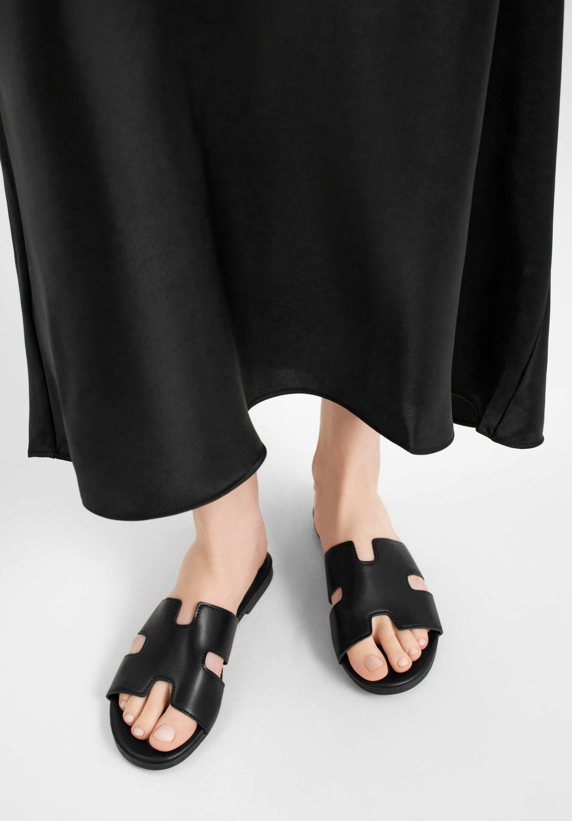 - Výrez v tvare písmena H: Geometrický vzor na prednej strane dáva vyniknúť topánkam, opticky predĺži chodidlo a dodá na sofistikovanosti každému outfitu.