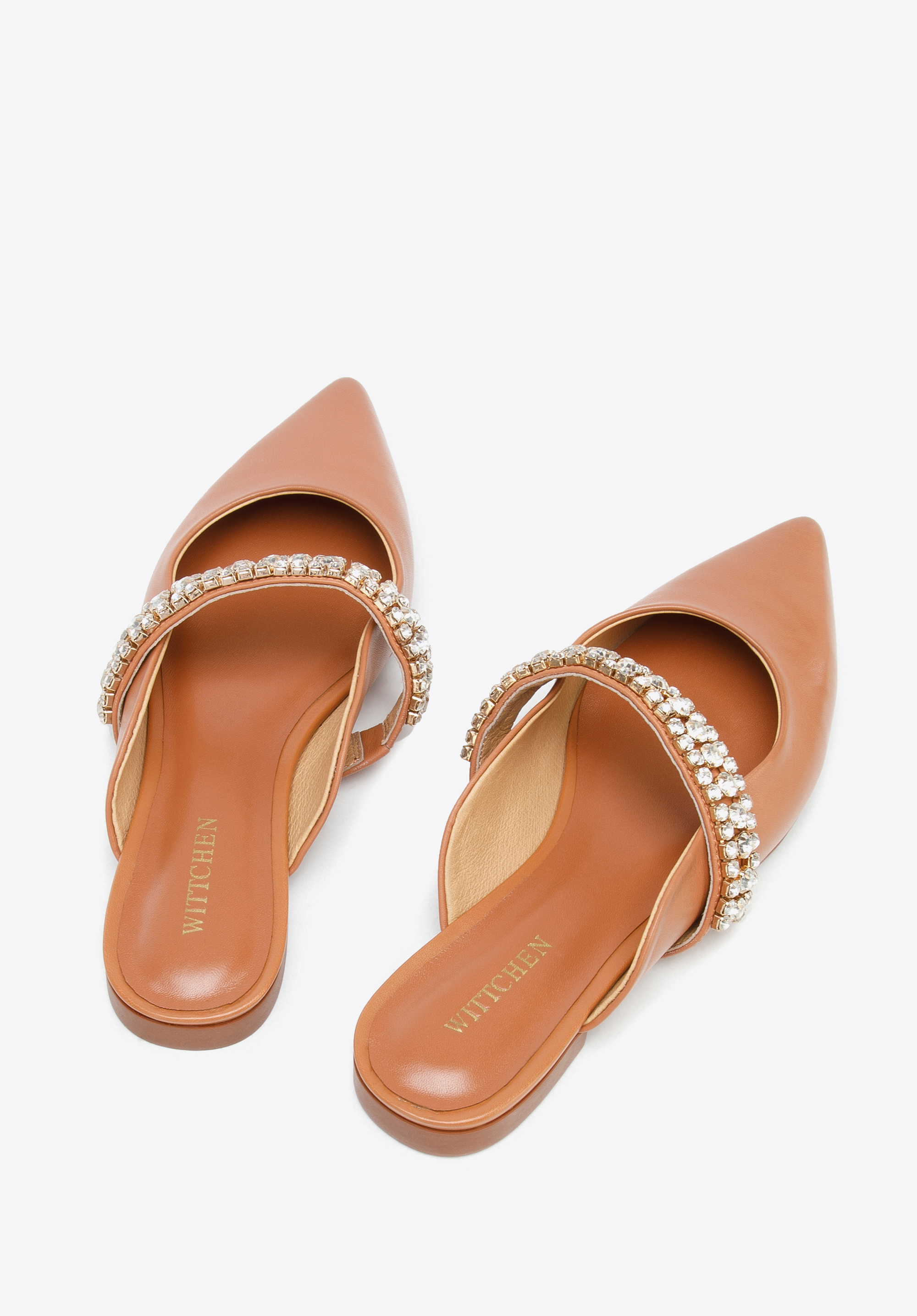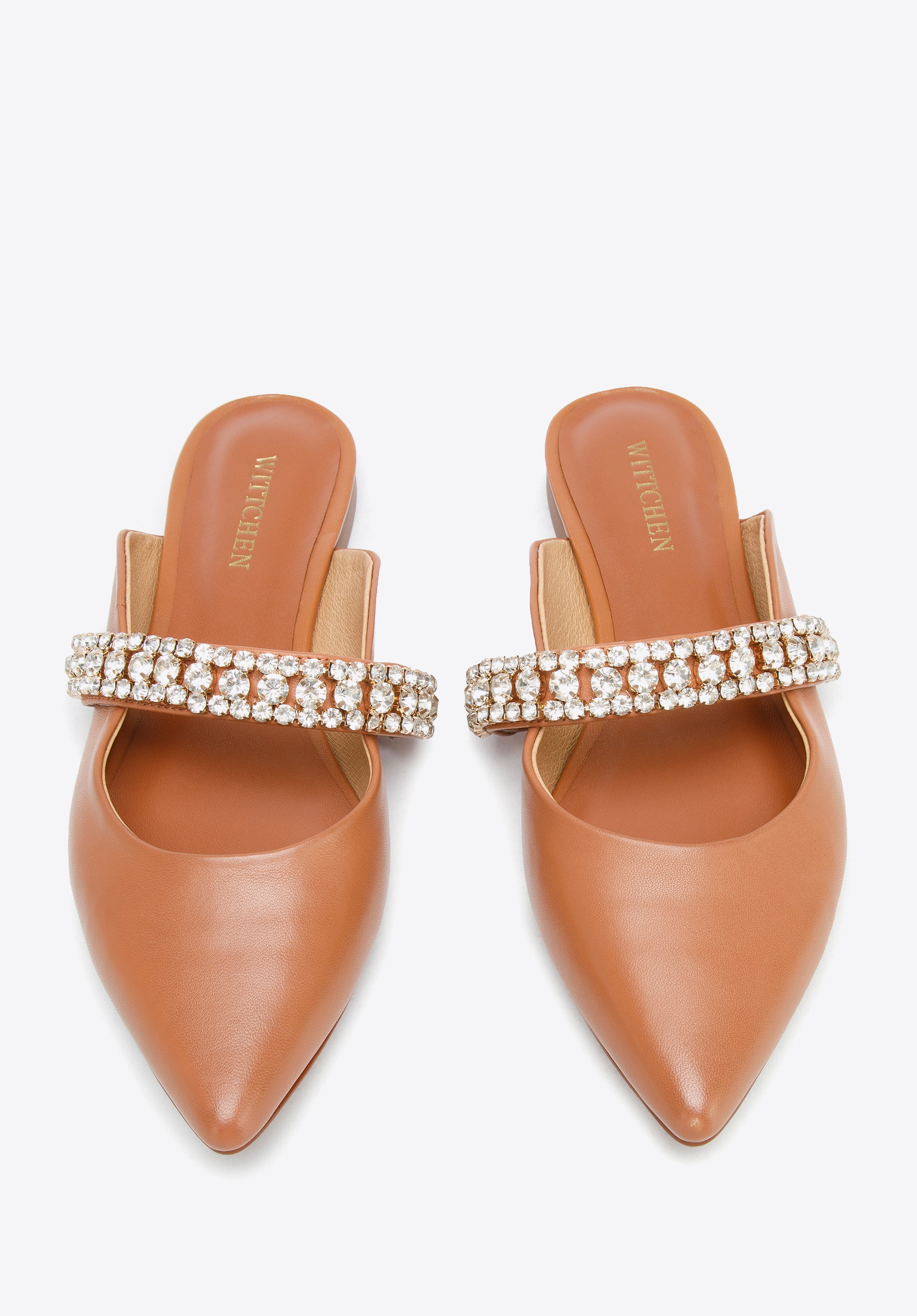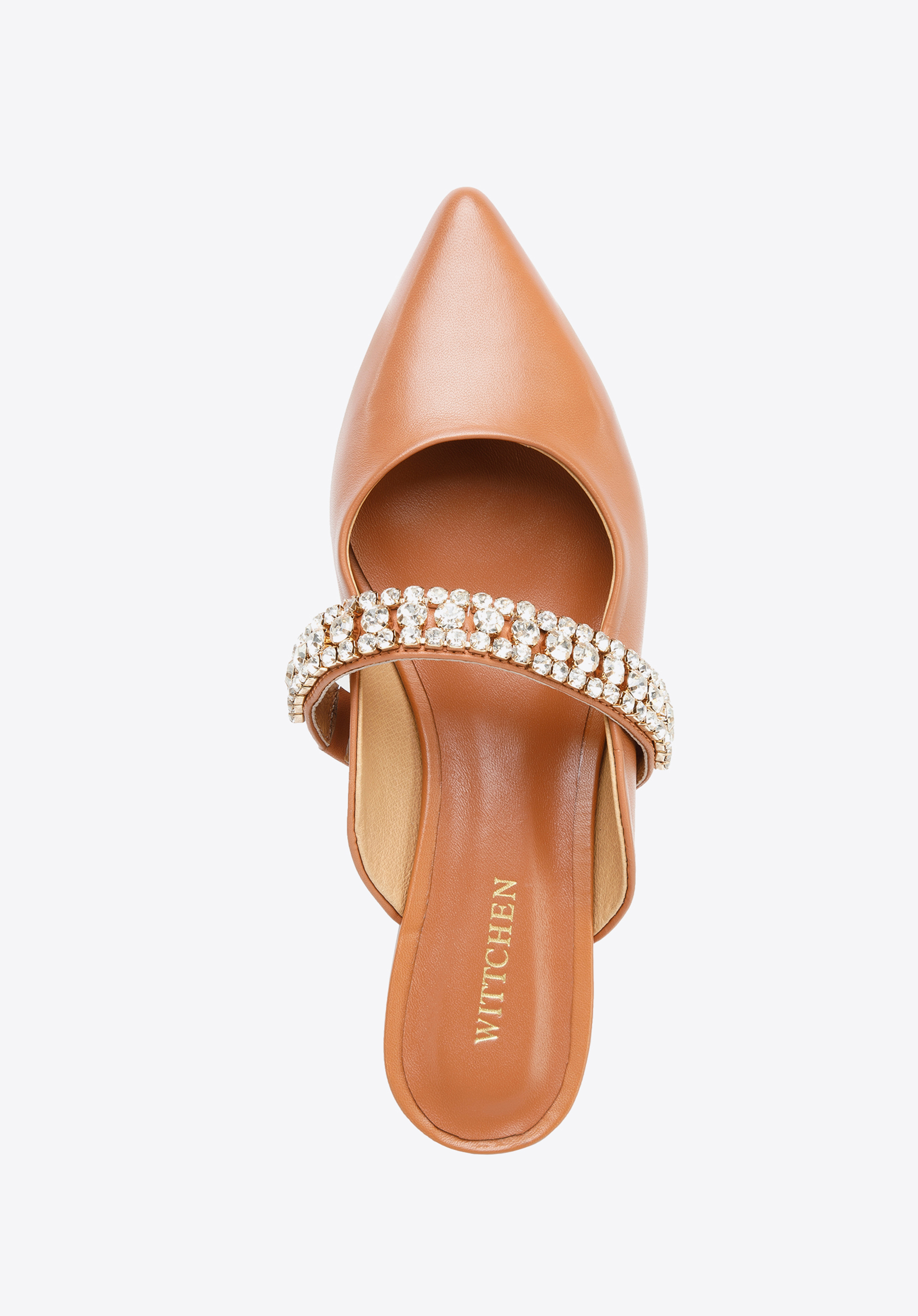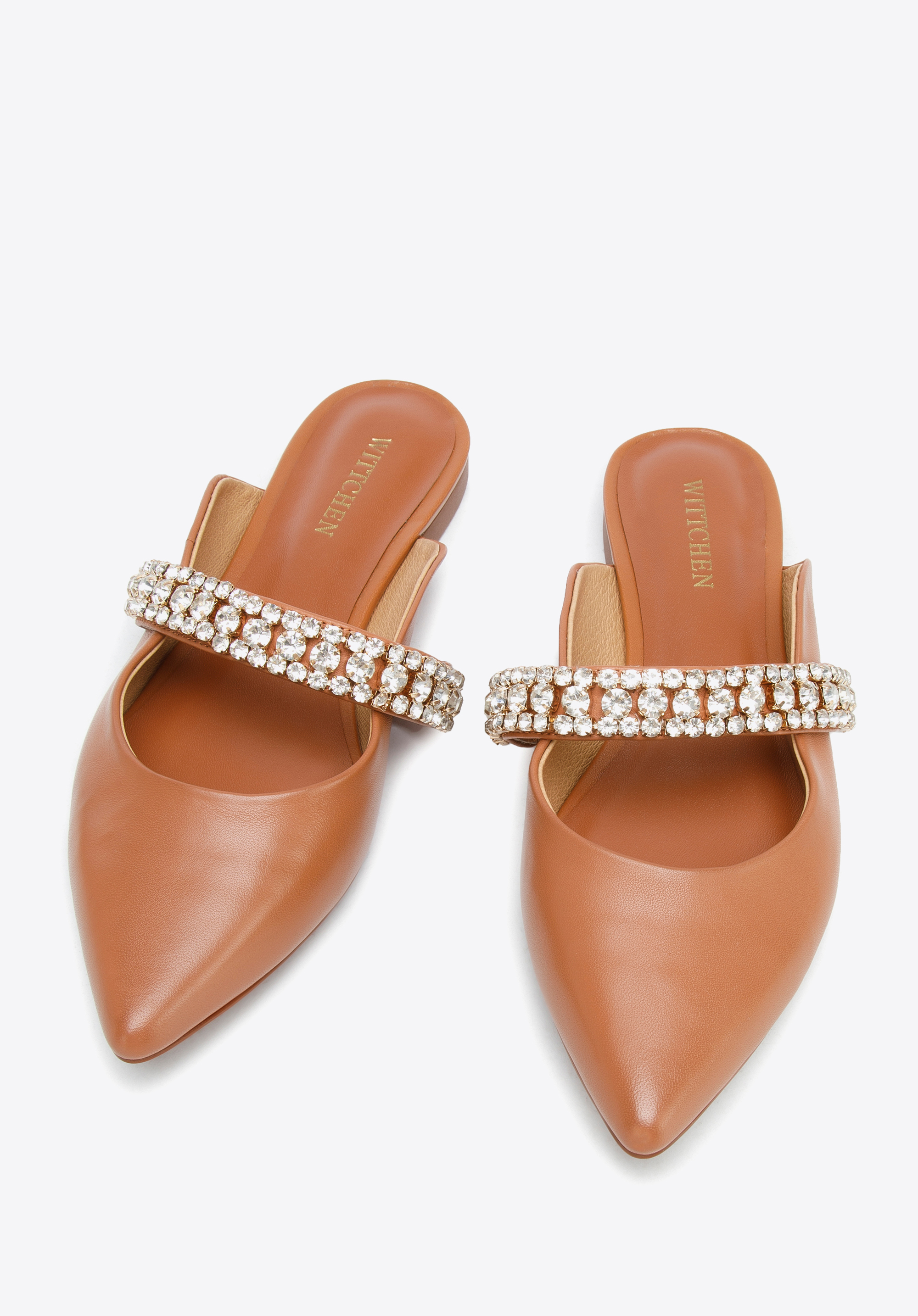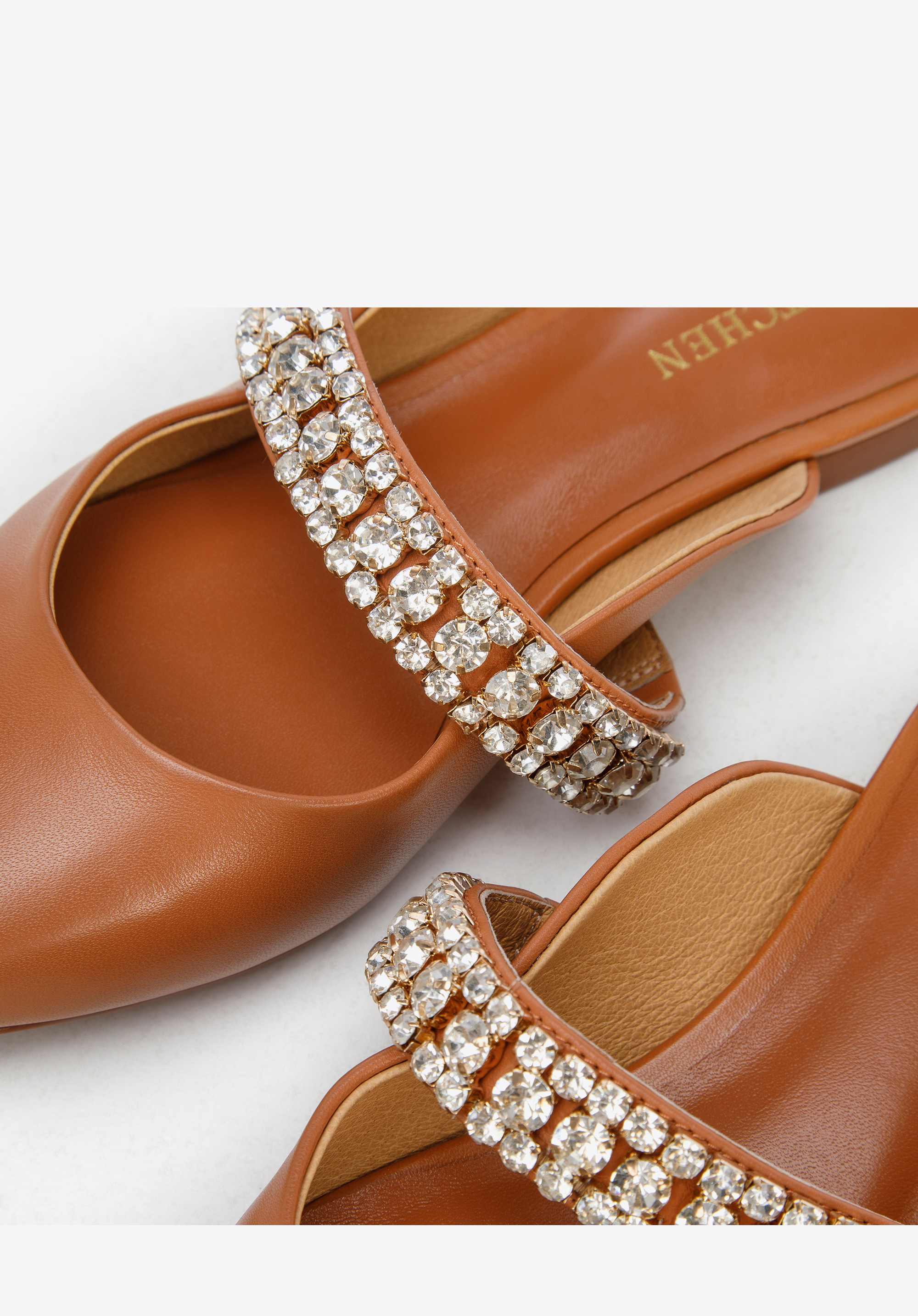 z veľmi kvalitnej prírodnej kože. Zdobí ich šperkový pásik z drobných trblietavých kryštálikov.