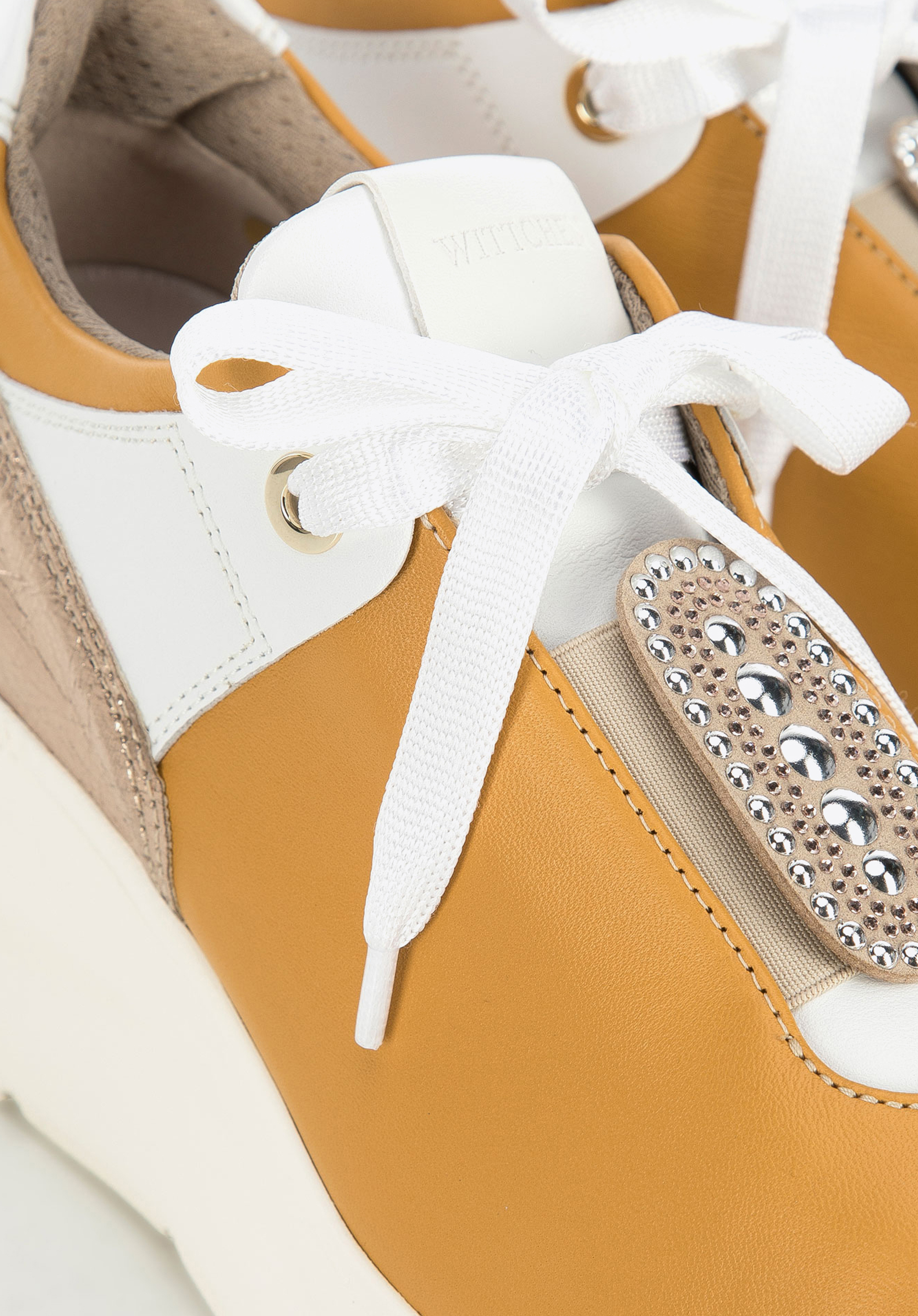 lesklé vložky – šperkové kamienky pri jazyku a zlatý remienok na päte.