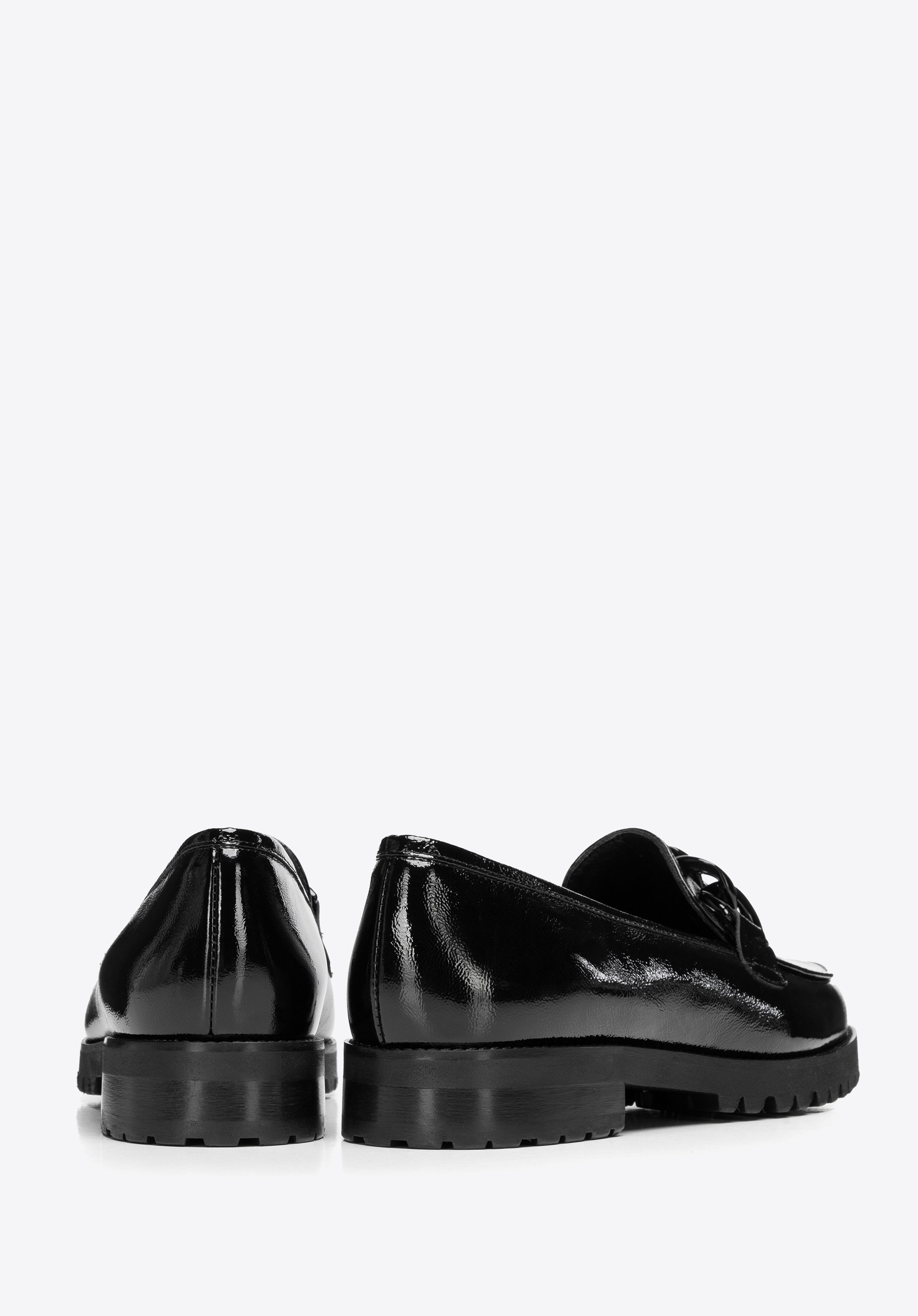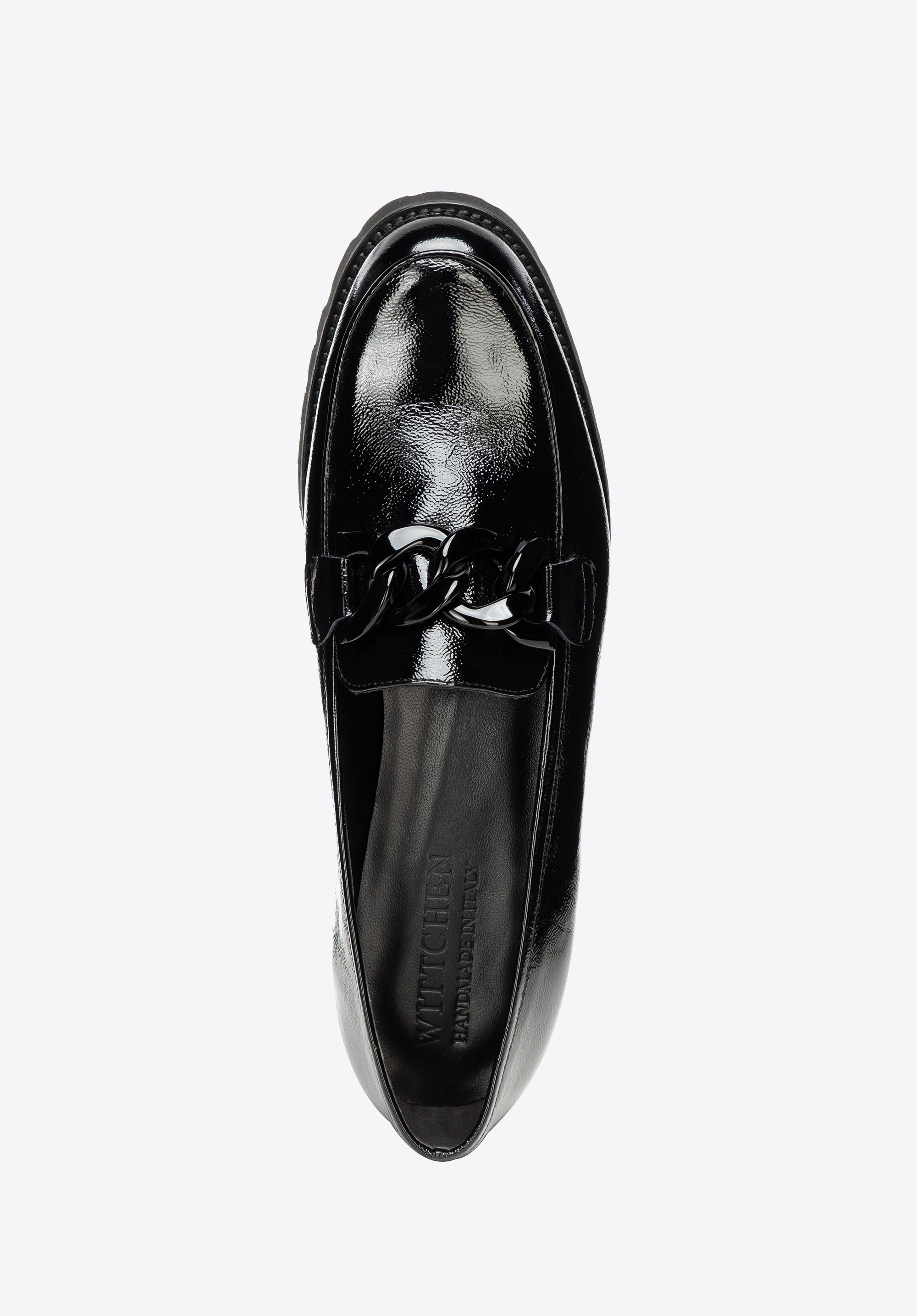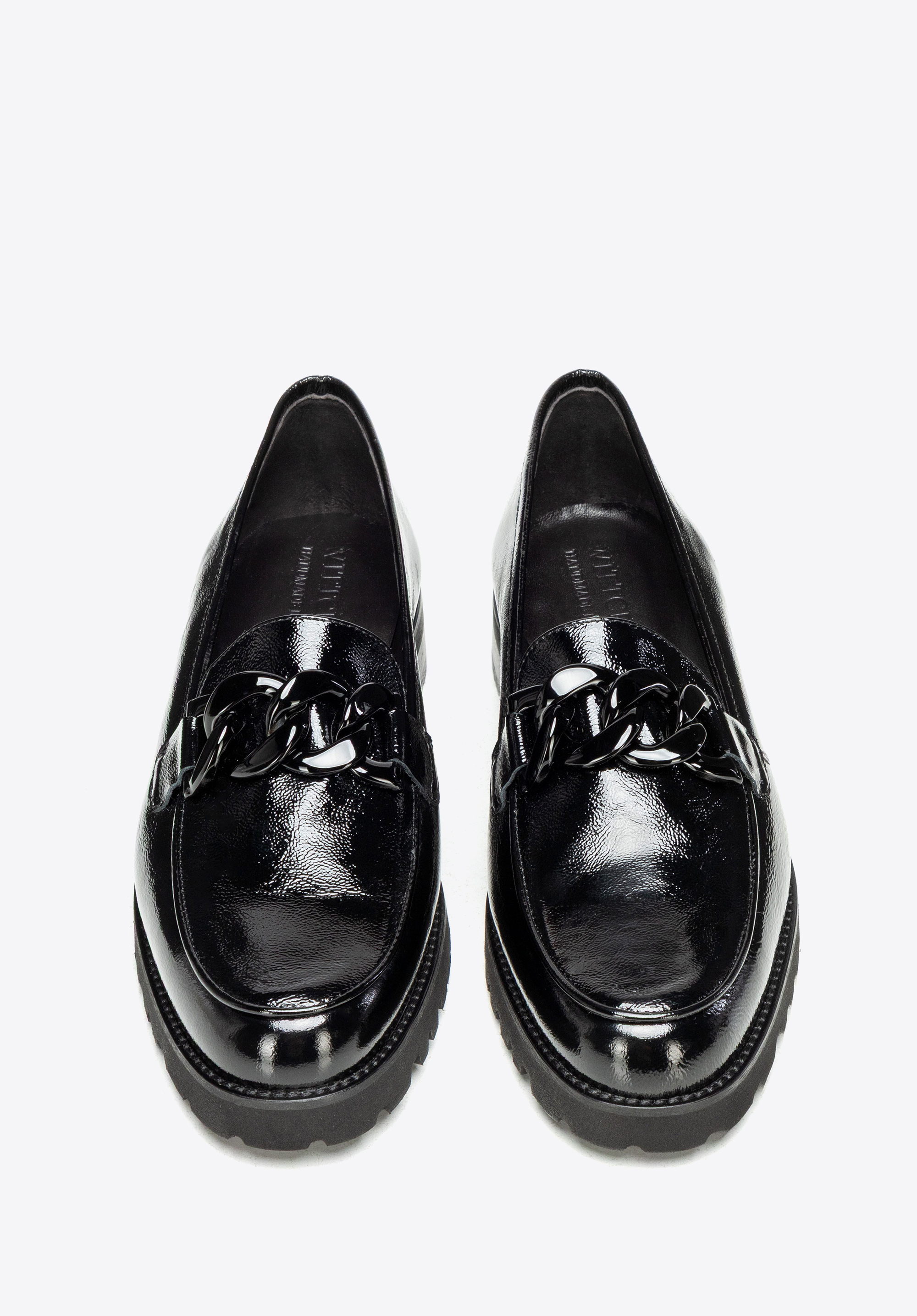 Tieto elegantné a charakteristické mokasíny sú perfektnou voľbou pre ženy, ktoré oceňujú klasický štýl s moderným nádychom. Vyrobené z vysoko kvalitnej lakovanej kože, zachytávajú svetlo jemným leskom a vyznačujú sa precíznym remeselným spracovaním. Prednú časť zdobí ozdobná retiazka – šperkmi inšpirovaný akcent , ktorý dodáva nadčasovej siluete módny nádych. Mandľová špička jemne predlžuje chodidlo, zatiaľ čo flexibilná gumená podrážka ponúka celodenné pohodlie a stabilitu. S koženou podšívkou vnútra sú tieto mokasíny nielen pútavé, ale aj mimoriadne pohodlné.