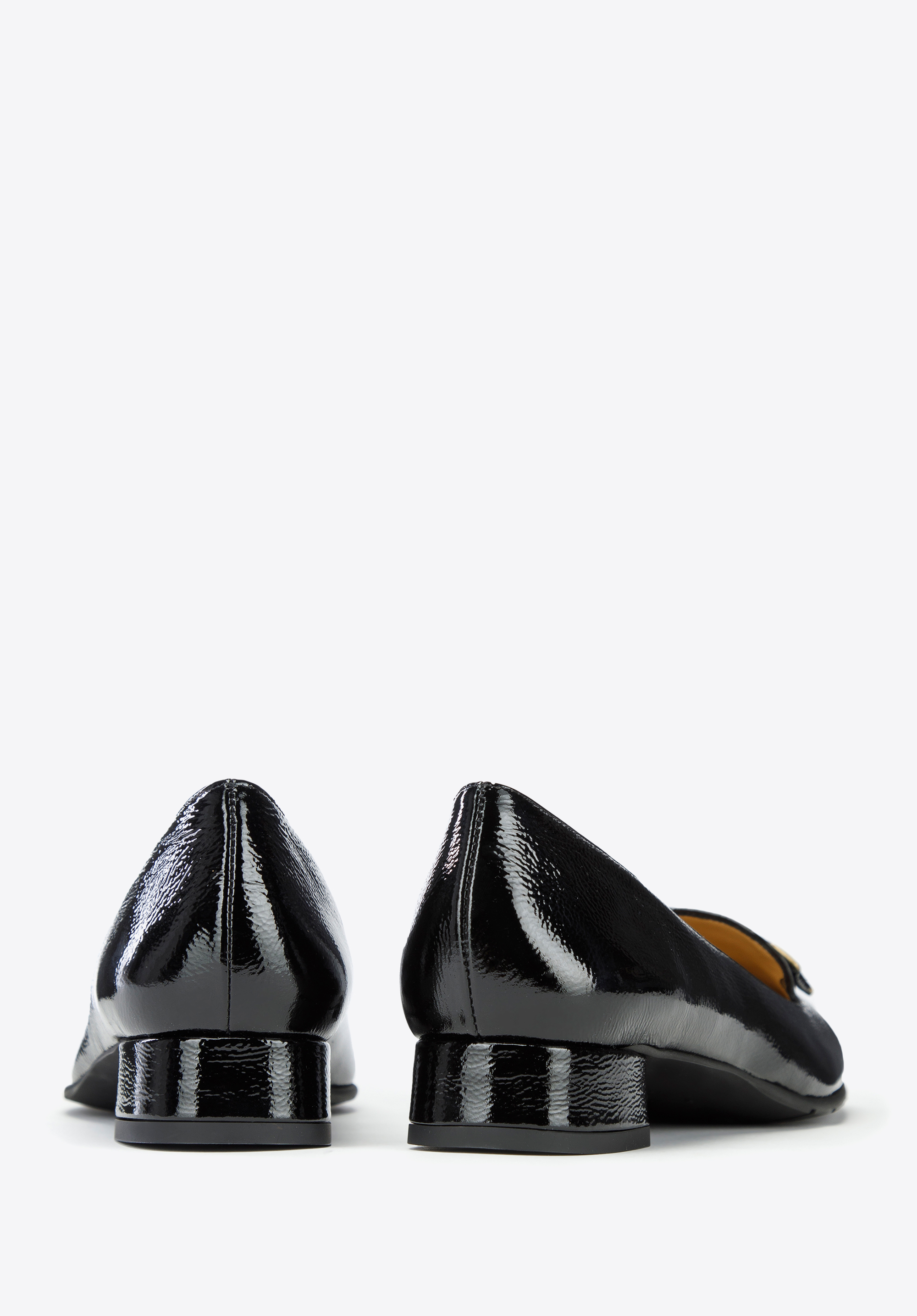 Dámske lodičky z lakovanej kože s geometrickou ozdobou sú módnym doplnkom každého elegantného ženského outfitu.