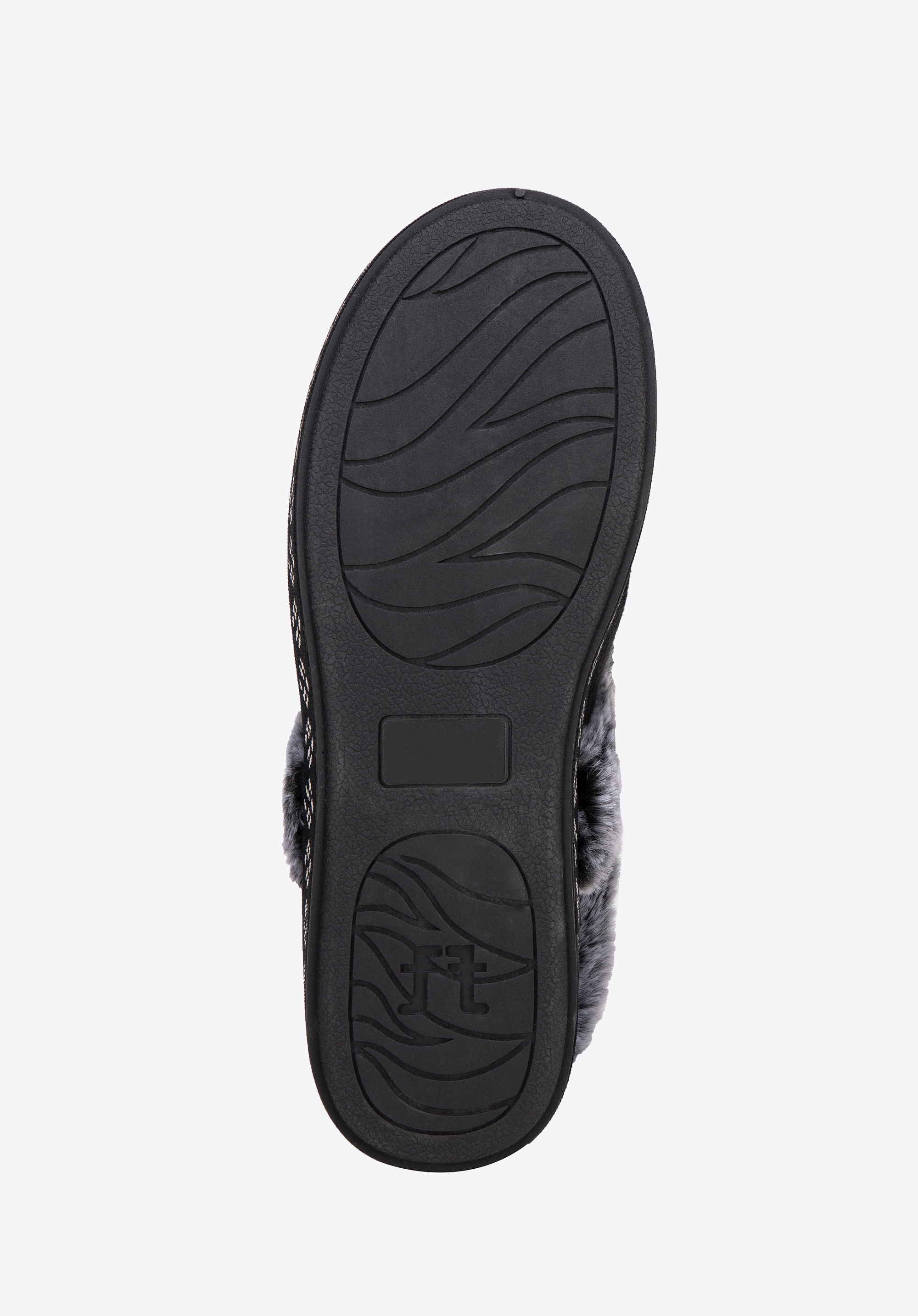 Objavte dámske papuče, v ktorých sa spája elegancia s výnimočným pohodlím. Tieto dámske topánky sú ideálnou voľbou pre ženy, ktoré hľadajú luxus vo svojom dome. Výnimočná podšívka z umelej kožušiny poskytuje pozoruhodné teplo a mäkkosť pre vaše nohy každý deň. Vďaka svojmu elegantnému dizajnu a jemnému vzoru na medzipodrážke sú tieto papuče ideálnym doplnkom každého spoločenského oblečenia.