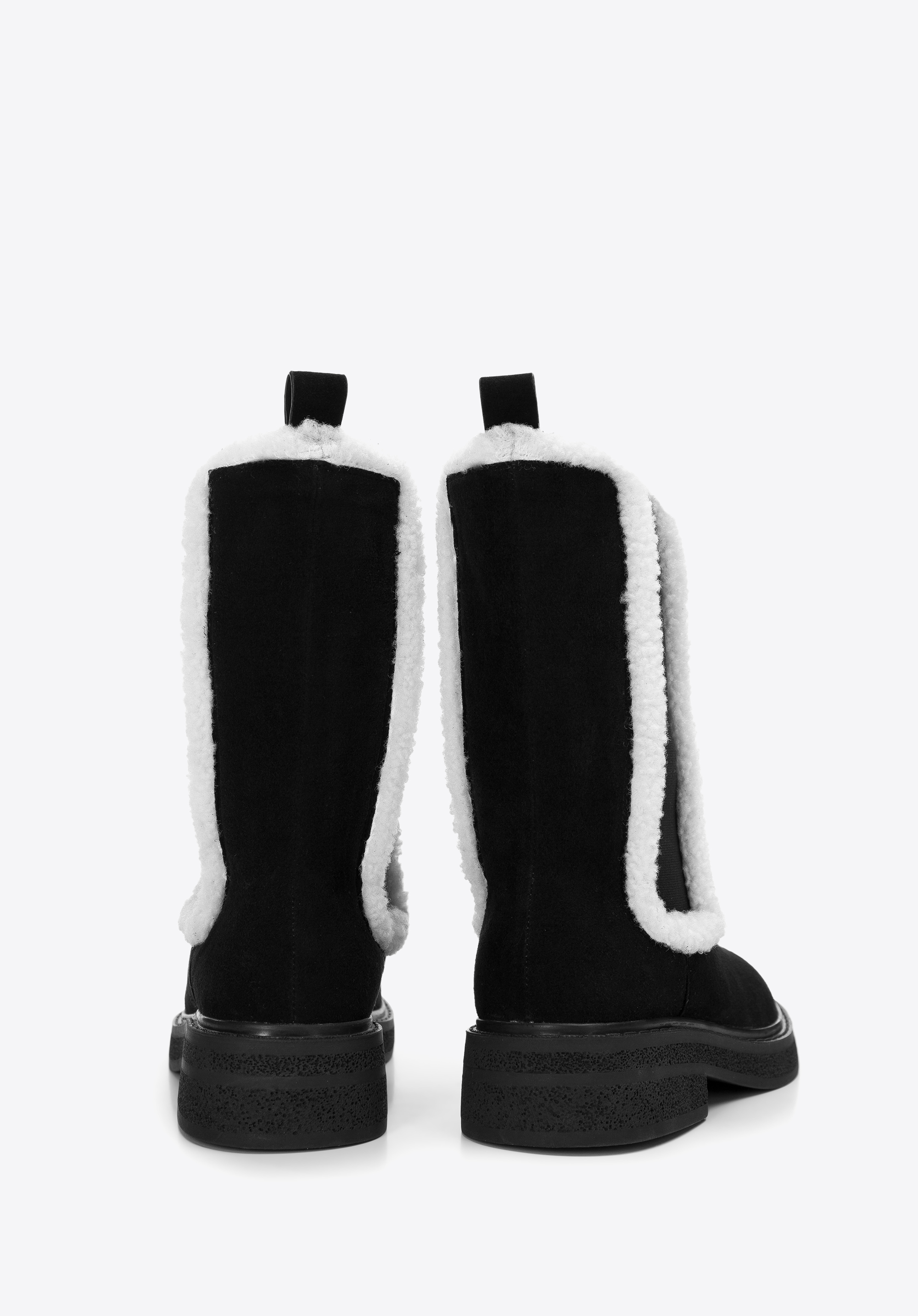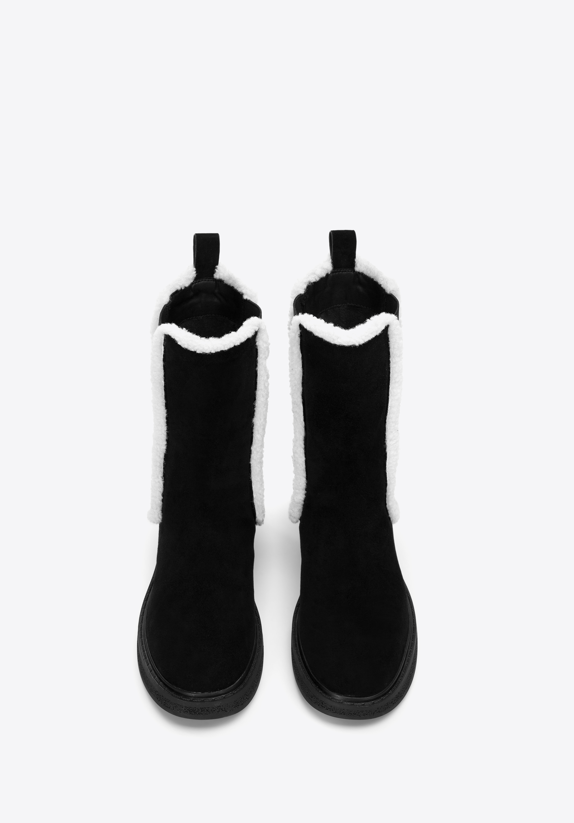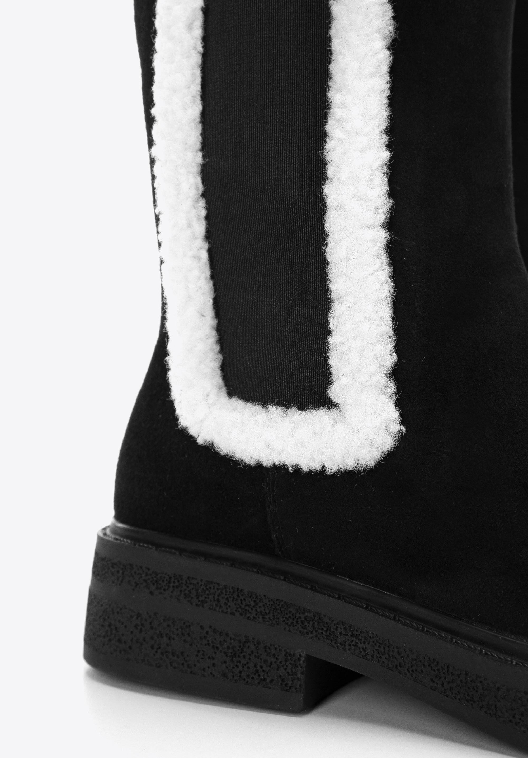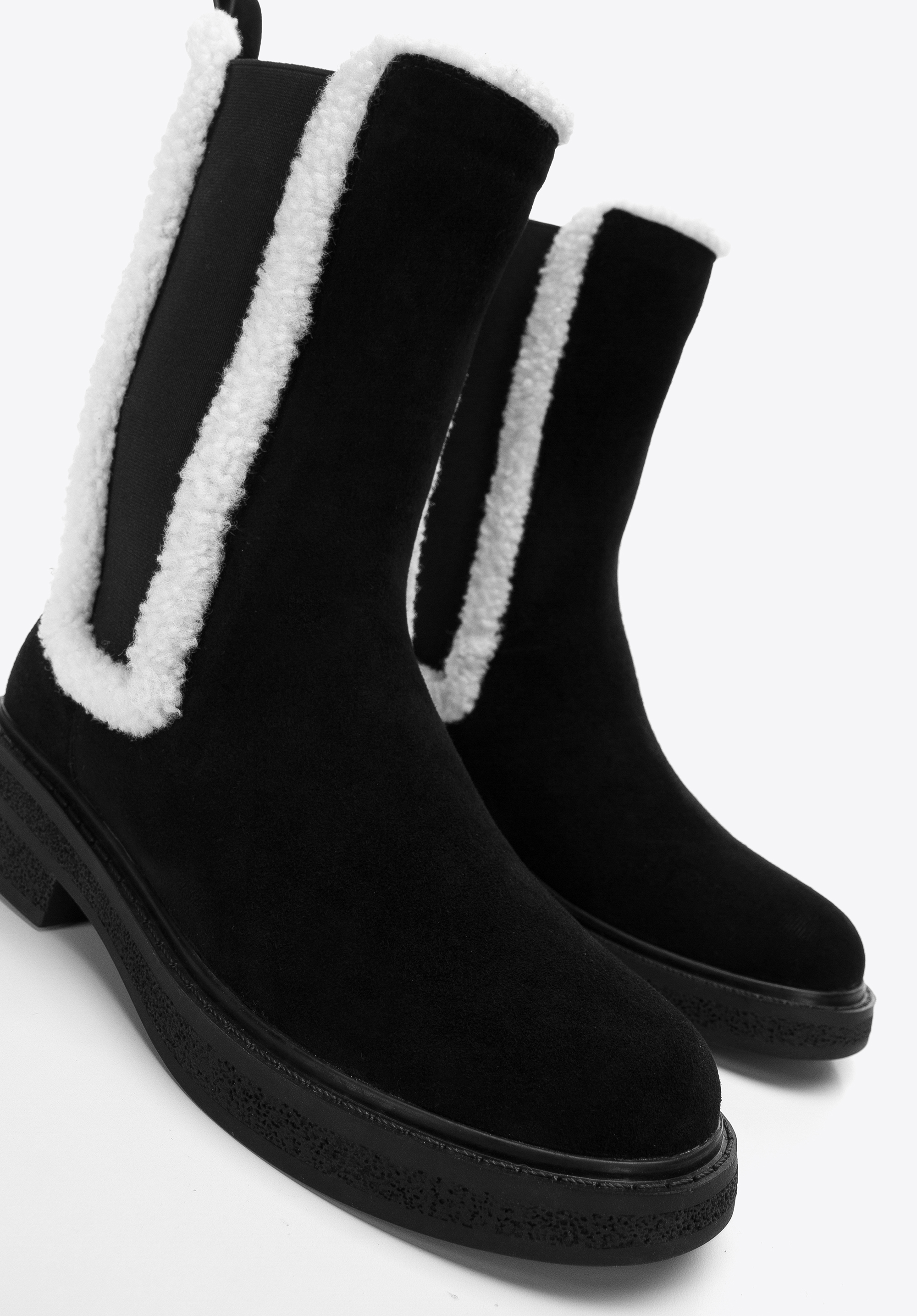 Dámske semišové chelsea čižmy s umelou kožušinou čierne