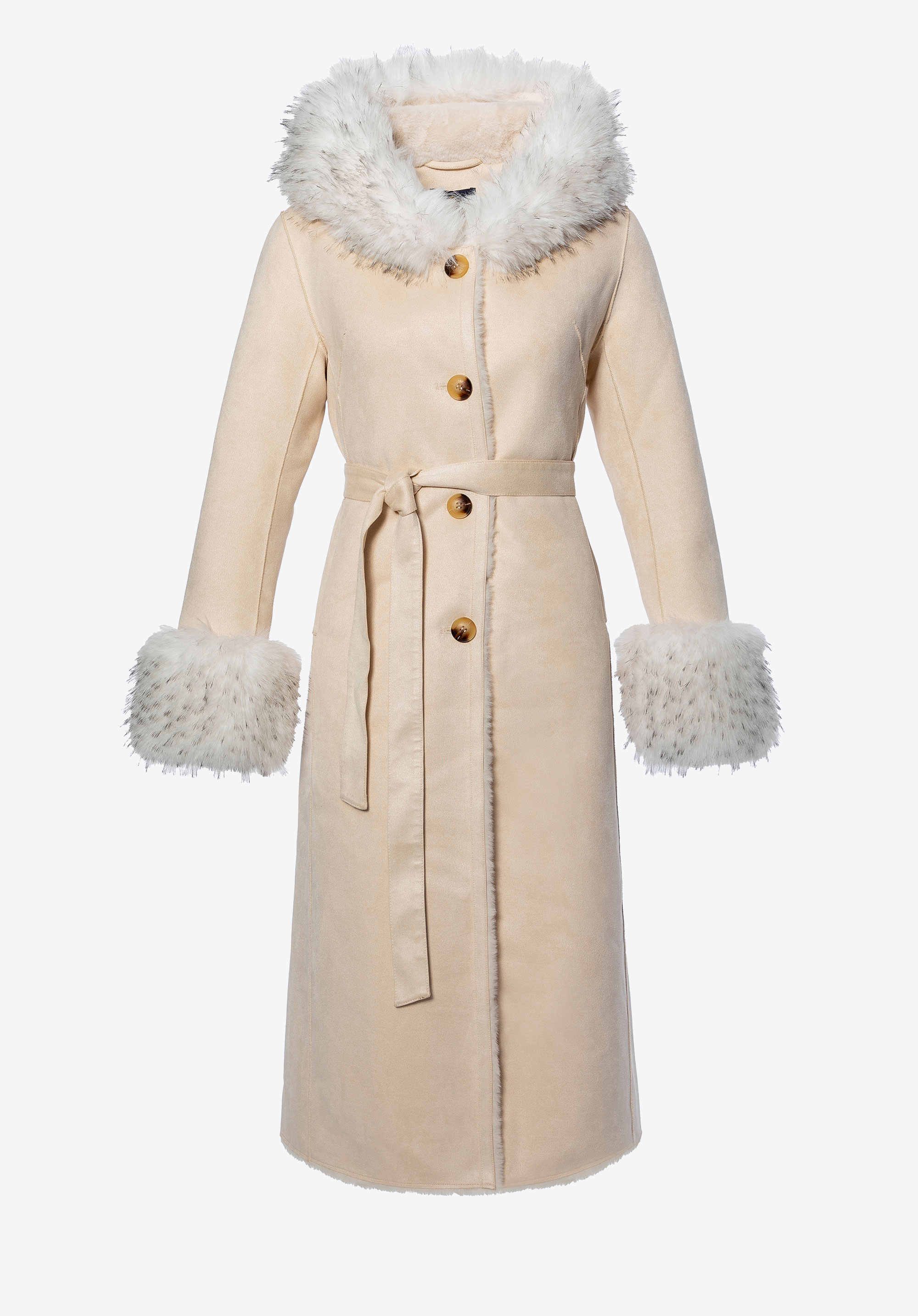 Tento kabát je dokonalou kombináciou ženskej elegancie, pohodlia a praktických prvkov na chladnejšie dni. Dlhý strih krásne obaľuje postavu, zatiaľ čo mäkké detaily z umelej kožušiny dodávajú útulné čaro. Kapucňa a manžety lemované umelou kožušinou sú nielen pútavé, ale aj mimoriadne mäkké na dotyk. Kabát je vyrobený z polyesteru a ponúka skvelú ochranu pred vetrom a chladom, zatiaľ čo celá podšívka z rovnakého materiálu zaisťuje celodenné pohodlie. Zapínanie na gombíky a zaväzovací opasok v páse umožňujú lichotivý a prispôsobivý strih.