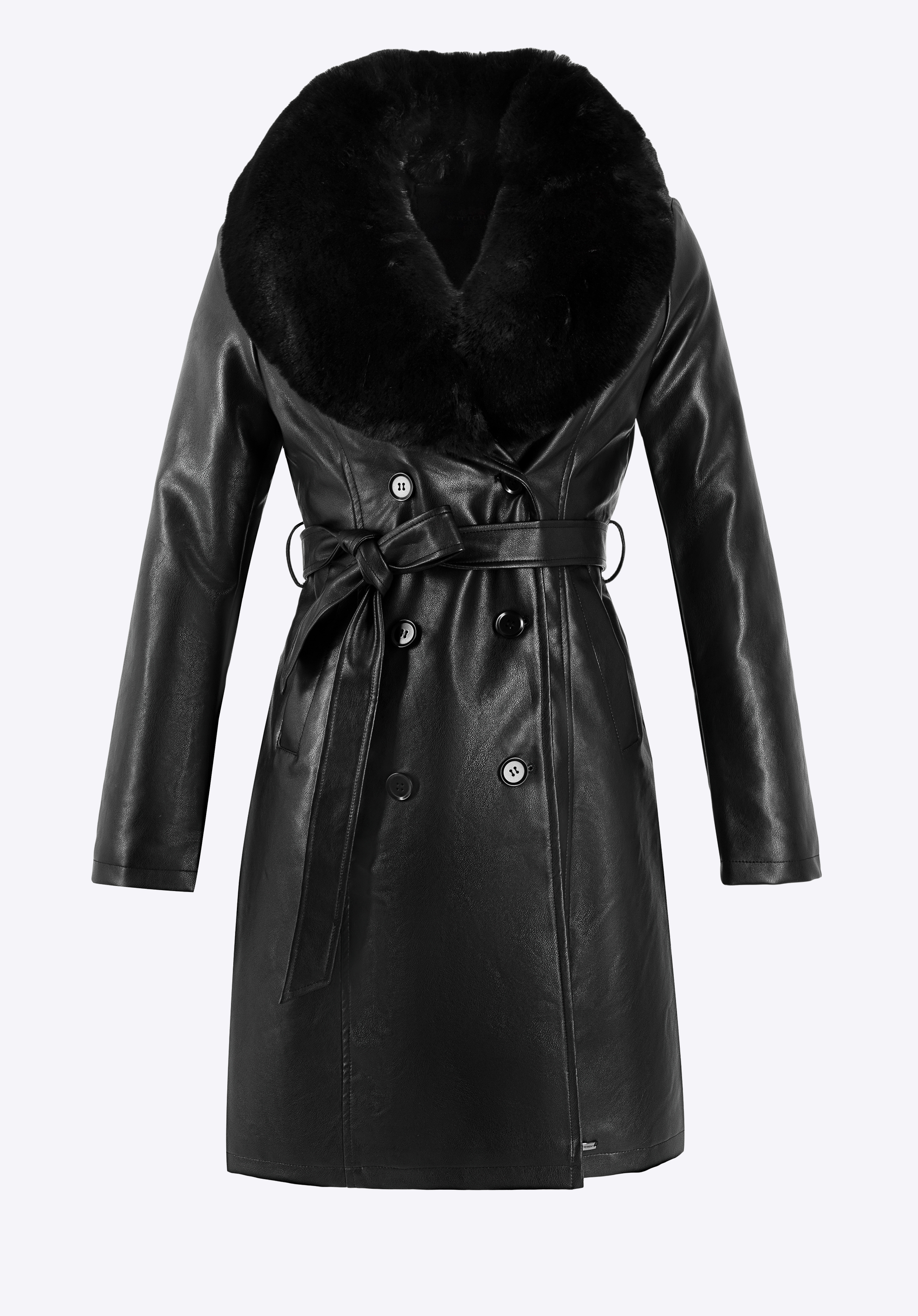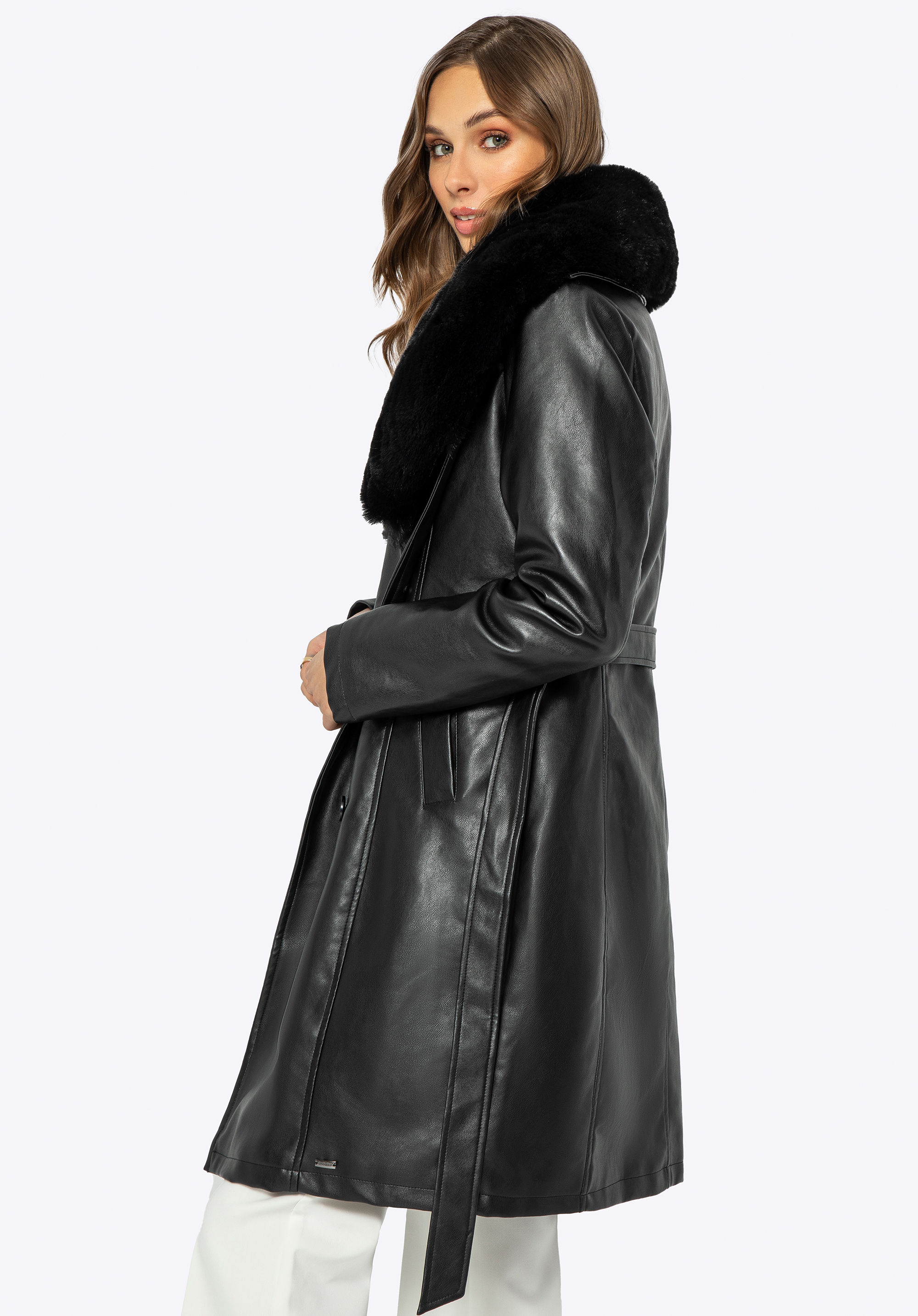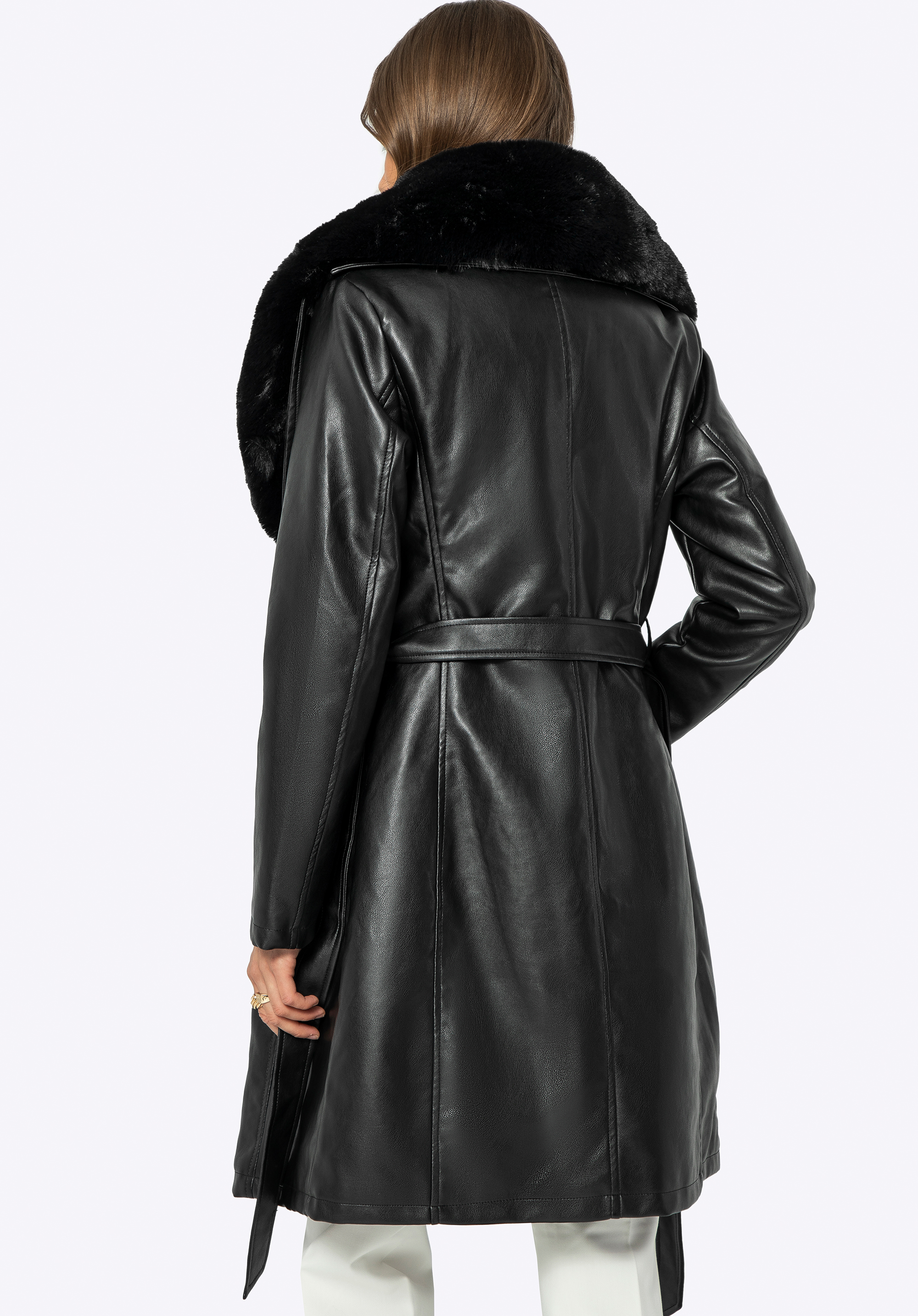 Kabát so zvýrazneným pásom s odnímateľným kožušinovým golierom