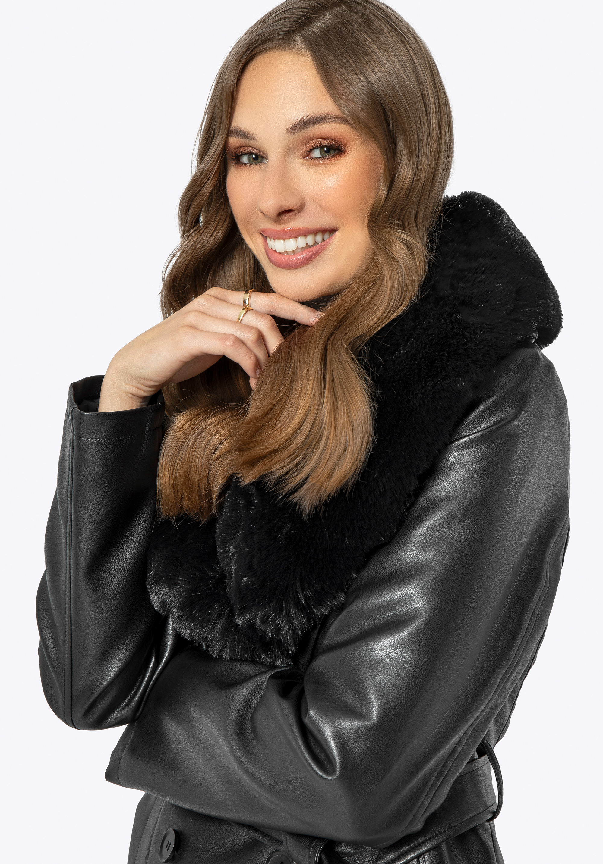 - Materiál: Ekokoža, z ktorej je kabát vyrobený, nielenže vyzerá ako pravá koža, ale je tiež ľahko udržiavateľná. Polyesterová podšívka poskytuje hladký povrch a dodatočnú vrstvu ochrany proti chladu, vďaka čomu je kabát ideálnou voľbou pre chladnejšie dni.