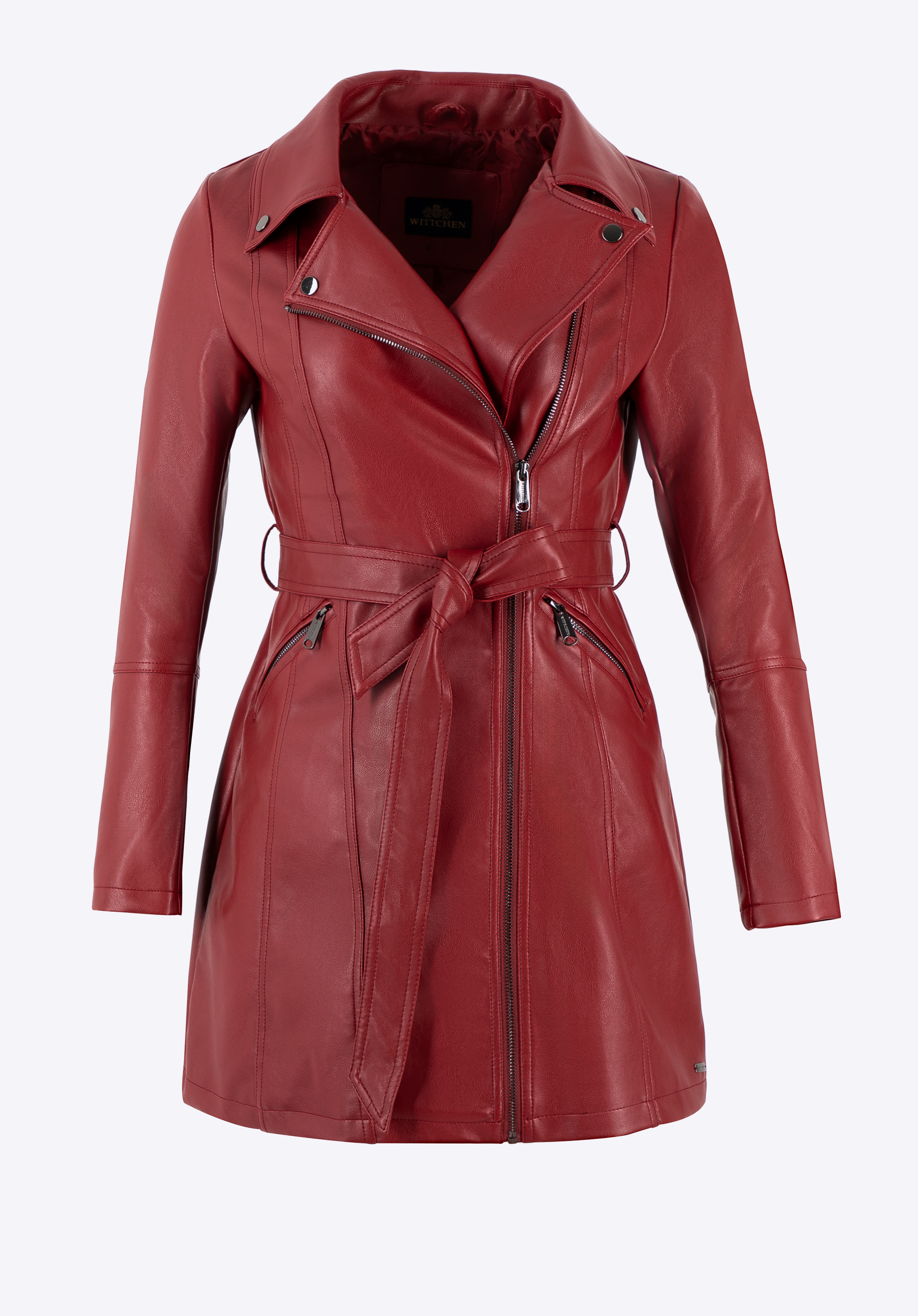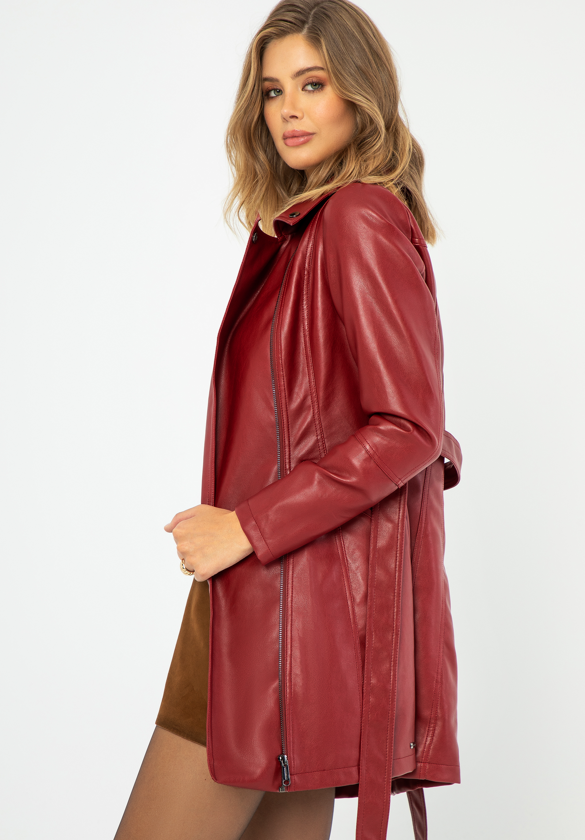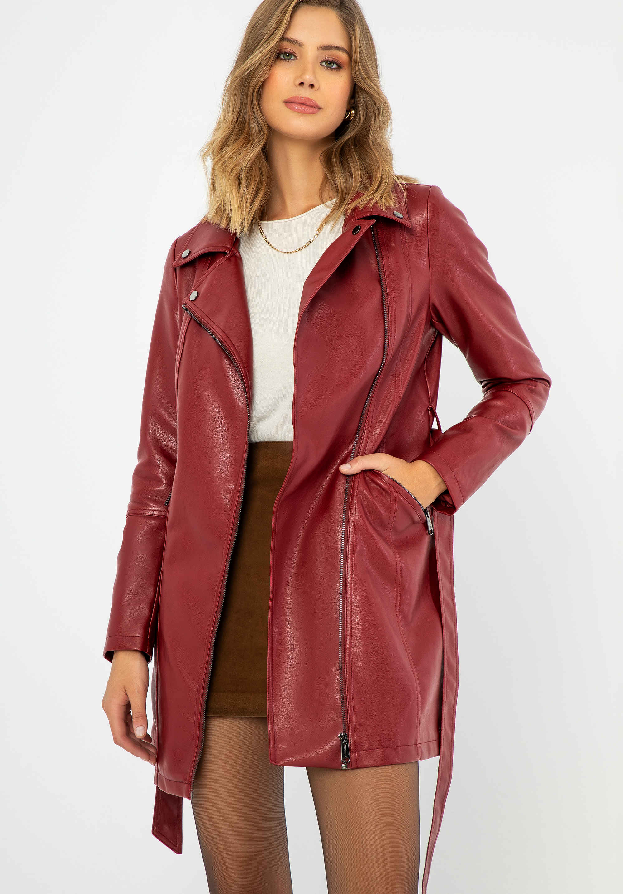 Ak si ceníte eleganciu v kombinácii s moderným štýlom, tento dámsky kabát z ekokože bude vaším novým favoritom. Navrhnutý pre milovníčky klasiky, kombinuje nadčasový strih s modernými detailmi, ktoré umožnia vyniknúť každému outfitu. Praktické vrecká na zips na bokoch sú ideálne pre ruky alebo malé predmety. Štýlový, nastaviteľný opasok sa ideálne prispôsobí siluete, zdôrazní jej tvary alebo vytvorí voľnejší, ležérny vzhľad.