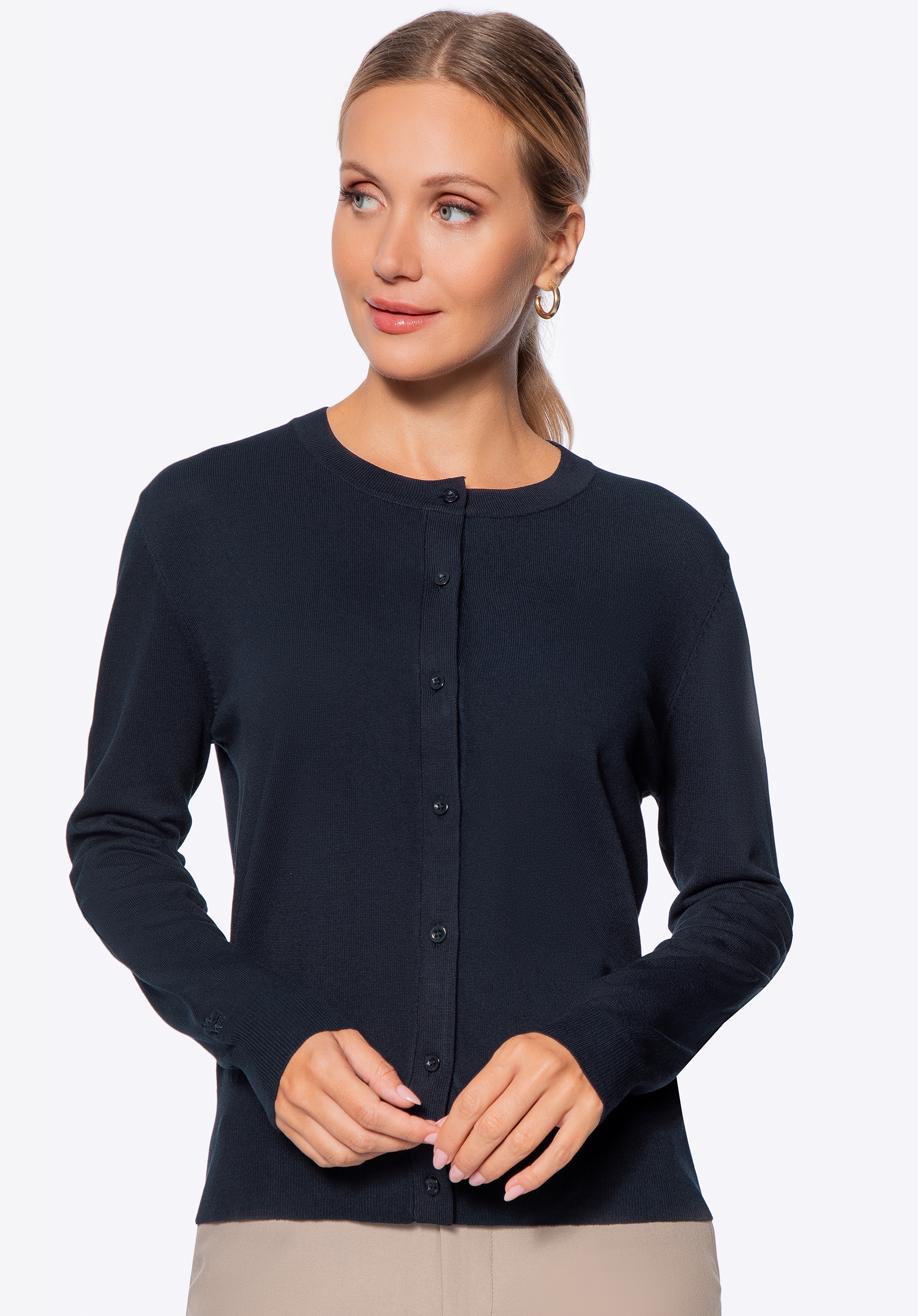 Tento kardigan v sebe spája mäkkosť a pohodlie, ktoré oceníte každý deň. Je vyrobený z jemnej zmesi viskózy a nylonu , takže ponúka úžasne ľahký a príjemný pocit. Zapínanie na gombíky po celej dĺžke vám umožňuje nosiť ho podľa vlastného uváženia – noste ho rozopnutý pre ležérny vzhľad alebo ho zapnite pre nádych elegancie. Okrúhly výstrih a dlhé rukávy s rebrovanými manžetami zdôrazňujú klasický, nadčasový charakter tohto kúska, vďaka čomu sa stane nepostrádateľným základným prvkom vášho šatníka.