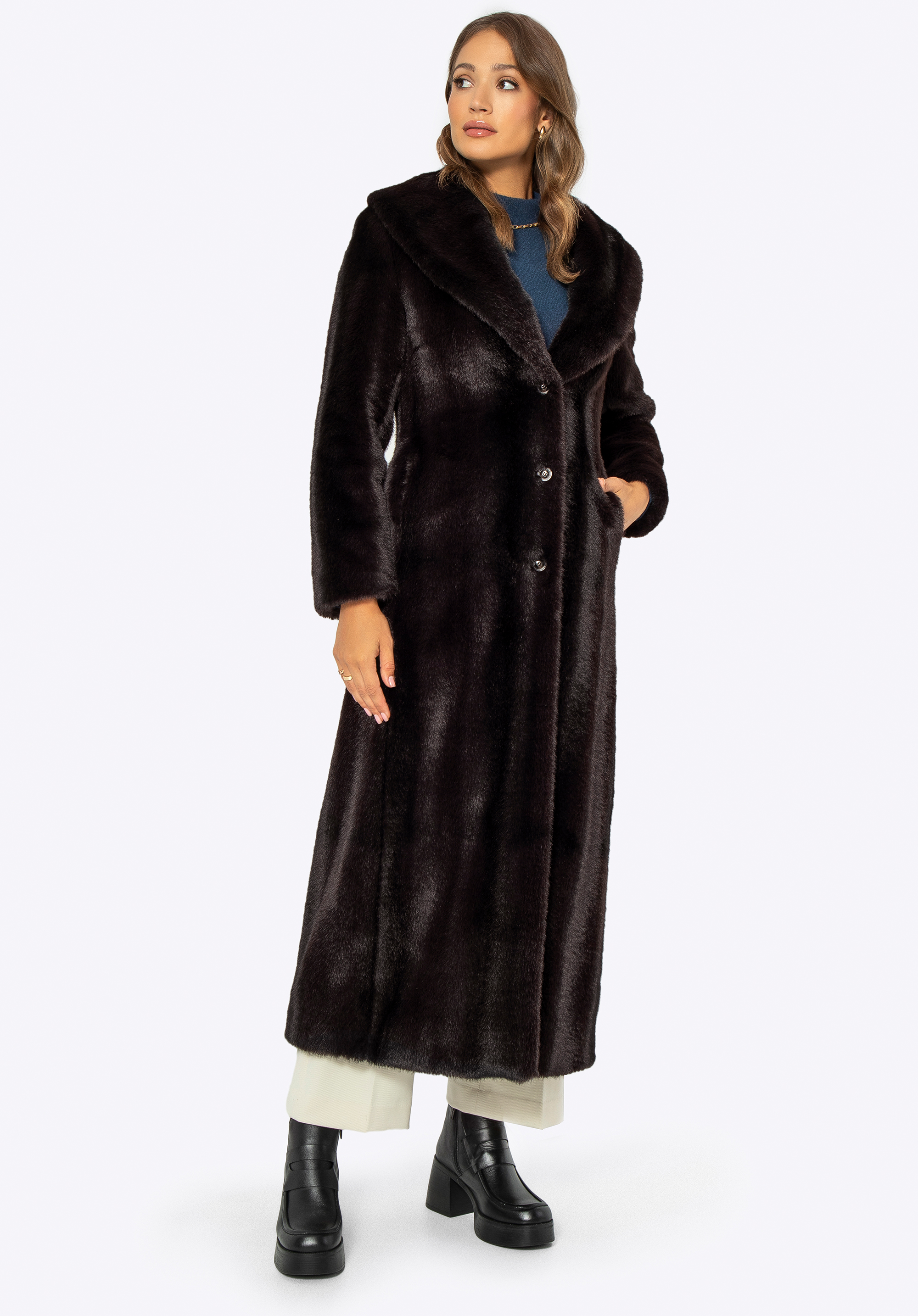 Doprajte si dotyk luxusu s naším hitom sezóny, dámskym kabátom vyrobeným z najkvalitnejšej umelej kožušiny. Dokonalá kombinácia klasiky a modernosti si určite získa srdcia a stane sa hviezdou vášho šatníka. Je nielen symbolom luxusu, ale aj zodpovedného prístupu k móde. Klasický, chlopňový golier dodáva šik a poskytuje ešte viac tepla a pohodlie. Dlhý strih kabátu zdôrazňuje eleganciu, ale zároveň účinne chráni pred chladom a poskytuje pocit sofistikovanosti a pohodlia v každej situácii. Praktické, dve hlboké vrecká v bočných švoch nielen dodajú štýl, ale tiež vám umožnia uložiť základné predmety. Dokonalé spracovanie a vysoká kvalita použitých materiálov sú zárukou, že tento kabát vás bude sprevádzať dlhé roky a zabezpečí nielen jedinečný vzhľad, ale aj ekologickú spokojnosť.