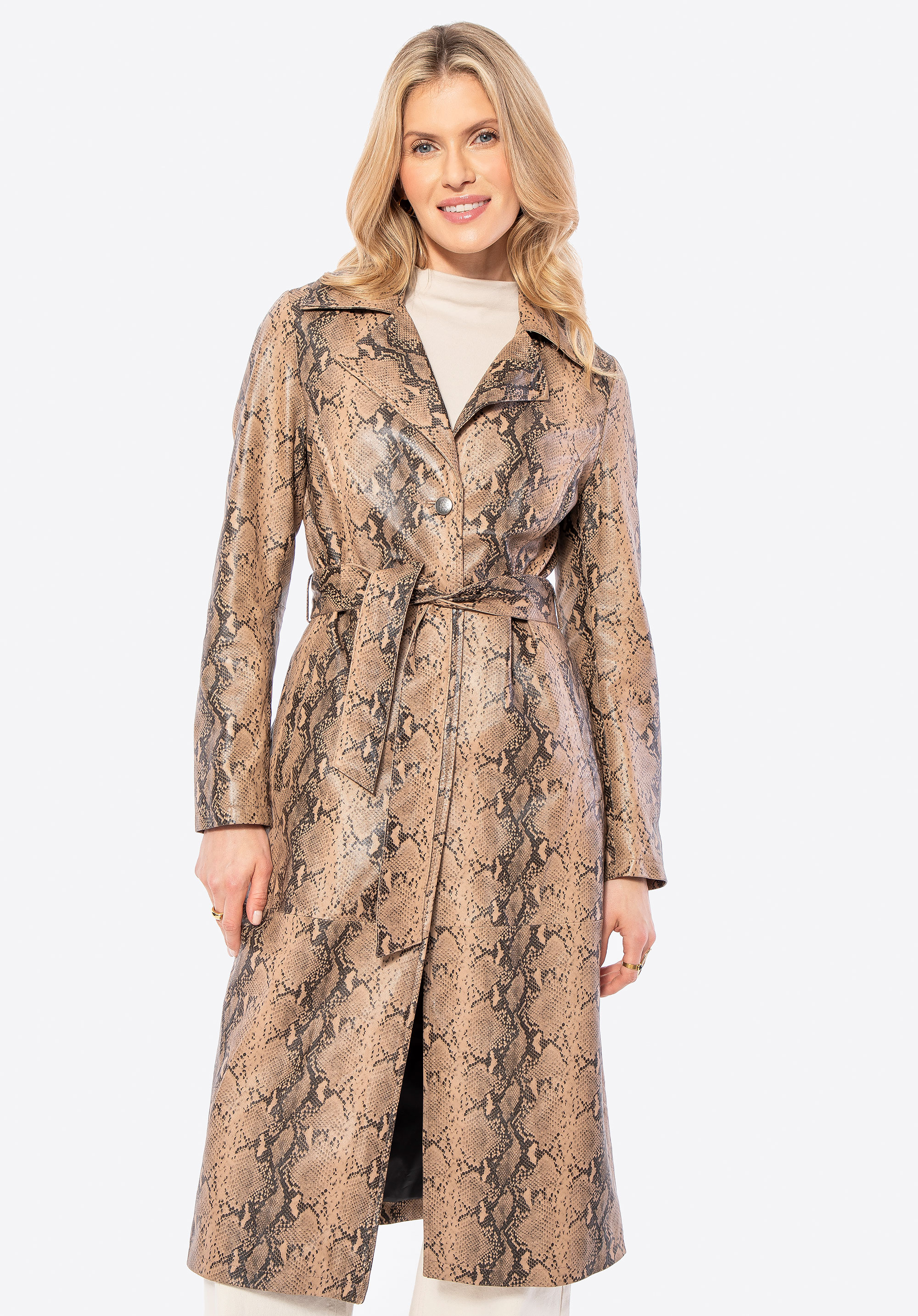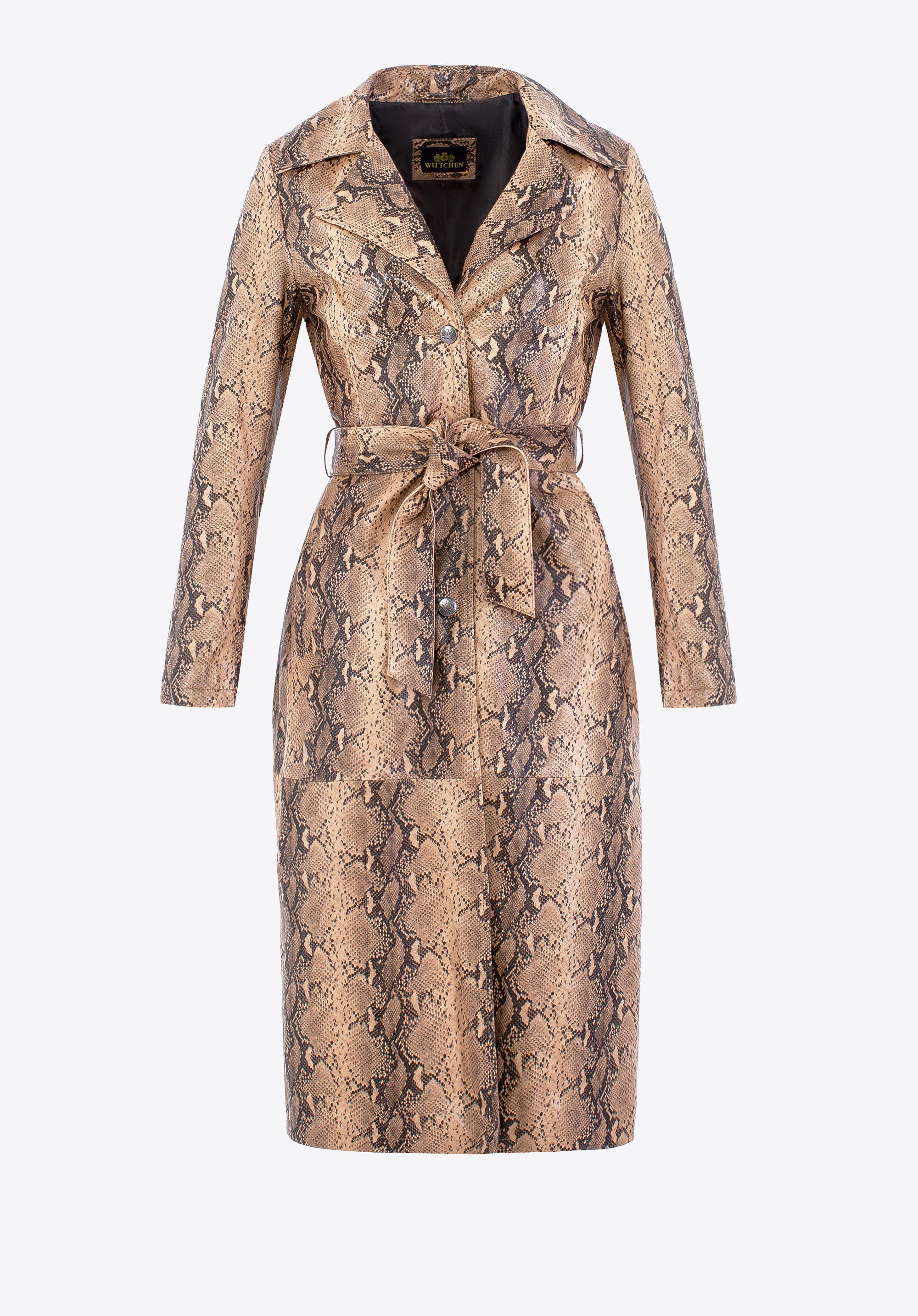 Dodajte svojmu šatníku nádych výraznej sofistikovanosti s týmto koženým kabátom vyrobeným z prémiovej kože s módnou hadou potlačou . Tento štýlový kabát sa vyznačuje lichotivým strihom a výrazným vzorom. Značkové gombíky a klasický golier dodávajú každému outfitu nádych elegancie.
