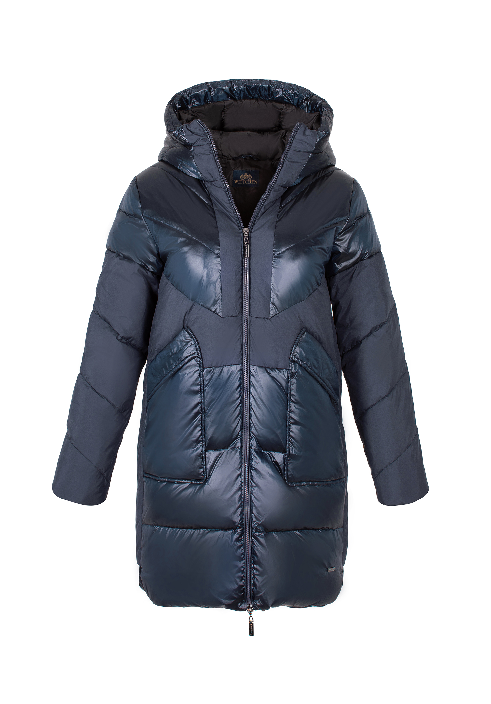 Dámsky páperový kabát s kapucňou z kombinovaných materiálov tmavomodrý