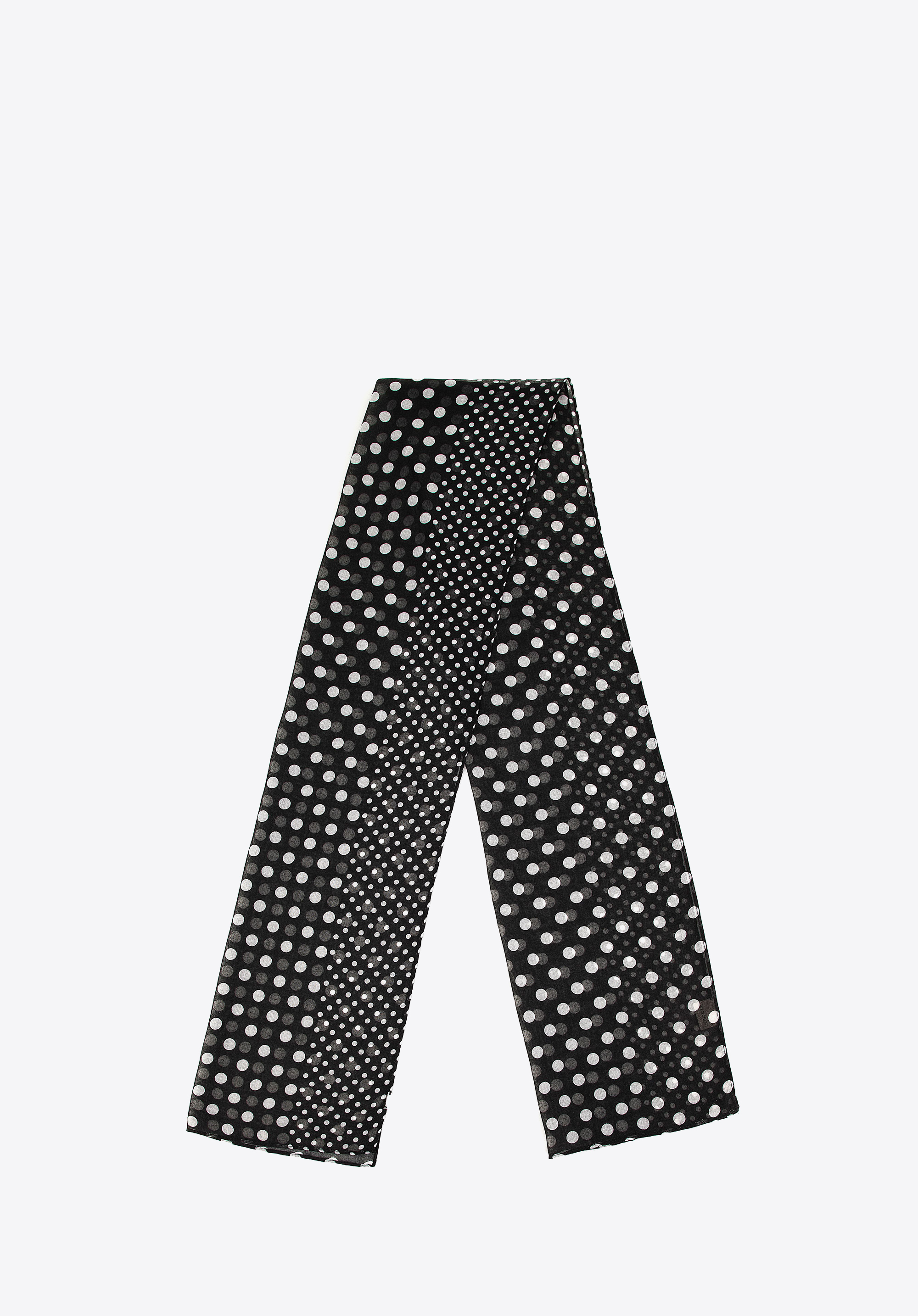 Bodkovaný šál možno nosiť rôznymi spôsobmi - voľne splývajúci okolo krku, ako aj jemne uviazaný.