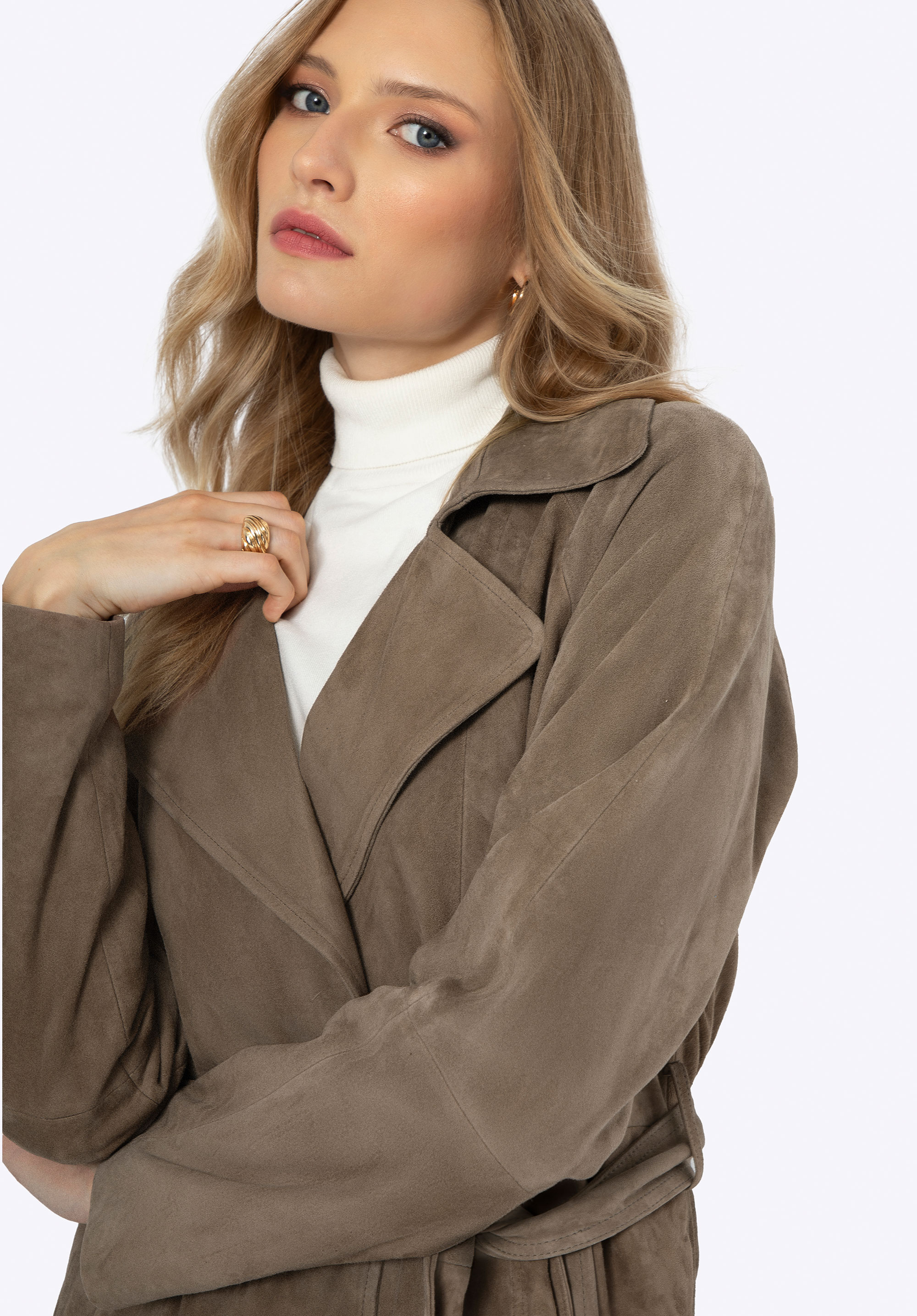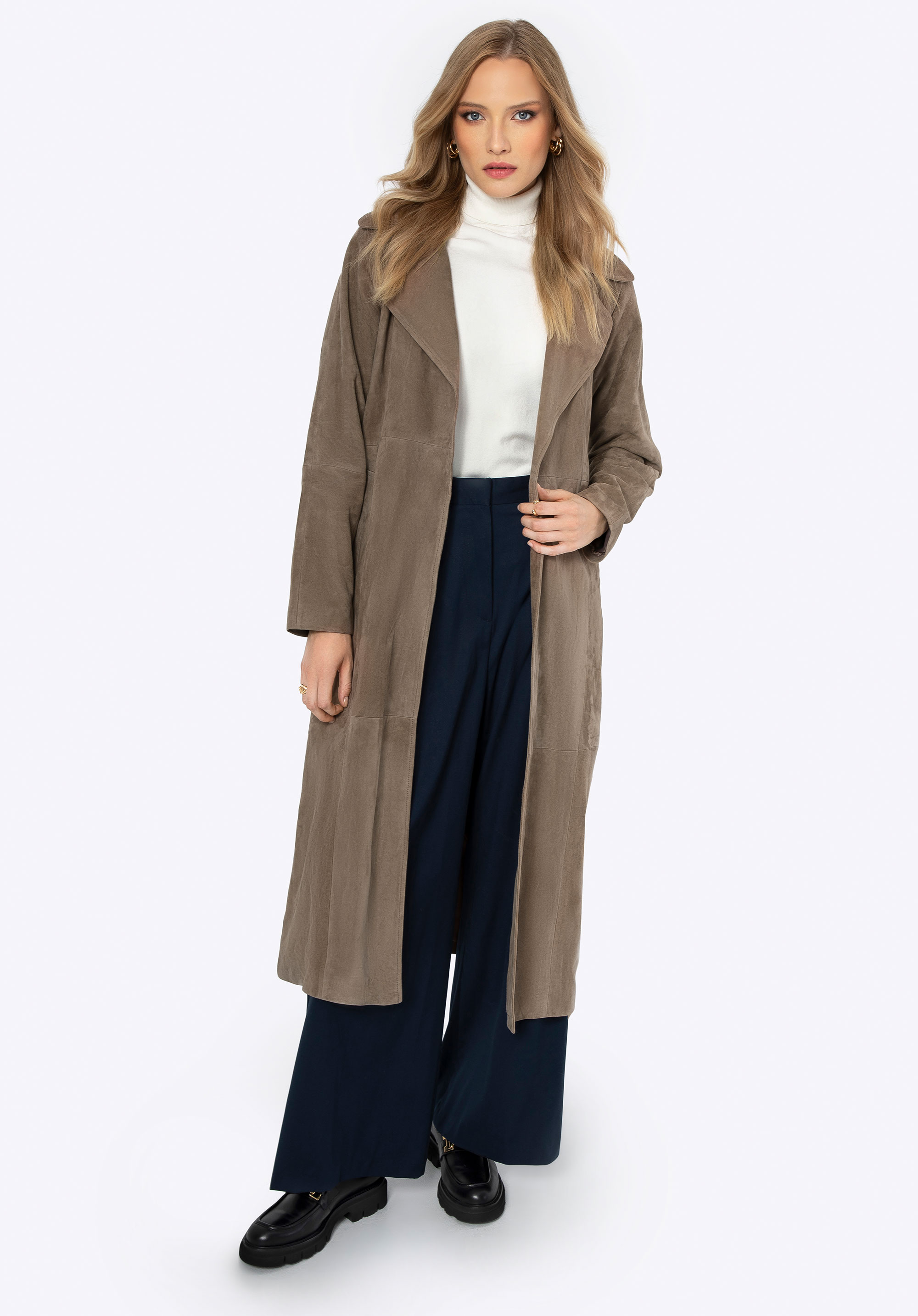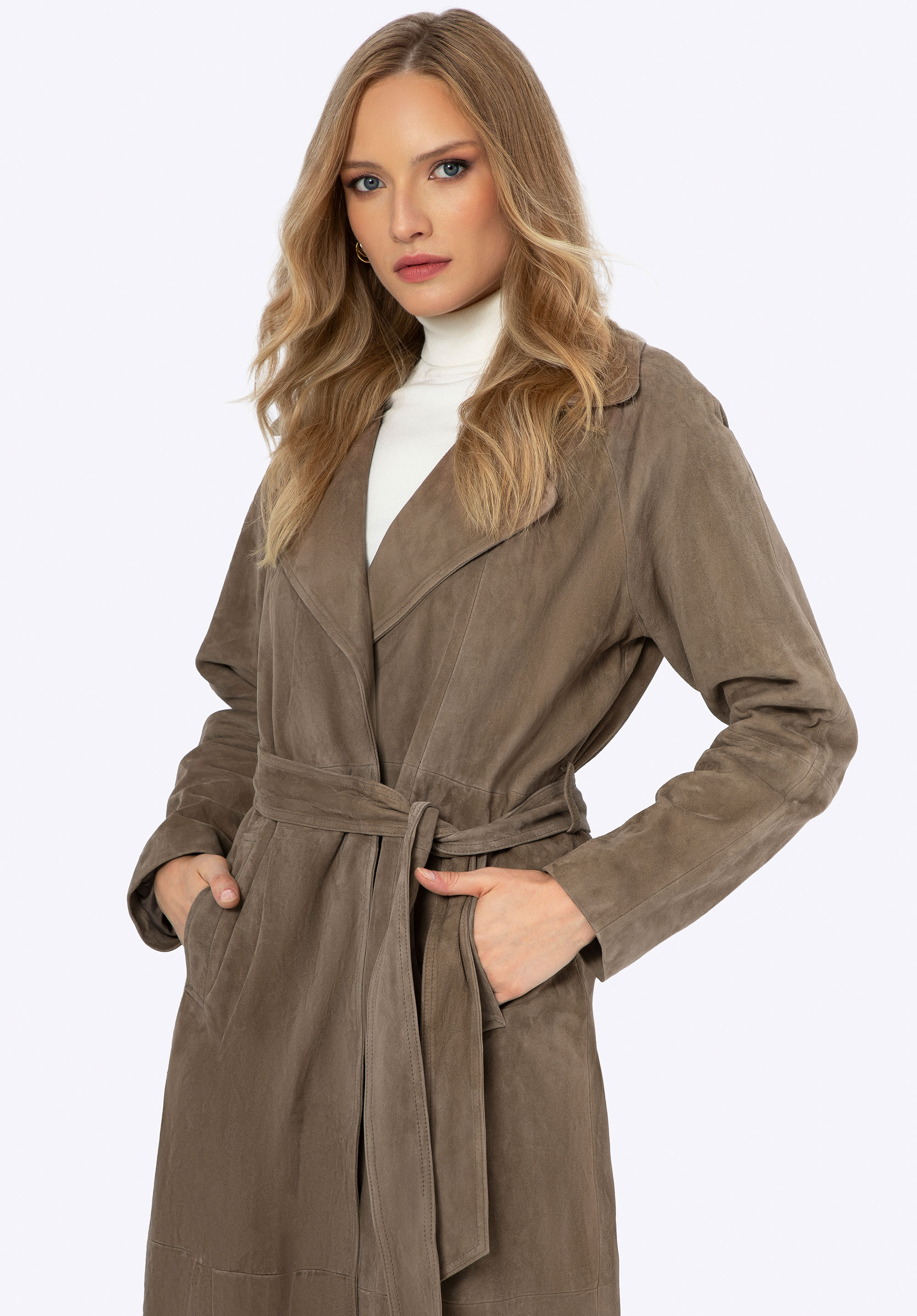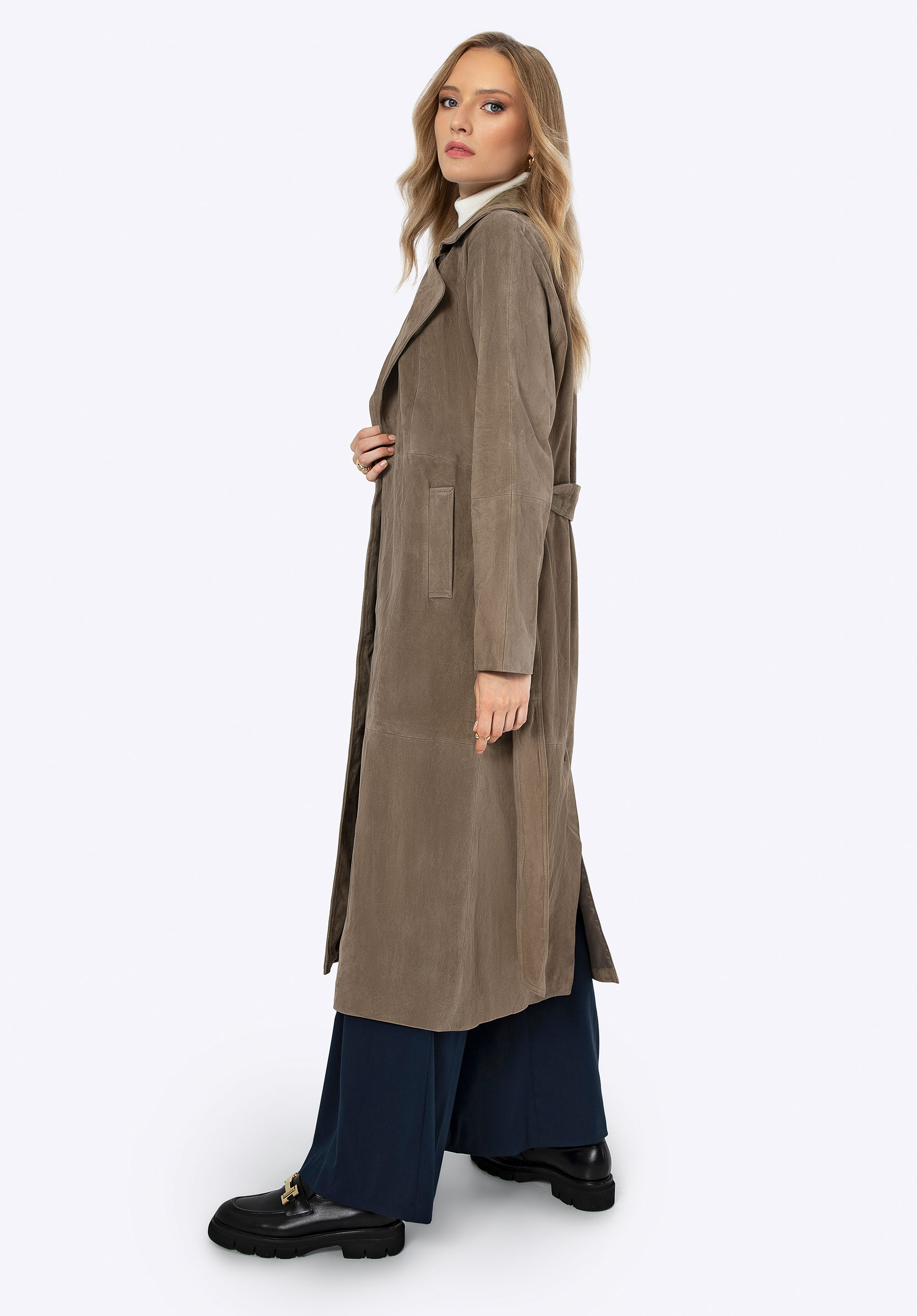 Objavte náš jedinečný kabát vyrobený z najkvalitnejšej prírodnej kože. Je esenciou klasiky s moderným nádychom, ktorá dodá eleganciu každému vášmu outfitu. Kabát má jednoduchý strih, ktorý vo svojom minimalizme vyžaruje eleganciu, ideálny pre vkusné každodenné kombinácie aj pre špeciálne príležitosti. Tento kabát je nielen štýlový, ale vďaka opasku v páse dokonale tiež zvýrazní vašu siluetu. Chlopňový golier dodáva kabátu klasickú eleganciu, zatiaľ čo dve hlboké vrecká poskytujú priestor na drobnosti, ktoré potrebujete mať vždy po ruke. Okrem toho vďaka rozparku so záložkou vzadu je kabát mimoriadne pohodlný a voľný pri nosení.