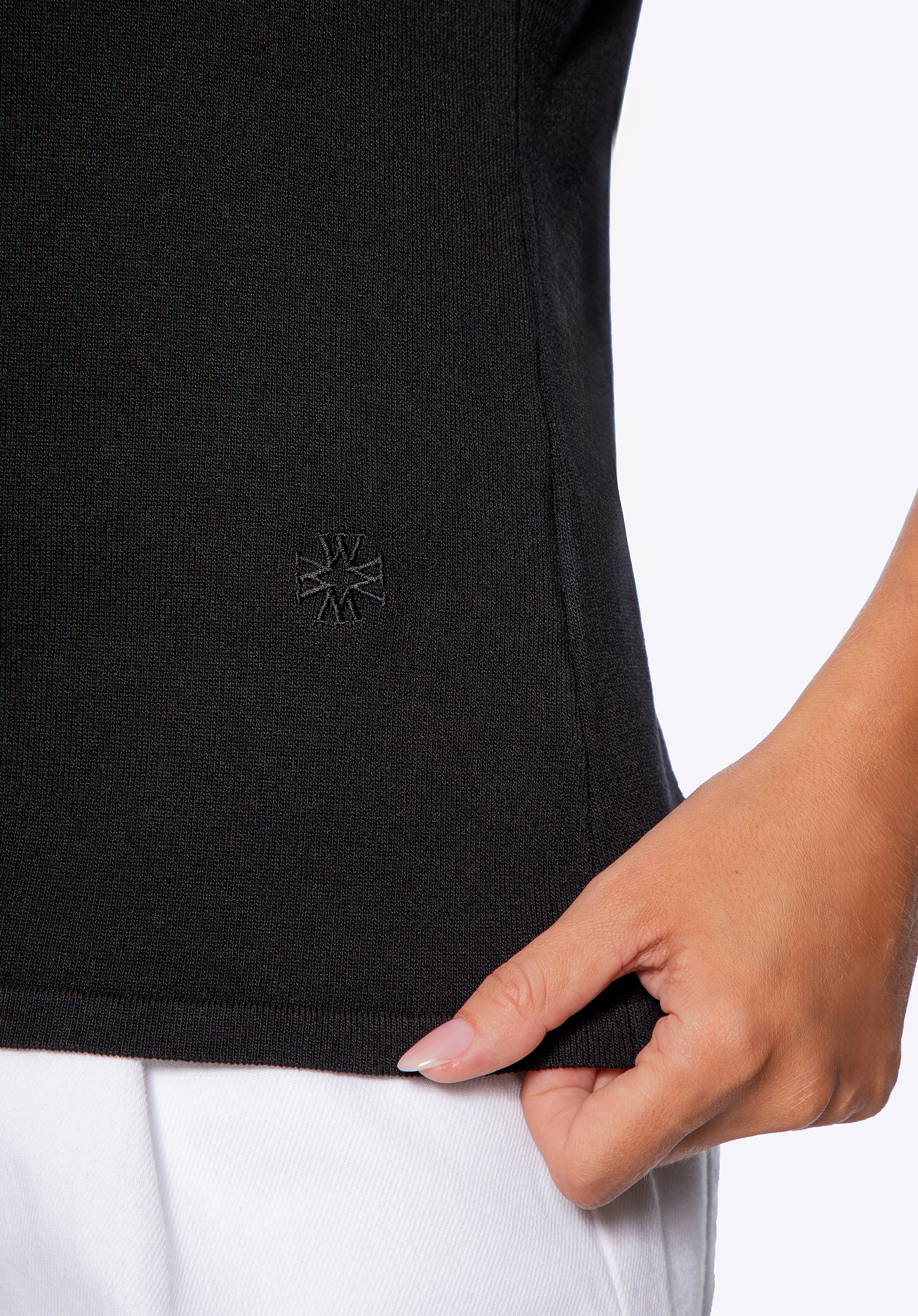 Tento sveter je dokonalou zmesou ľahkosti a decentnej elegancie. Jemná zmes viskózy a nylonu jemne obopína vašu pokožku a zaisťuje celodenné pohodlie. Krátke rukávy s rafinovaným povrchom dodávajú nádych elegancie, zatiaľ čo rebrovaný výstrih krásne orámuje krk. Jemne priliehavý strih poskytuje voľnosť a voľnosť pohybu a vyšívané logo v dolnom rohu dotvára vzhľad štýlovým a decentným akcentom.